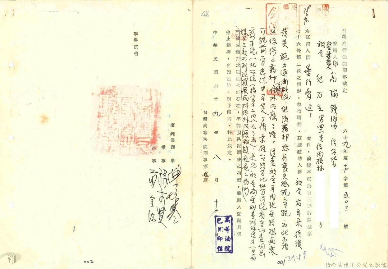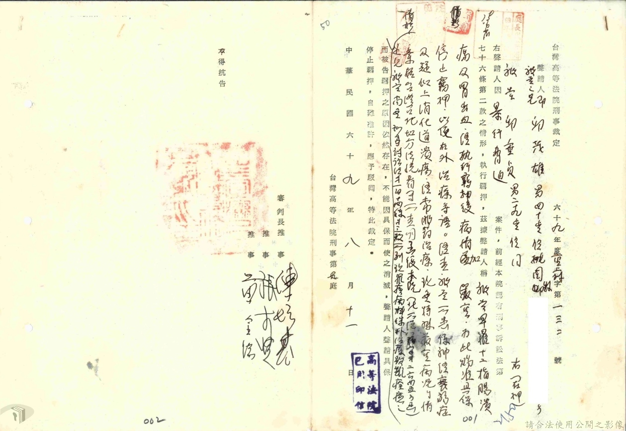 本案為69年間,民眾因為暴行脅迫案件的關係由臺灣高等法院執行羈押,當事人後因為右耳持續發炎、十二指腸潰瘍等疾病聲請保外就醫,經臺灣高院審核後認為還沒有刑事訴訟法中「現罹疾病非保外就醫顯難痊癒」的情形,因此裁定聲請駁回。