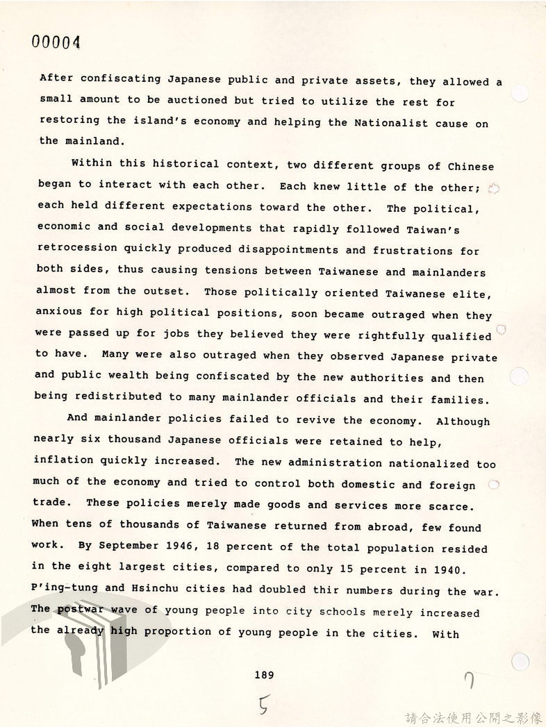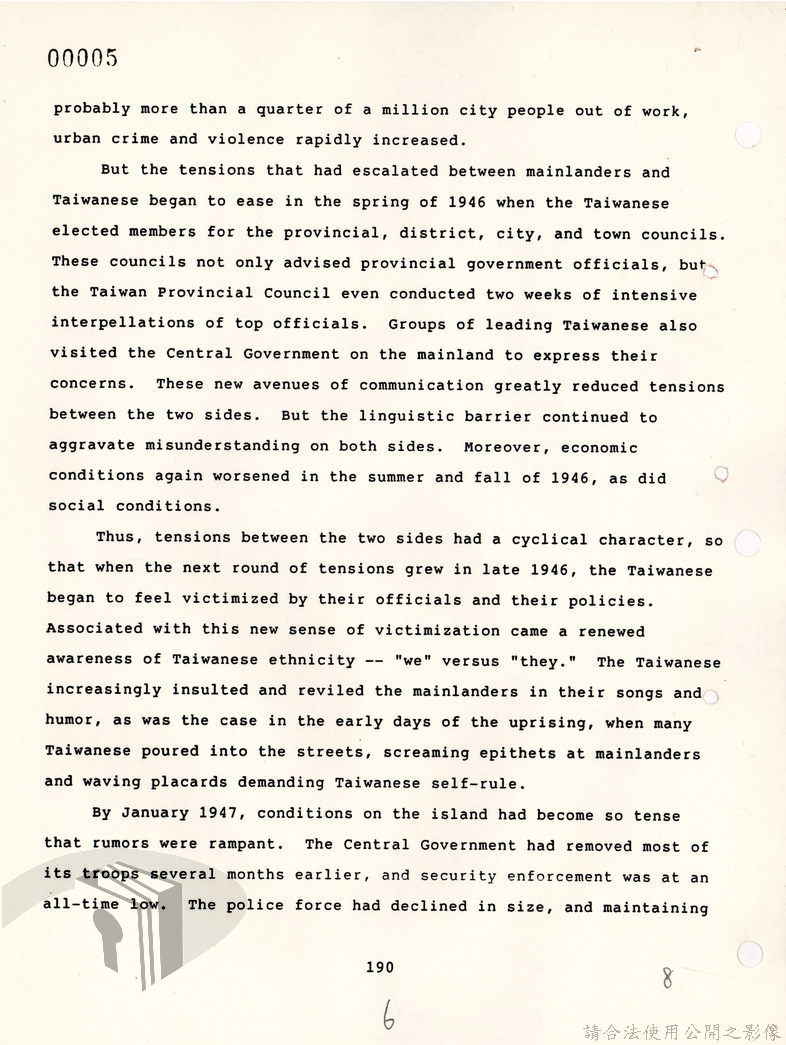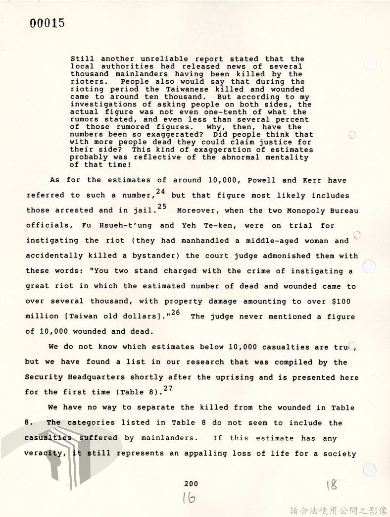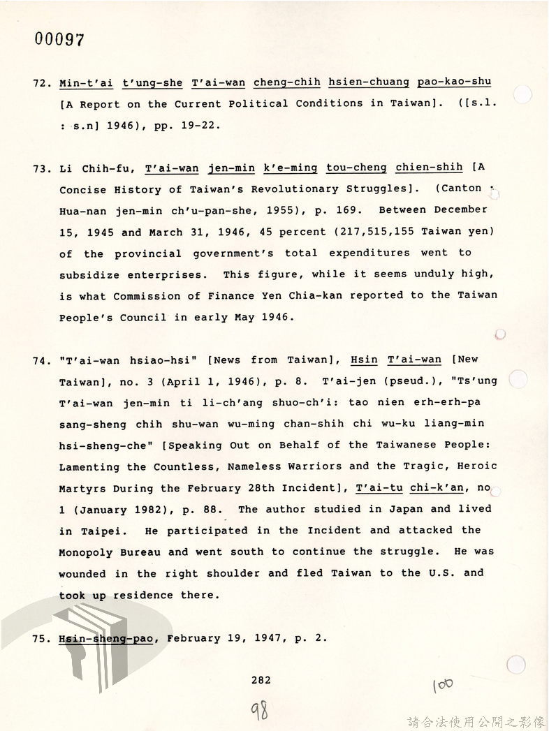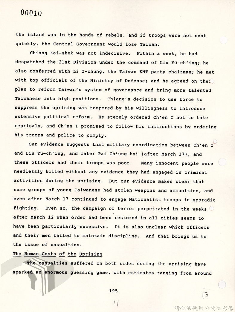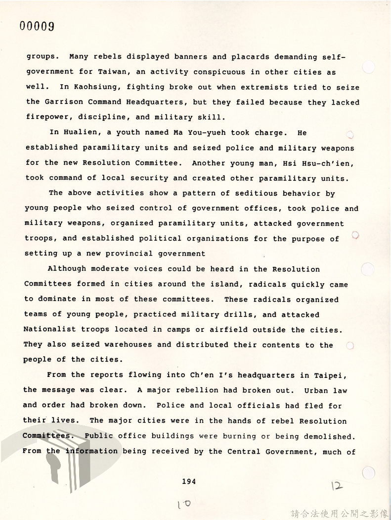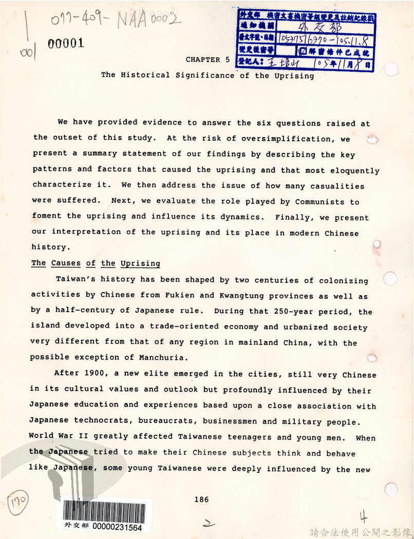 本案為77年間,臺灣二二八事件的英文相關研究書稿,內容包括有:胡佛戰爭、革命與和平研究所的馬若孟博士與我國賴澤涵學者、魏萼學者合著的「悲劇性的開端,臺灣二二八事件的研究」第5章書稿內容及索引、參考書目等書稿資料。