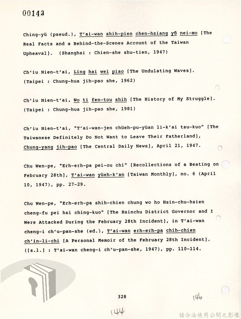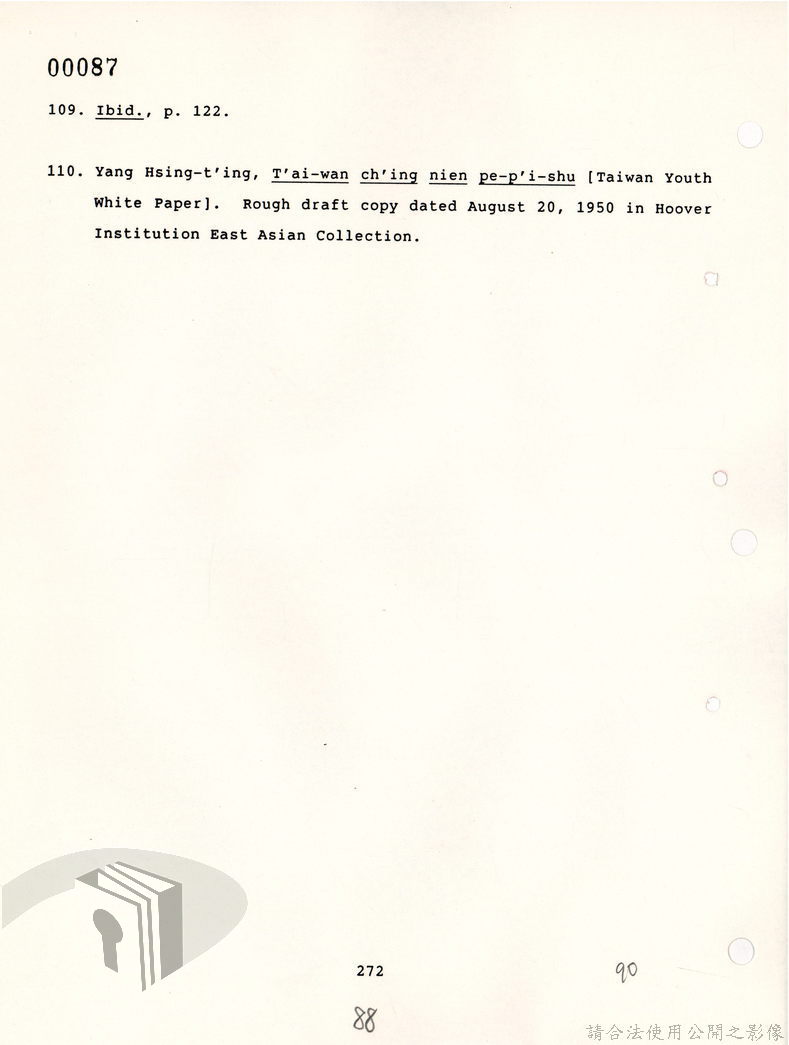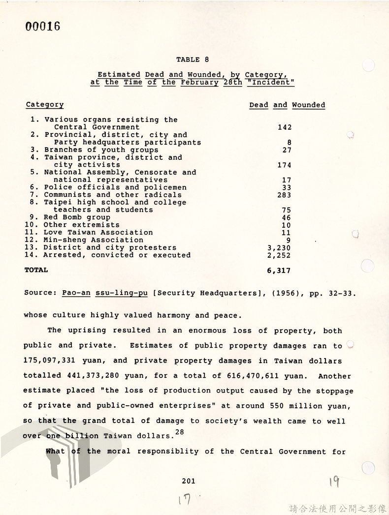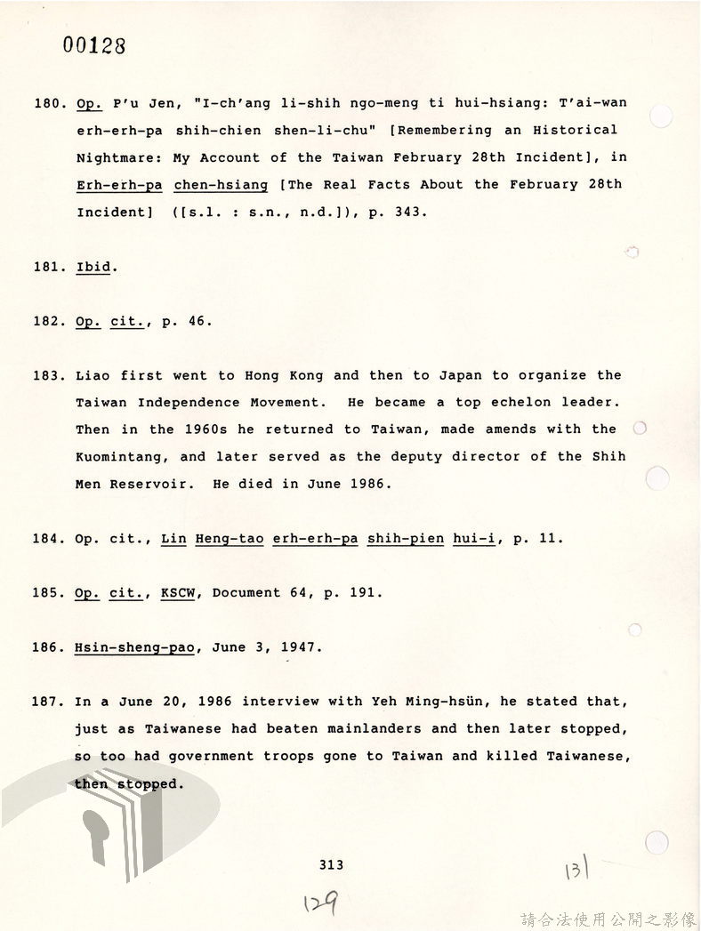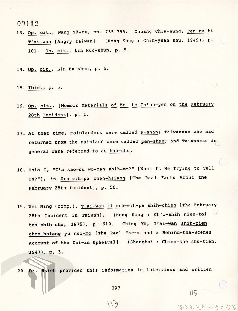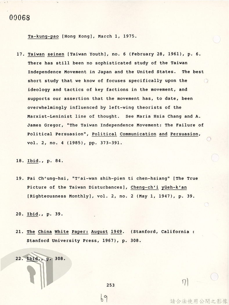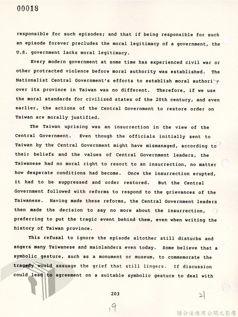 本案為77年間,臺灣二二八事件的英文相關研究書稿,內容包括有:胡佛戰爭、革命與和平研究所的馬若孟博士與我國賴澤涵學者、魏萼學者合著的「悲劇性的開端,臺灣二二八事件的研究」第5章書稿內容及索引、參考書目等書稿資料。