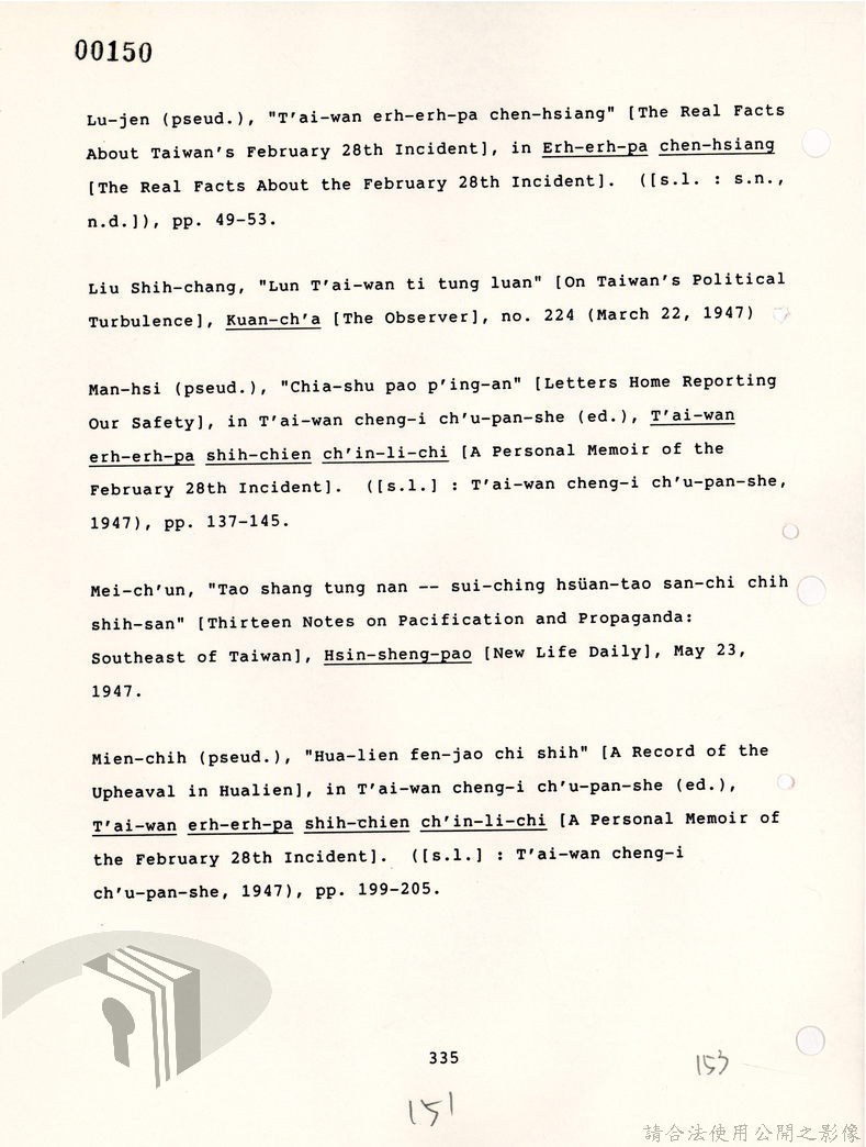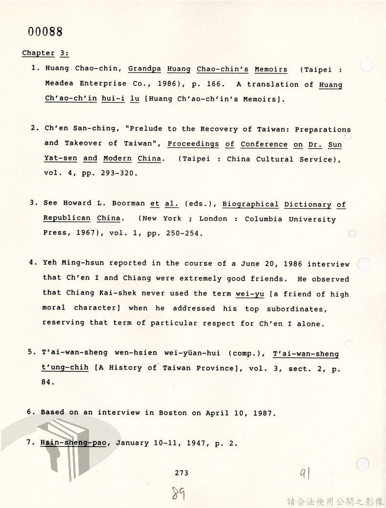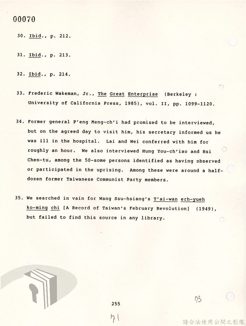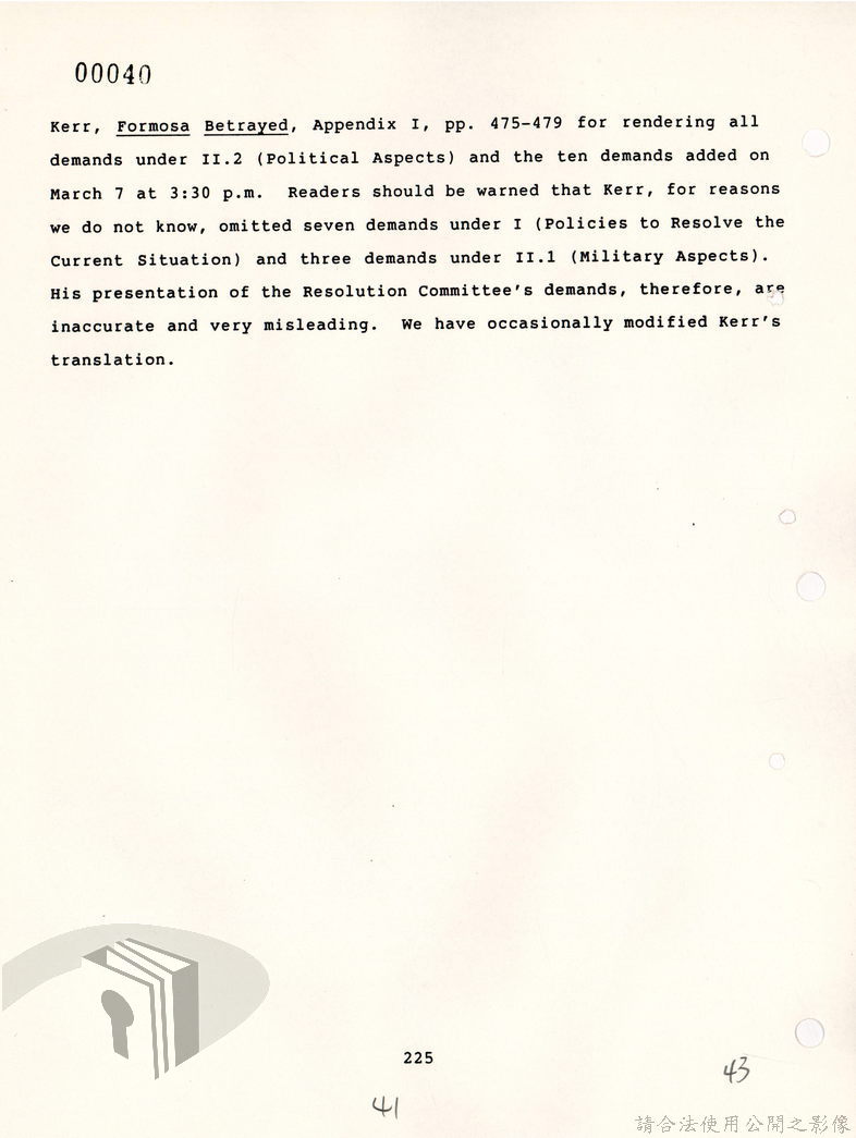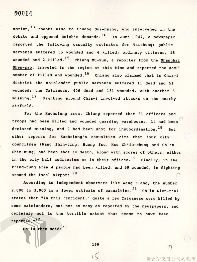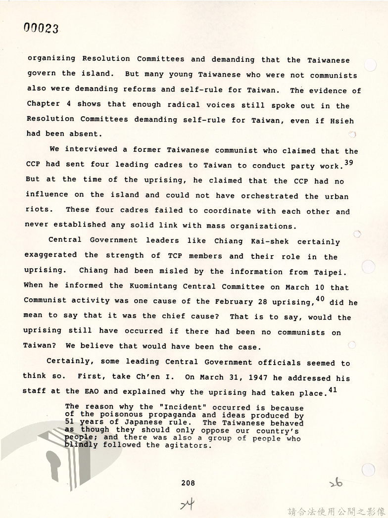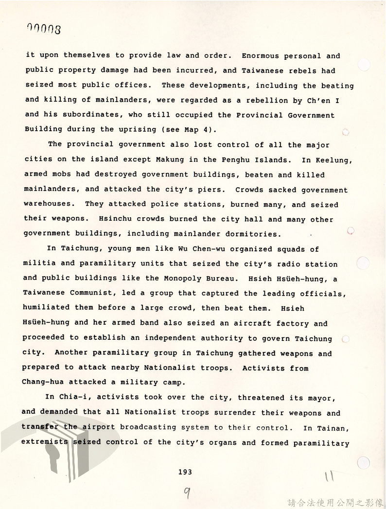本案為77年間,臺灣二二八事件的英文相關研究書稿,內容包括有:胡佛戰爭、革命與和平研究所的馬若孟博士與我國賴澤涵學者、魏萼學者合著的「悲劇性的開端,臺灣二二八事件的研究」第5章書稿內容及索引、參考書目等書稿資料。