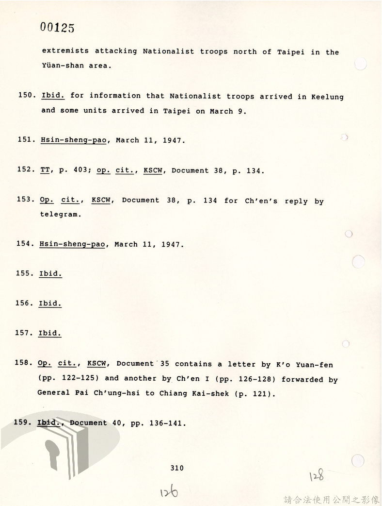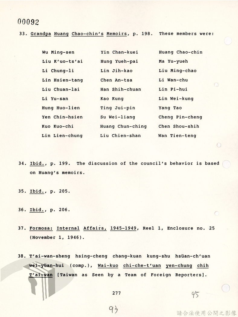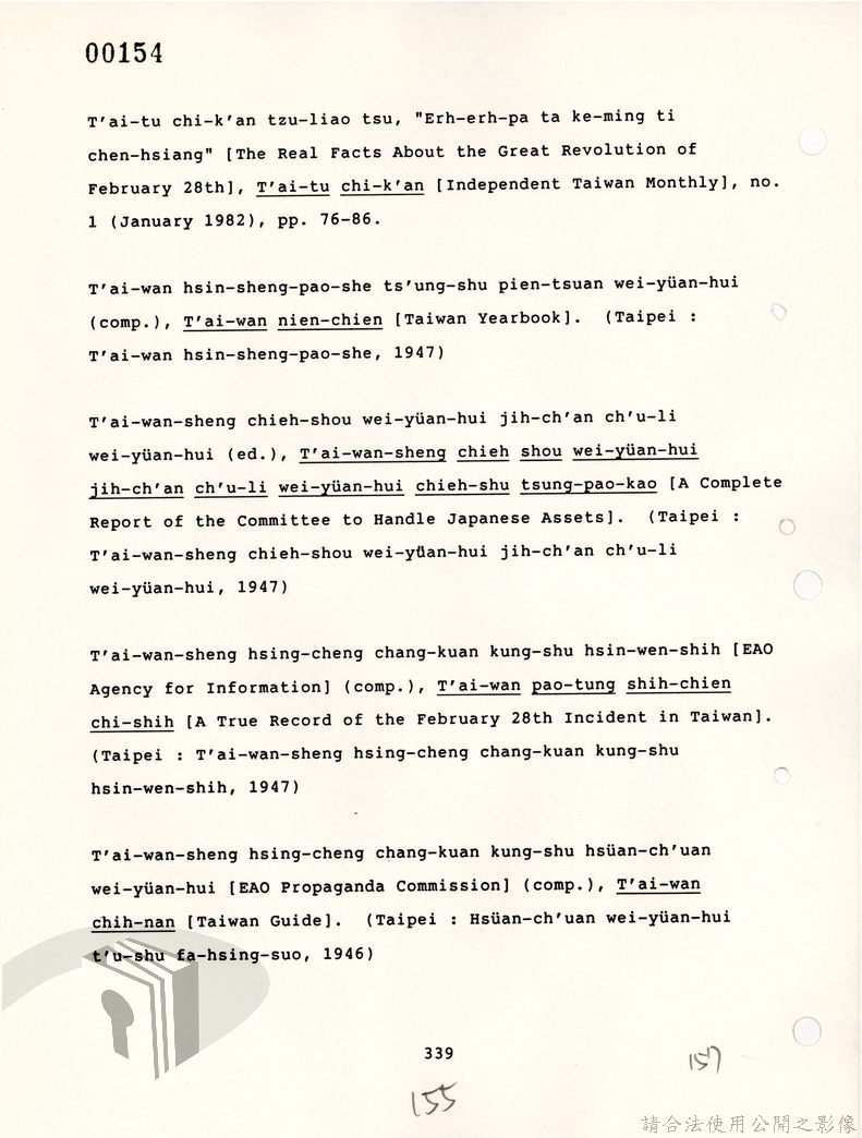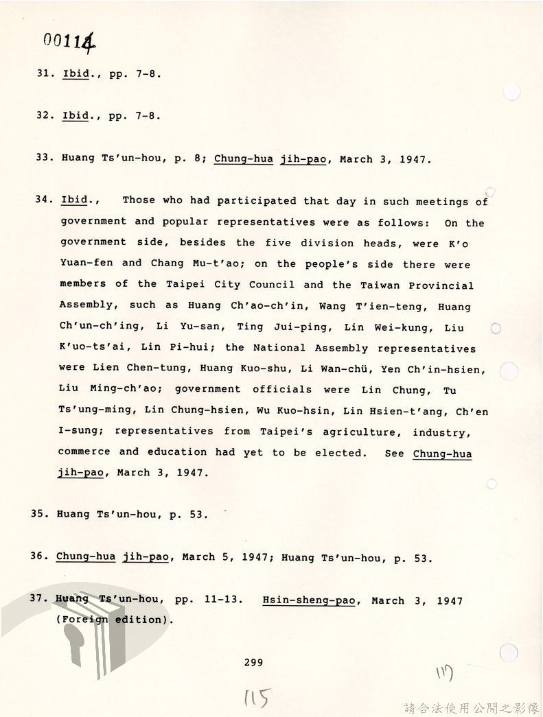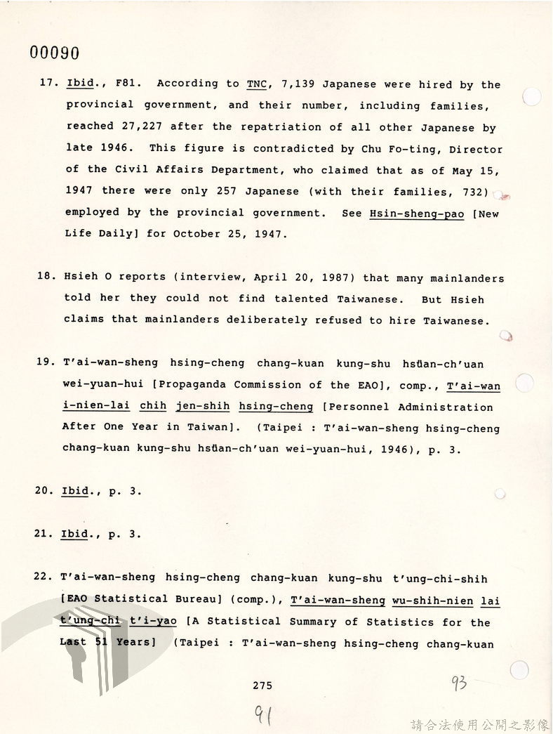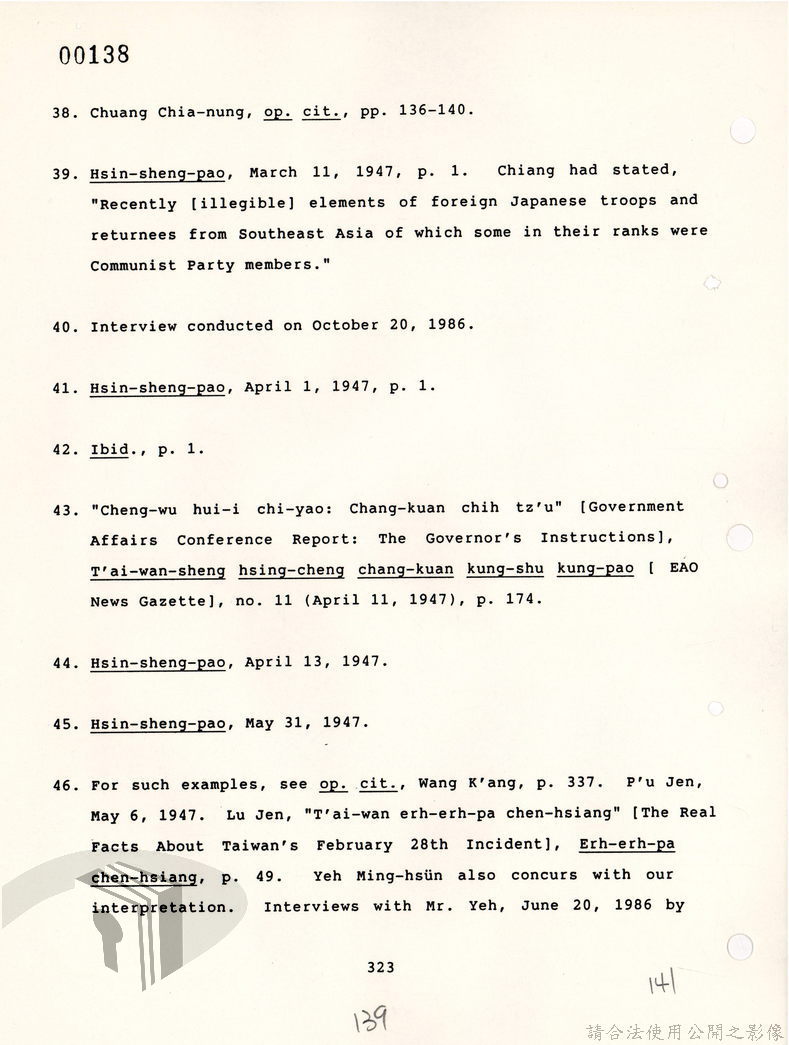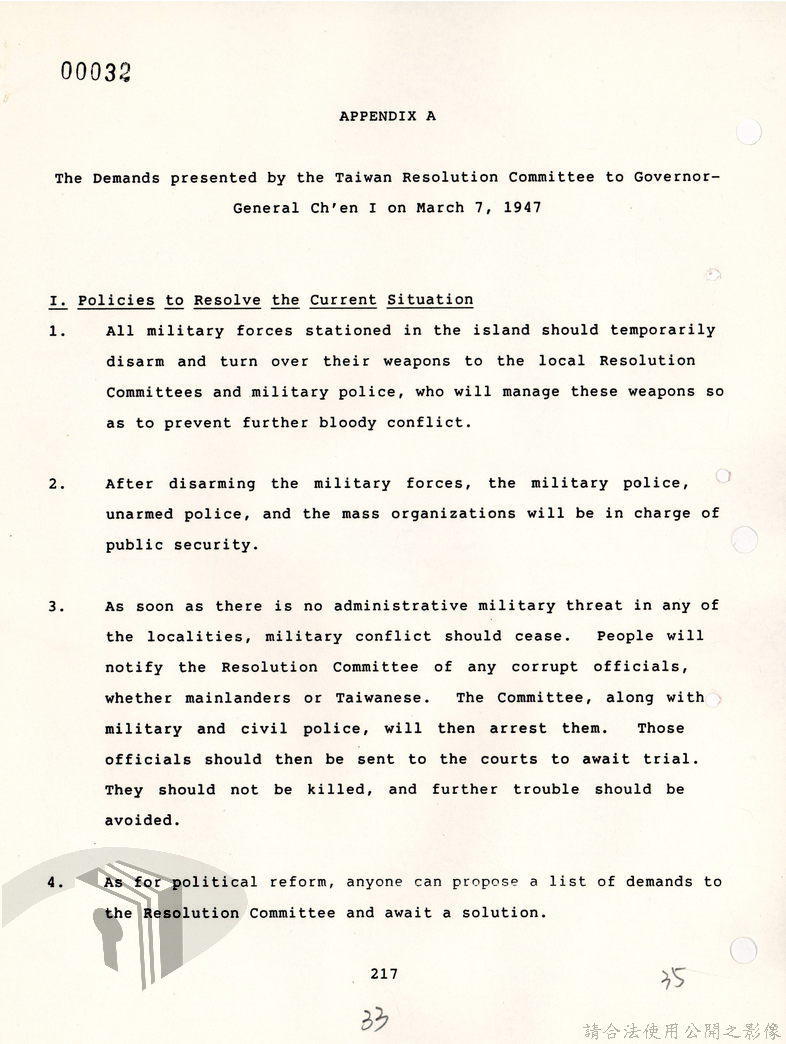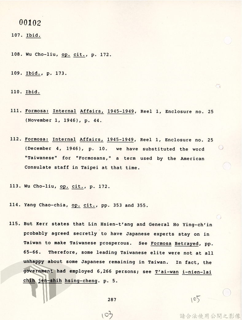本案為77年間,臺灣二二八事件的英文相關研究書稿,內容包括有:胡佛戰爭、革命與和平研究所的馬若孟博士與我國賴澤涵學者、魏萼學者合著的「悲劇性的開端,臺灣二二八事件的研究」第5章書稿內容及索引、參考書目等書稿資料。