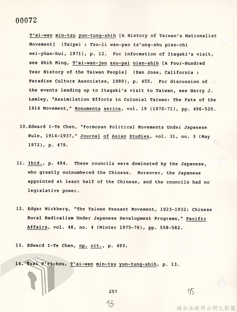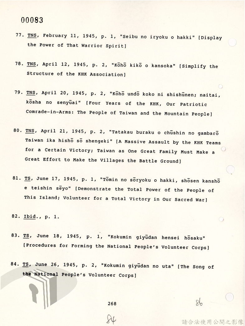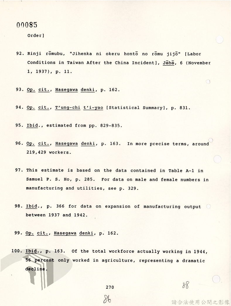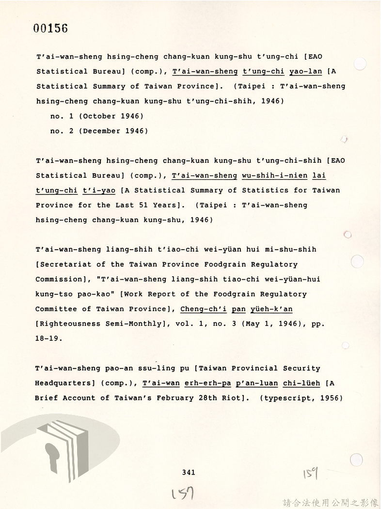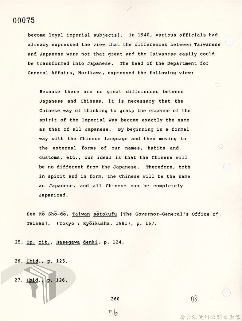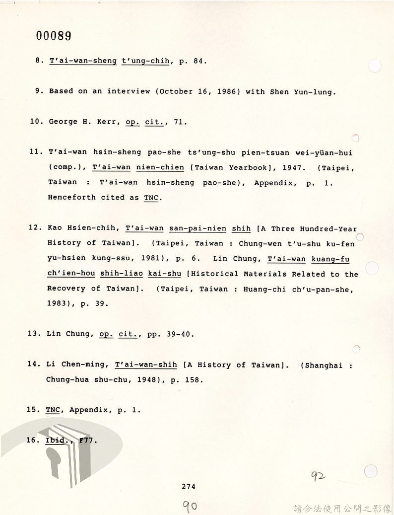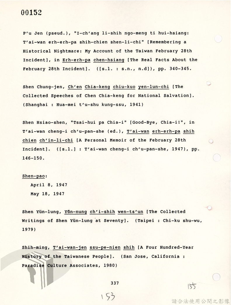 本案為77年間,臺灣二二八事件的英文相關研究書稿,內容包括有:胡佛戰爭、革命與和平研究所的馬若孟博士與我國賴澤涵學者、魏萼學者合著的「悲劇性的開端,臺灣二二八事件的研究」第5章書稿內容及索引、參考書目等書稿資料。