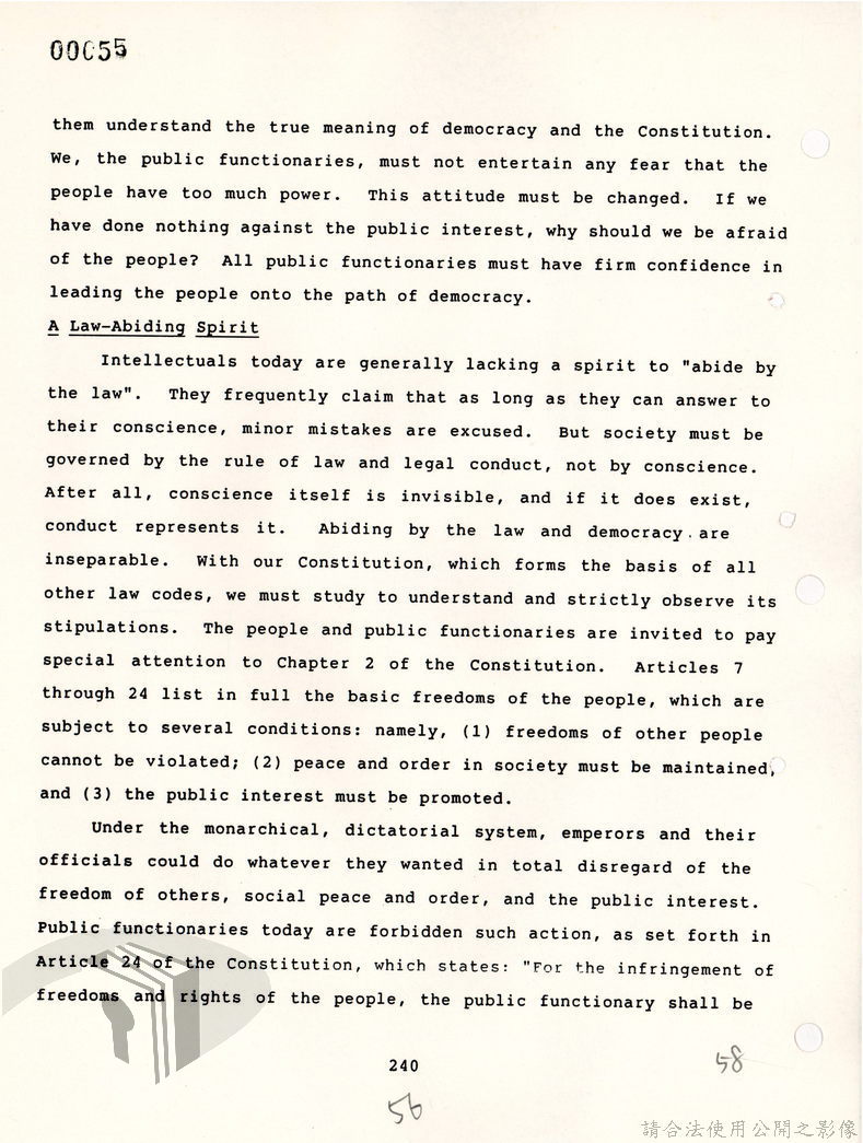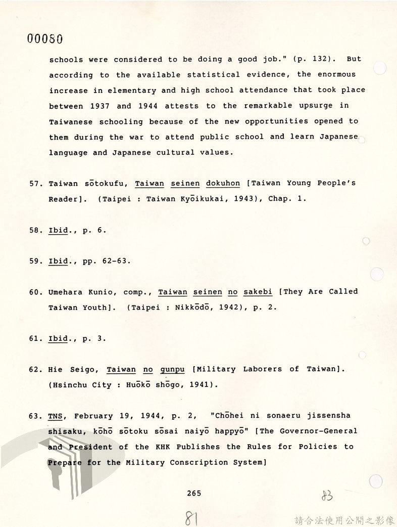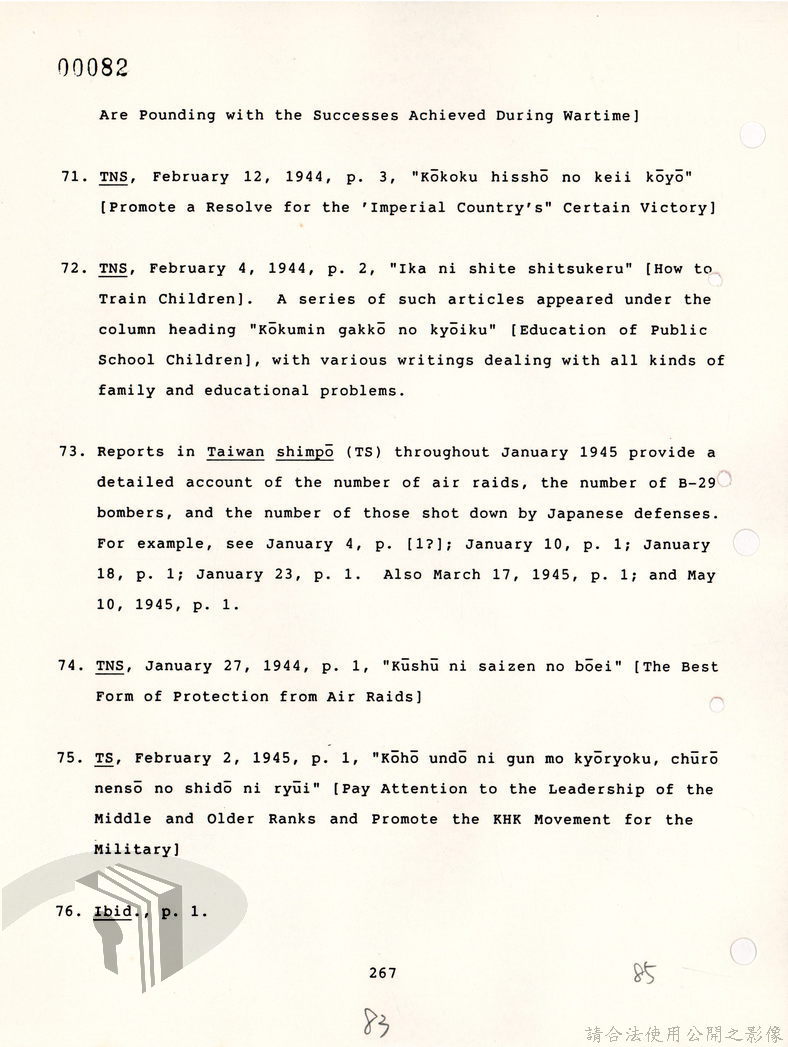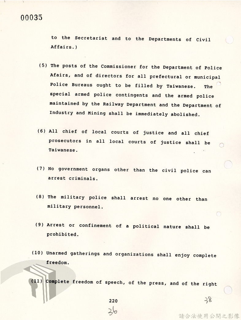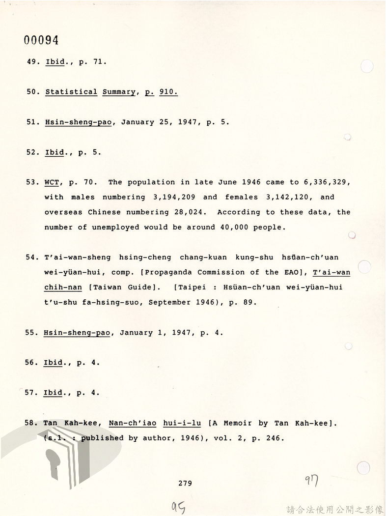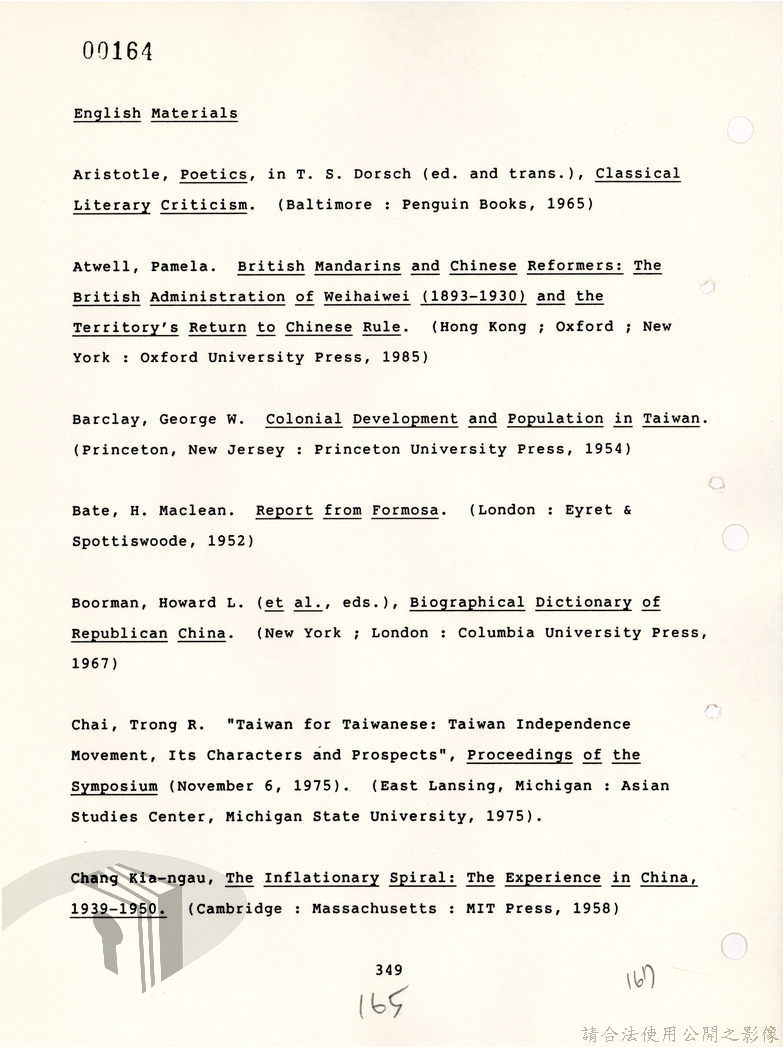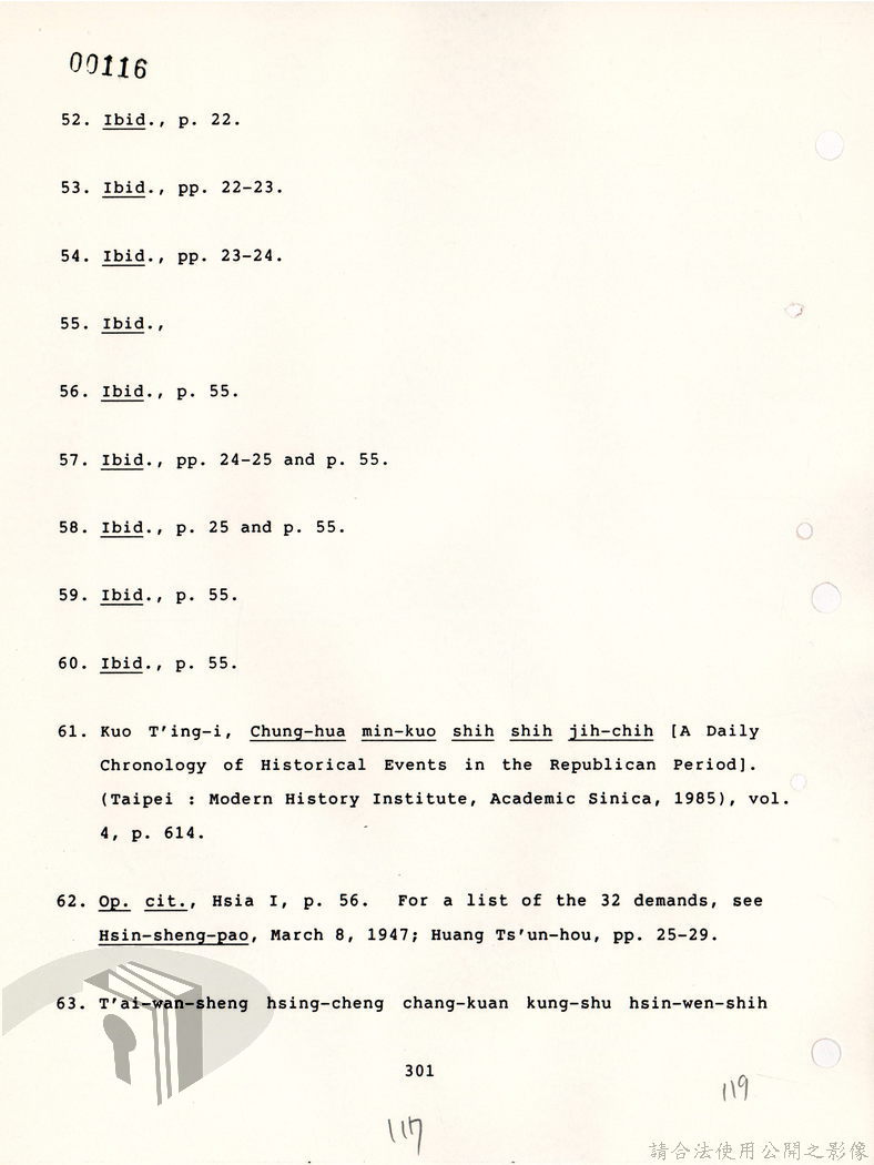 本案為77年間,臺灣二二八事件的英文相關研究書稿,內容包括有:胡佛戰爭、革命與和平研究所的馬若孟博士與我國賴澤涵學者、魏萼學者合著的「悲劇性的開端,臺灣二二八事件的研究」第5章書稿內容及索引、參考書目等書稿資料。