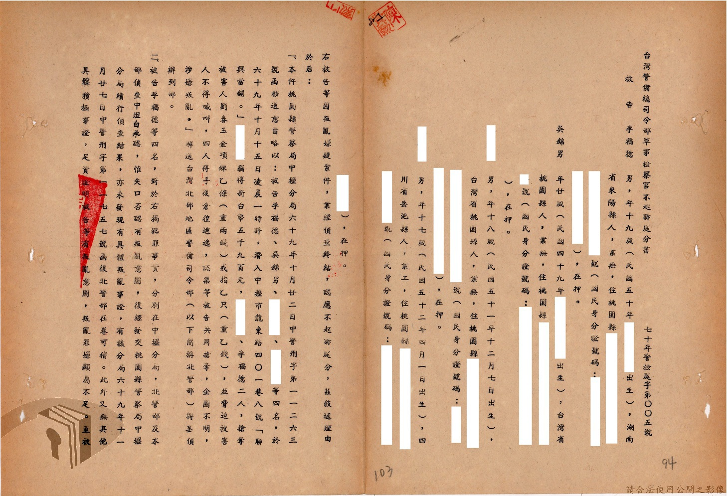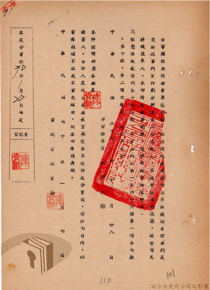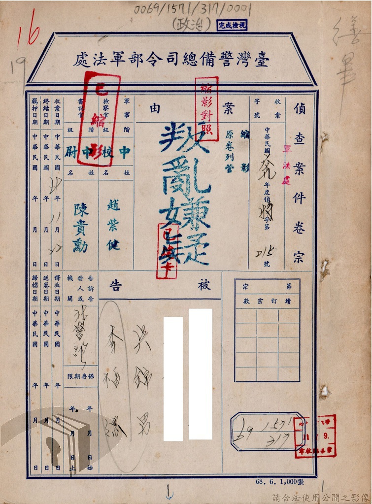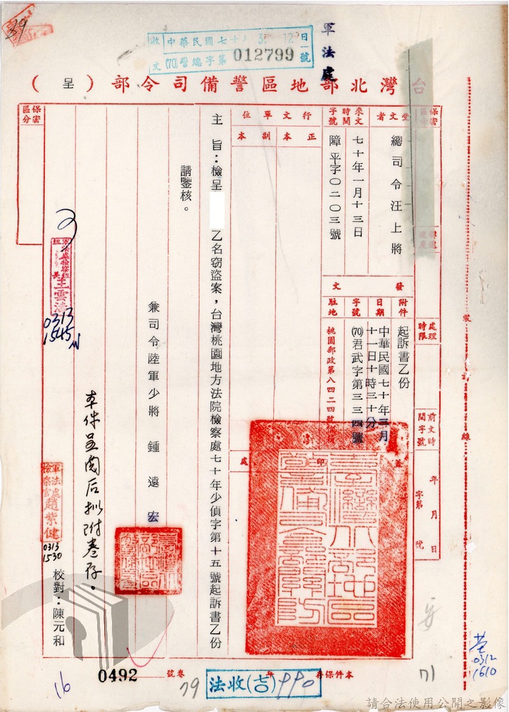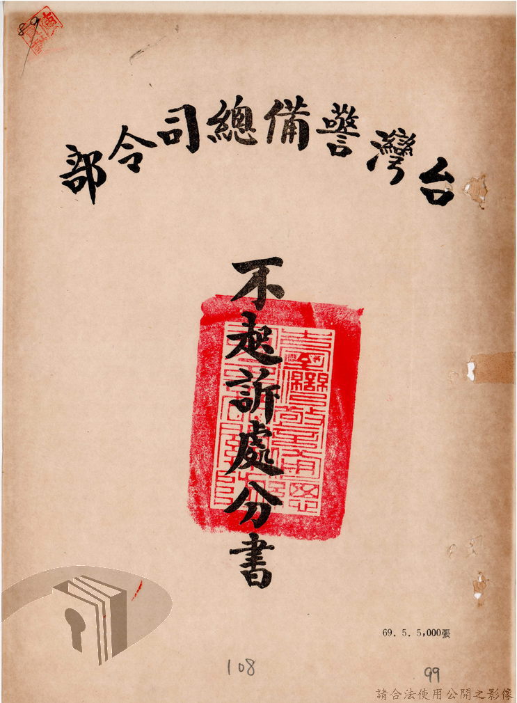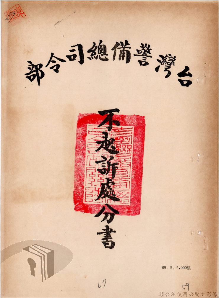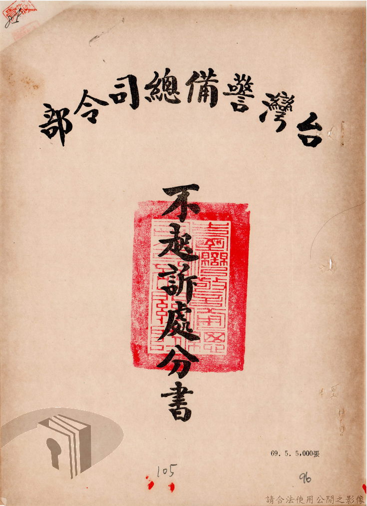 本案為69至70年間,臺灣北部地區警備司令部陳送民眾涉案偵查資料給臺灣警備總司令部,後經警總偵查終結,予以不起訴處分,因被告另涉及刑事案件部分,北警部將其移送臺灣桃園地方法院檢察處偵辦。附偵訊筆錄、不起訴處分書等文件資料。