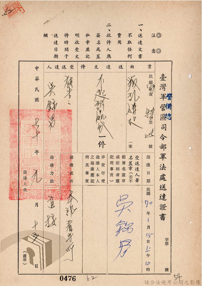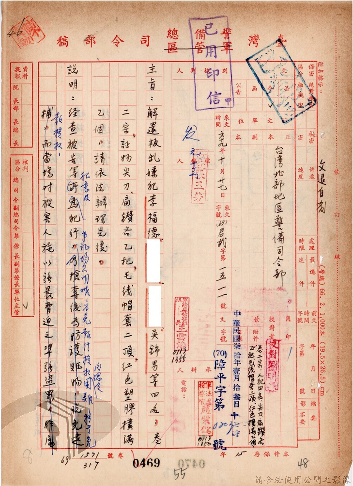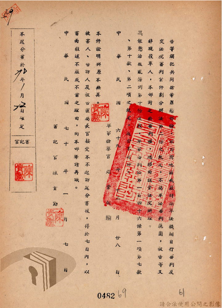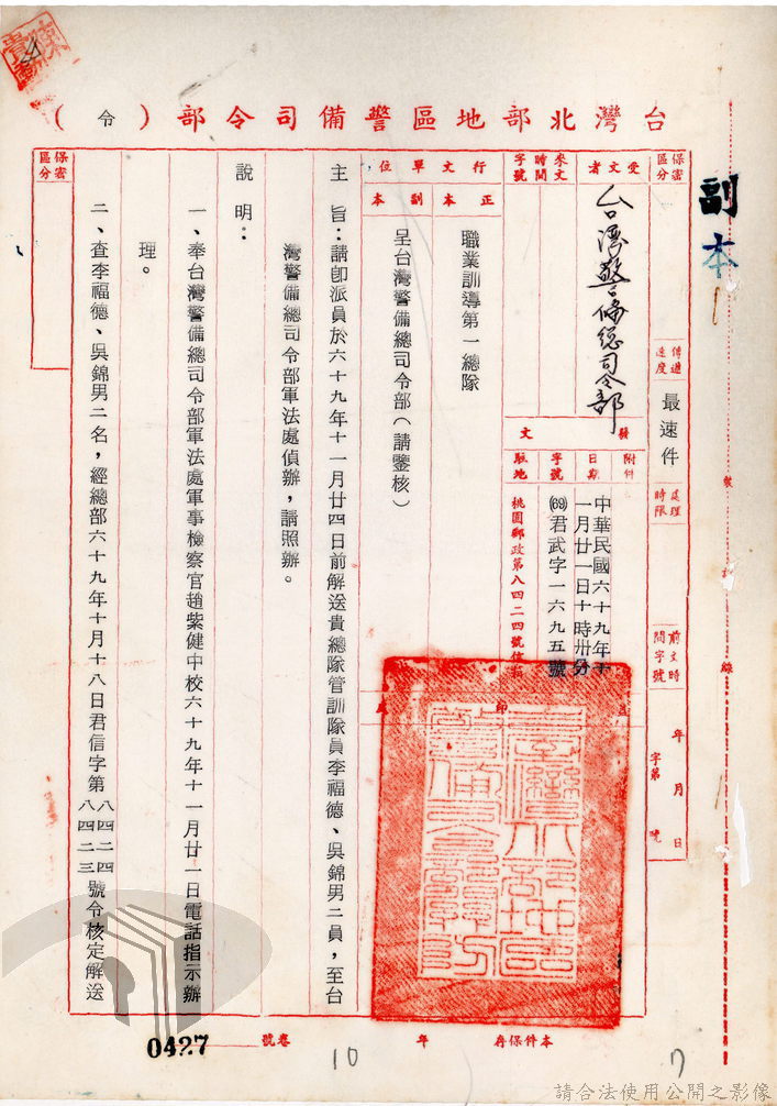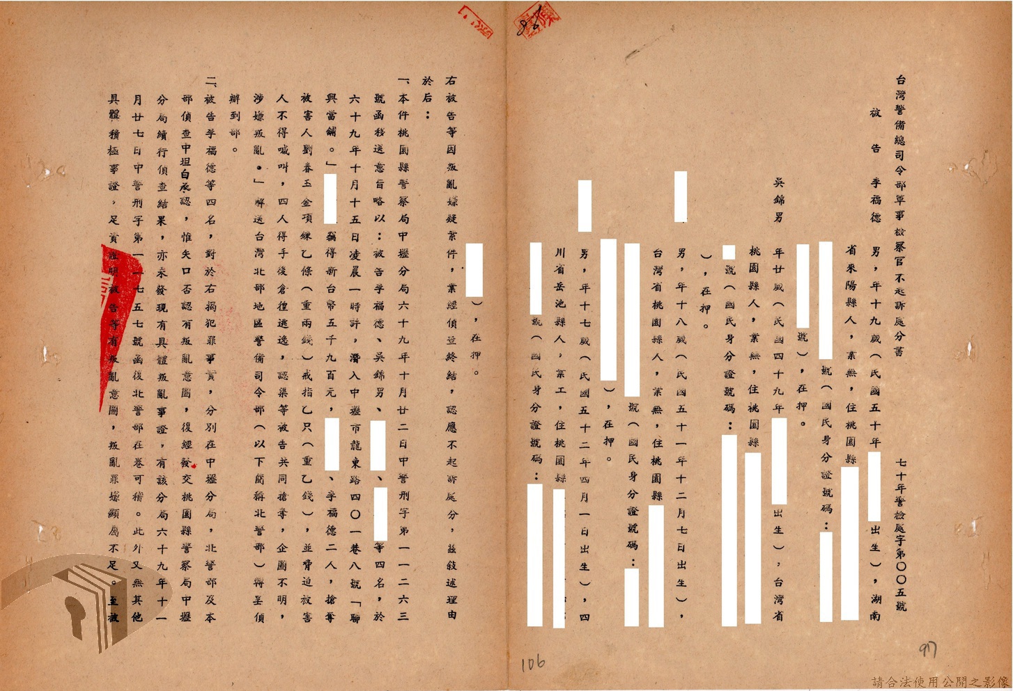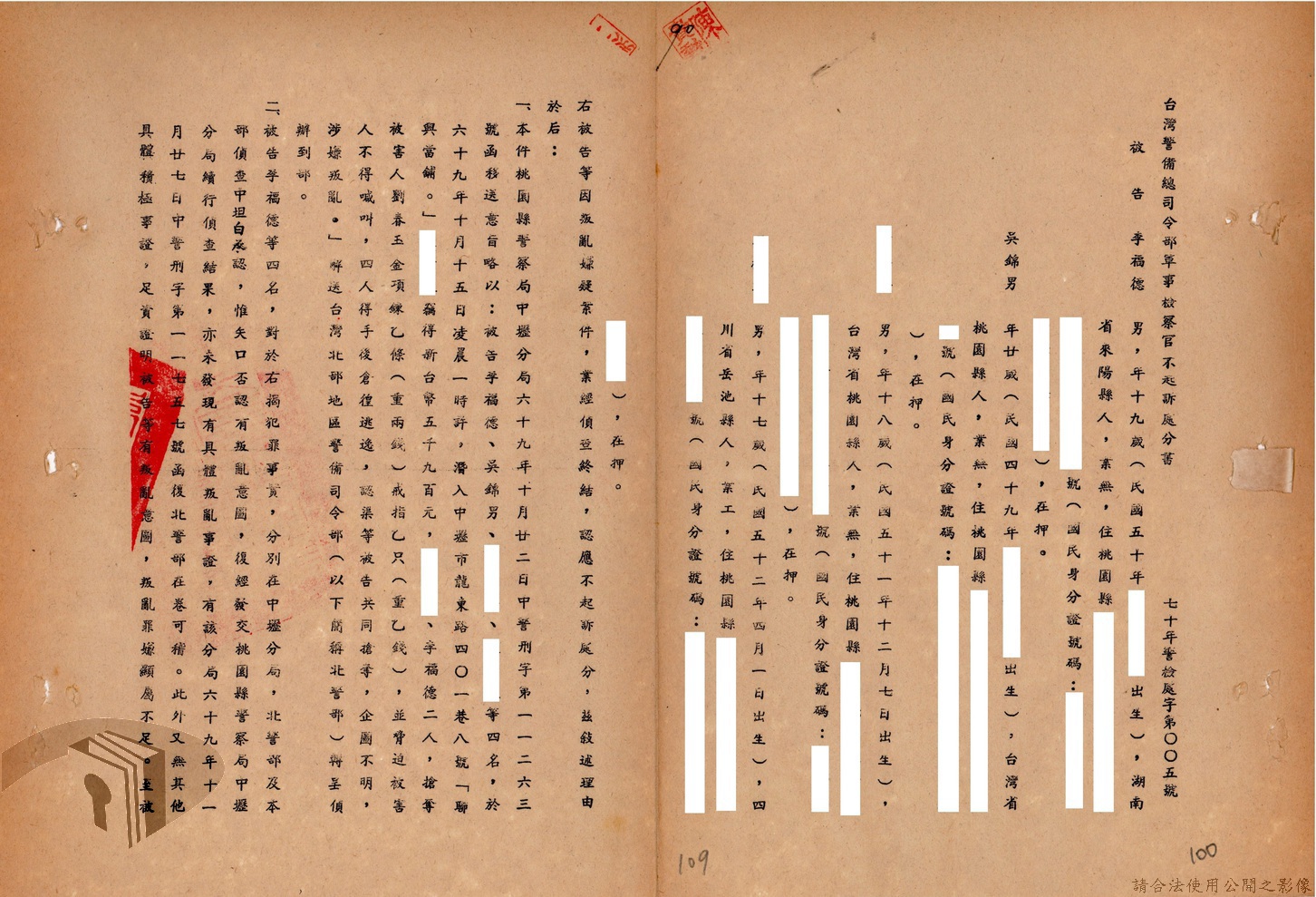 本案為69至70年間,臺灣北部地區警備司令部陳送民眾涉案偵查資料給臺灣警備總司令部,後經警總偵查終結,予以不起訴處分,因被告另涉及刑事案件部分,北警部將其移送臺灣桃園地方法院檢察處偵辦。附偵訊筆錄、不起訴處分書等文件資料。
