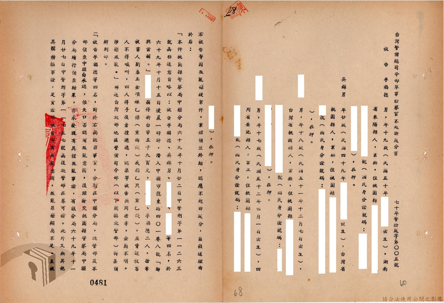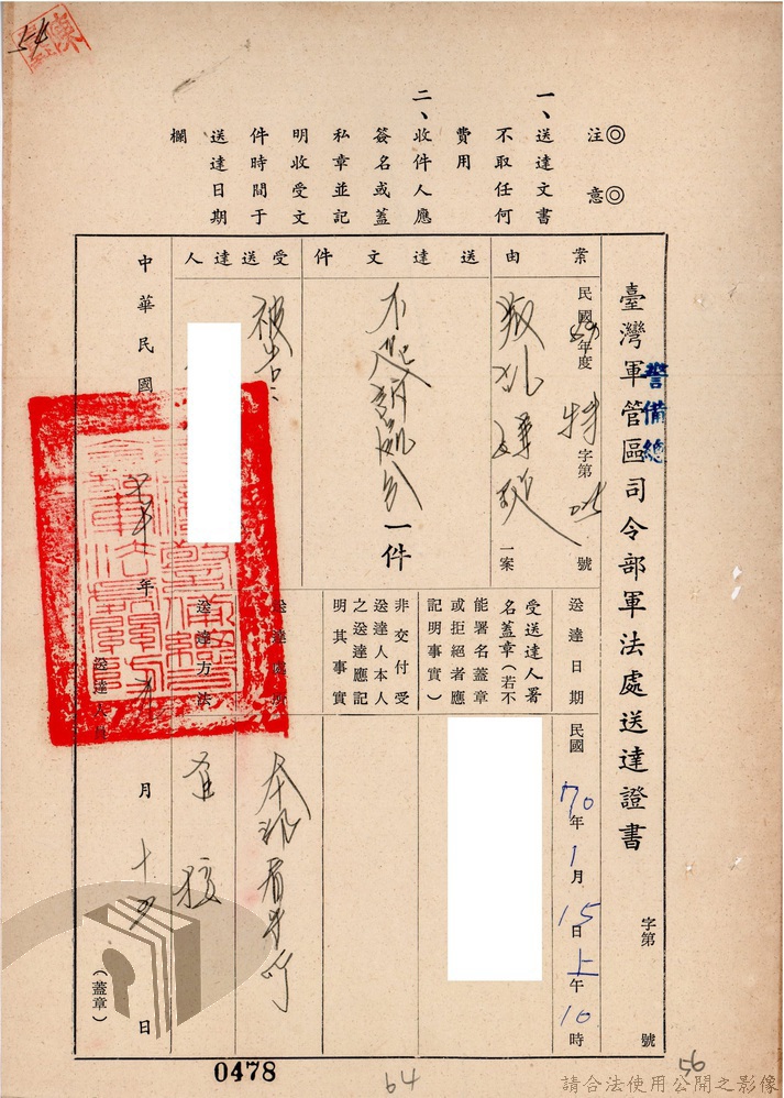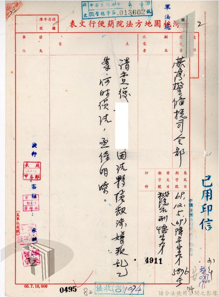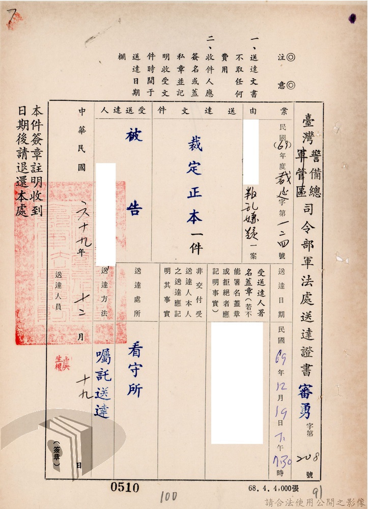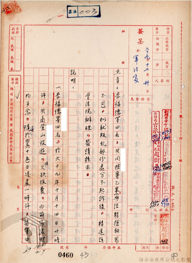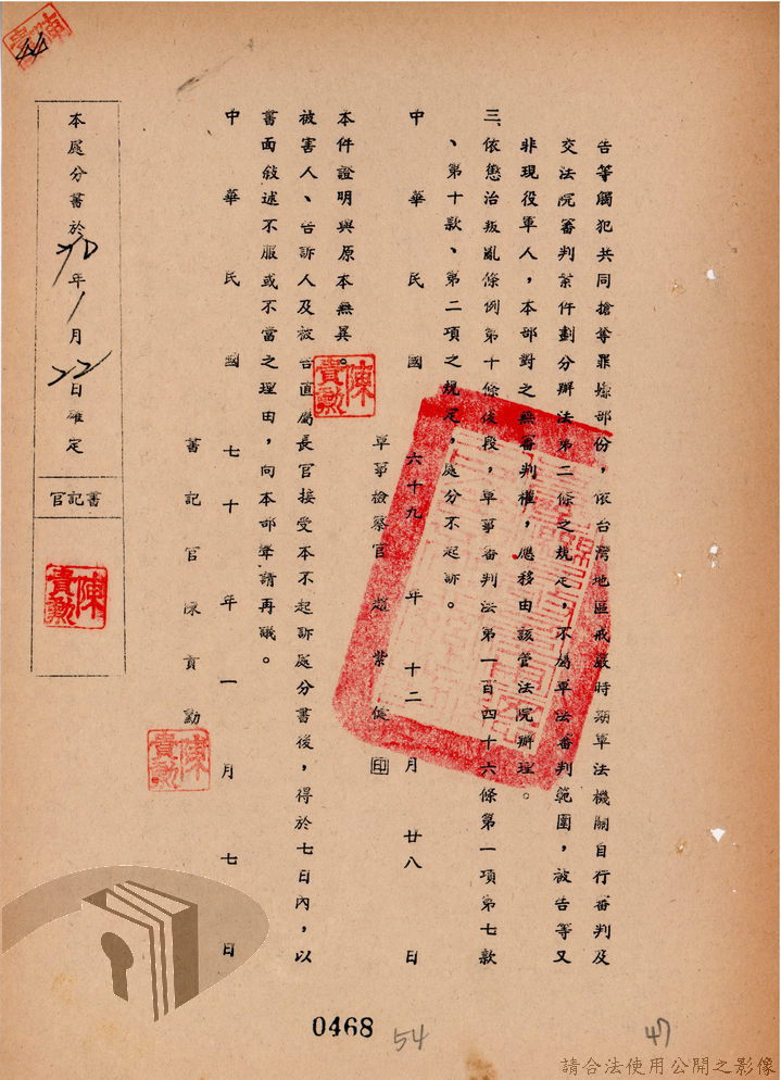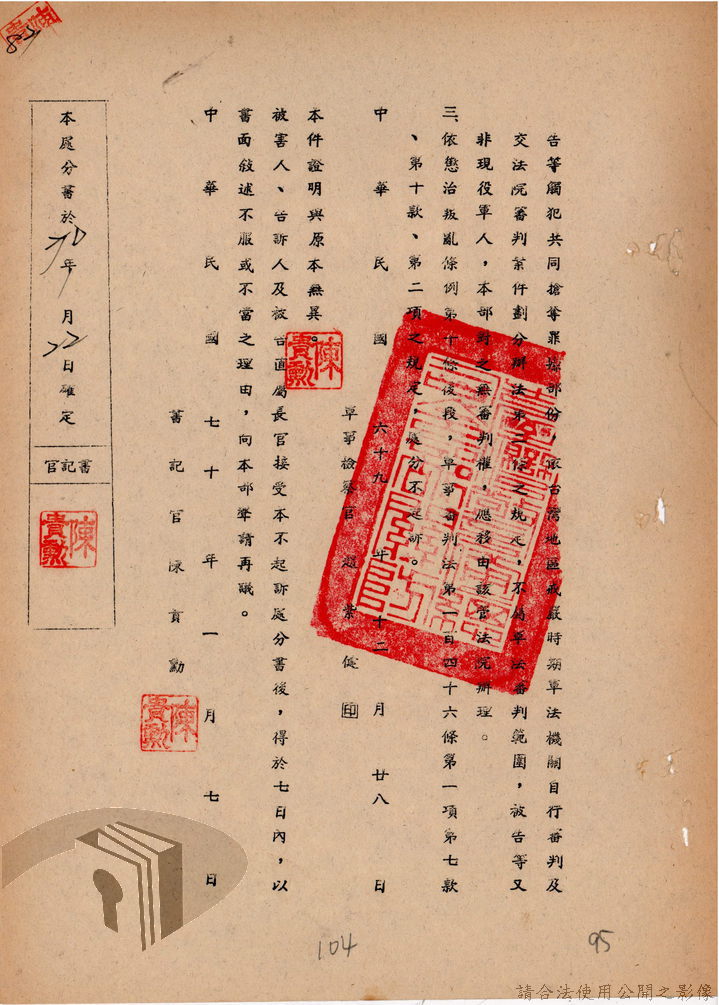 本案為69至70年間,臺灣北部地區警備司令部陳送民眾涉案偵查資料給臺灣警備總司令部,後經警總偵查終結,予以不起訴處分,因被告另涉及刑事案件部分,北警部將其移送臺灣桃園地方法院檢察處偵辦。附偵訊筆錄、不起訴處分書等文件資料。