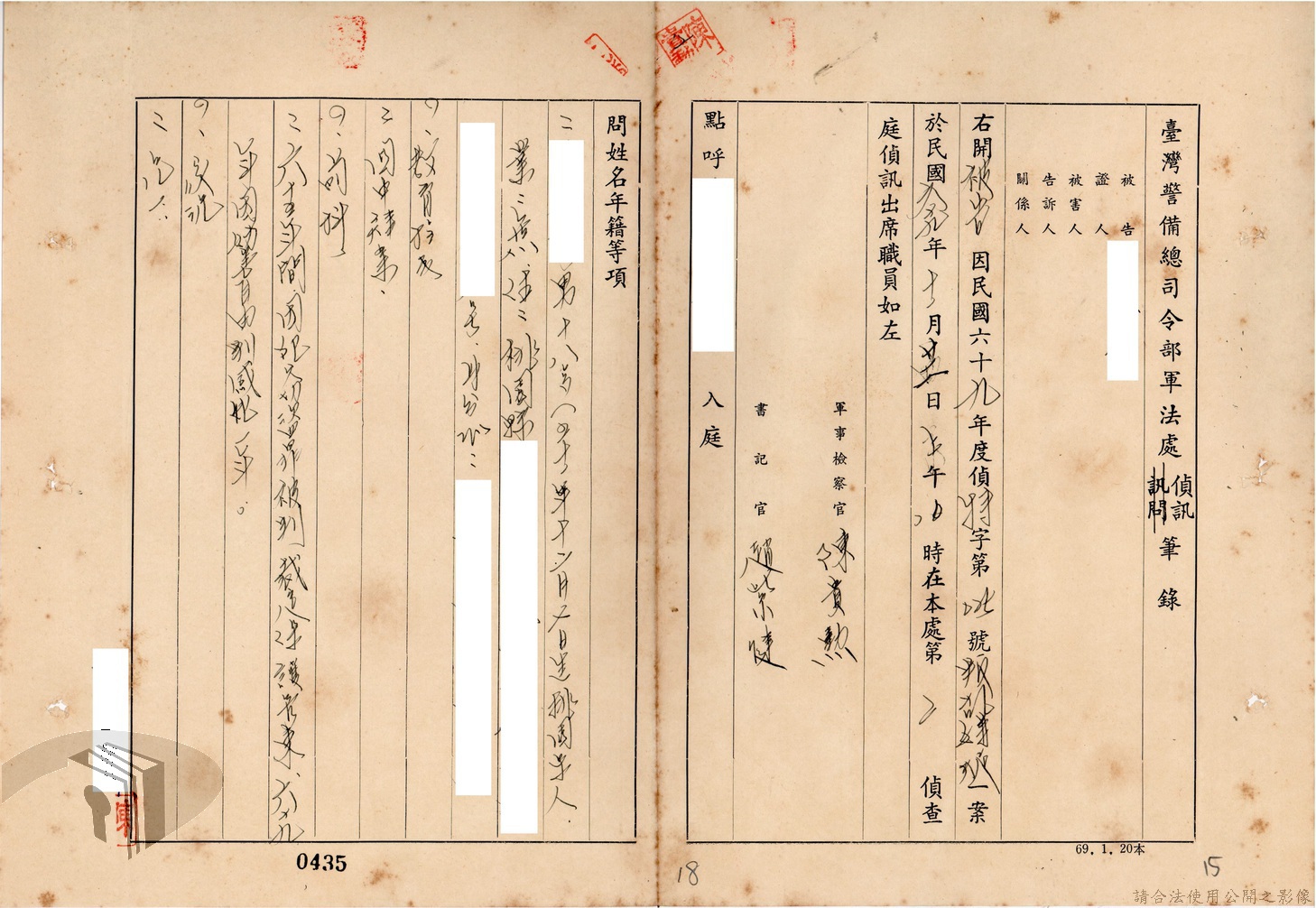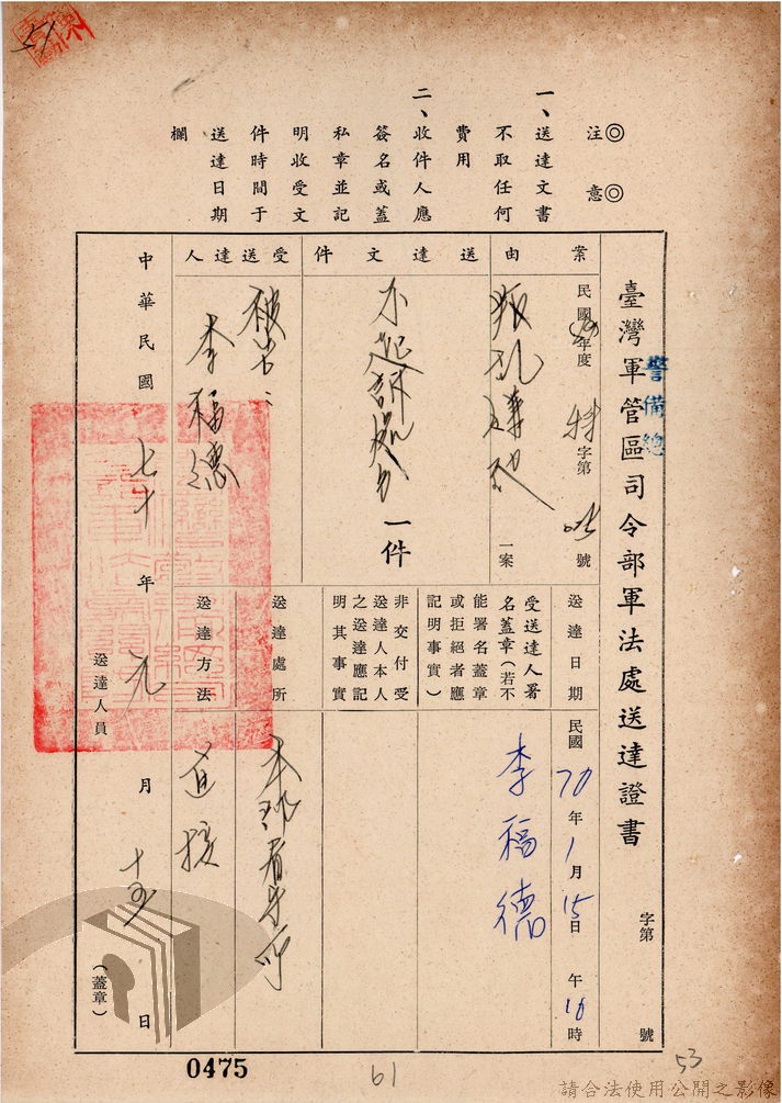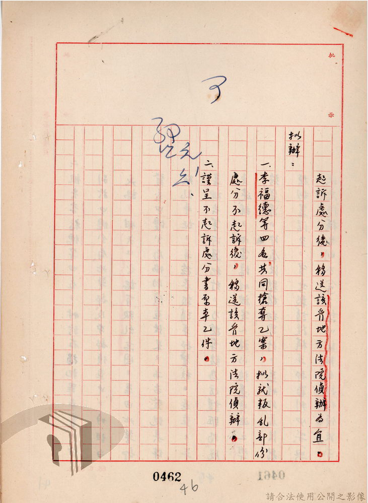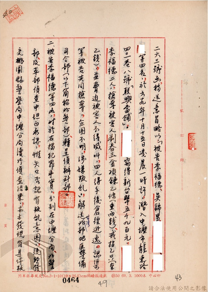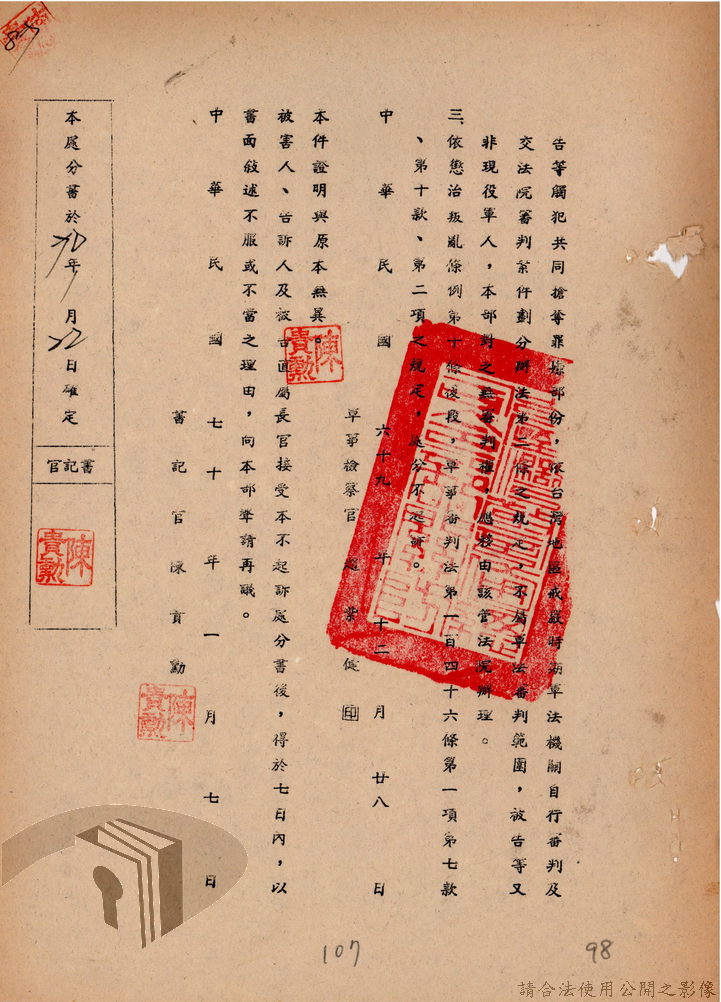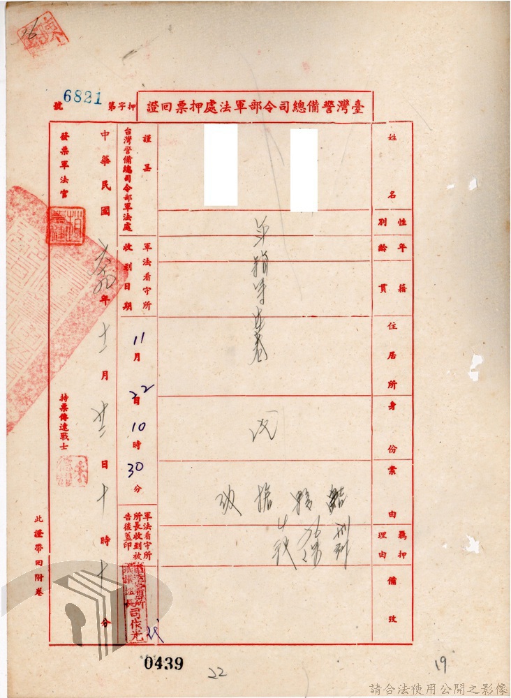 本案為69至70年間,臺灣北部地區警備司令部陳送民眾涉案偵查資料給臺灣警備總司令部,後經警總偵查終結,予以不起訴處分,因被告另涉及刑事案件部分,北警部將其移送臺灣桃園地方法院檢察處偵辦。附偵訊筆錄、不起訴處分書等文件資料。