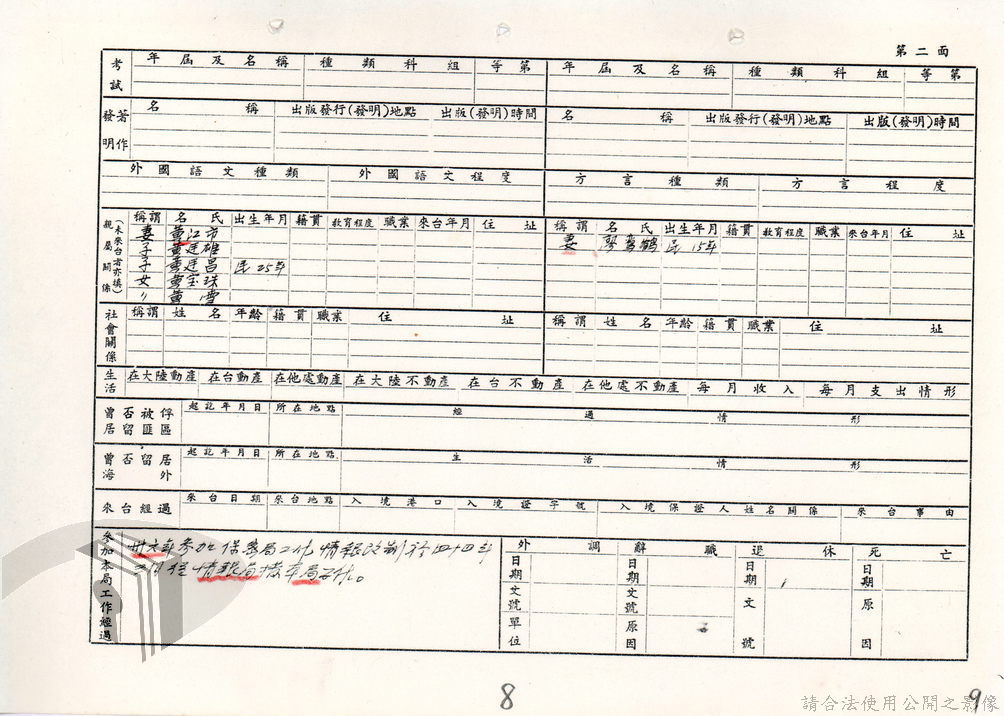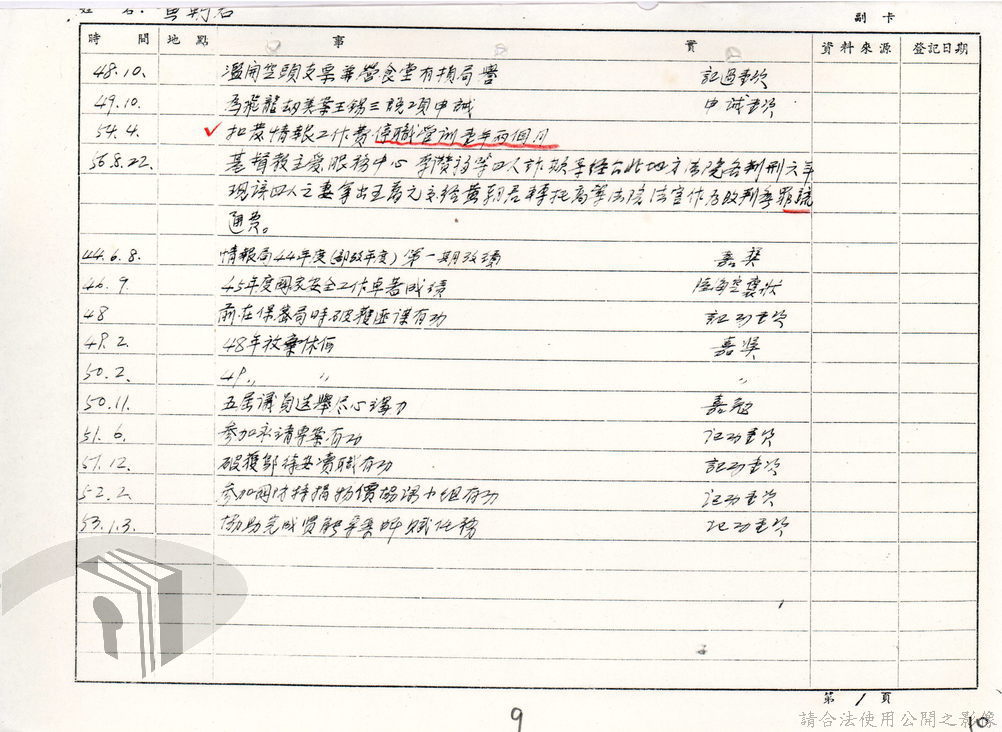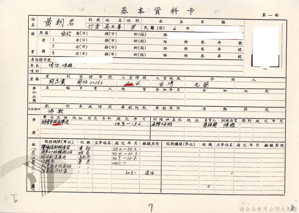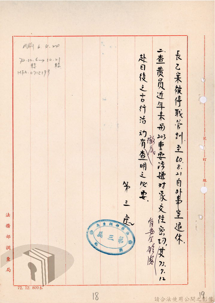 本案為73年間,法務部調查局所屬調查站函知法務部調查局有關該局退休人員與案件關係人聯繫密切,且查詢該退休人員的相關資料並未於檔案資料中,後該局函請所屬督察室及所屬海外工作室調閱該退休人員相關資料,並調查該員赴日之言行,後海外工作室回復該局告知該員在日住址以便調查。附基本資料卡。
