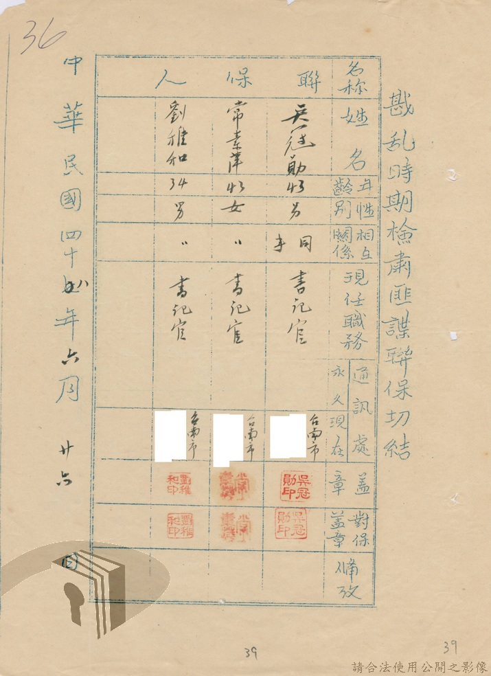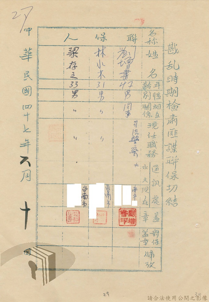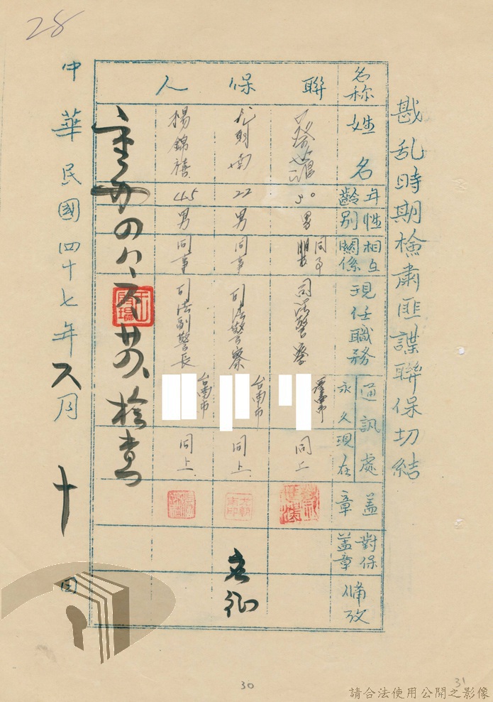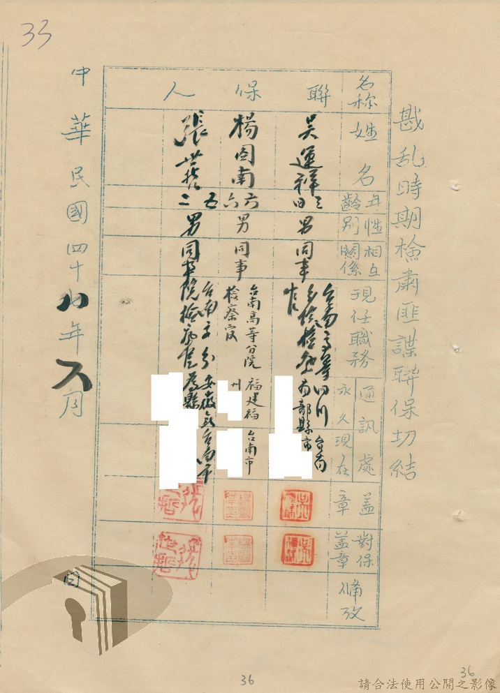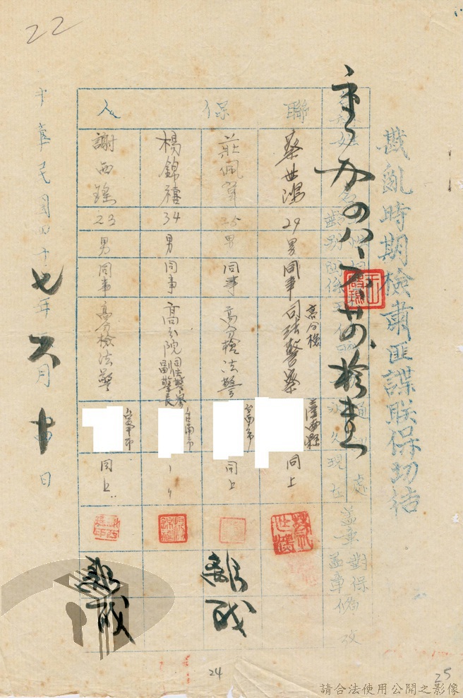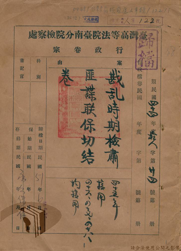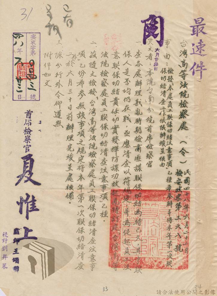 本案為48年間,臺灣高等法院檢察處檢送該處員工聯保切結注意事項予臺灣高等法院臺南分院首席檢察官參辦,並請其將第一次聯保切結清查工作於限定期間內完成。附戡亂時期檢肅匪諜聯保切結、聯保切結清查注意事項。