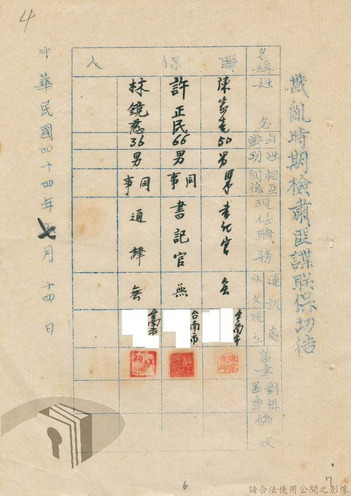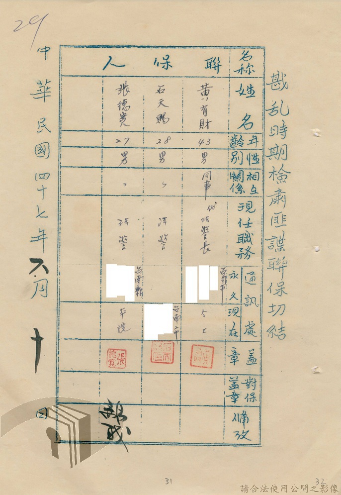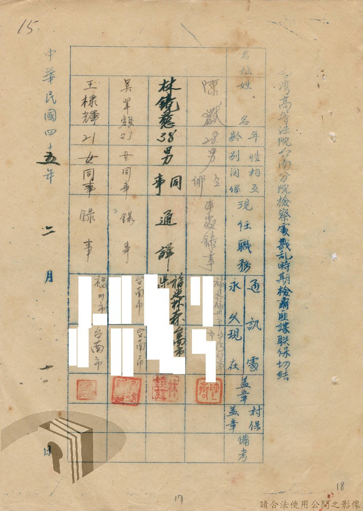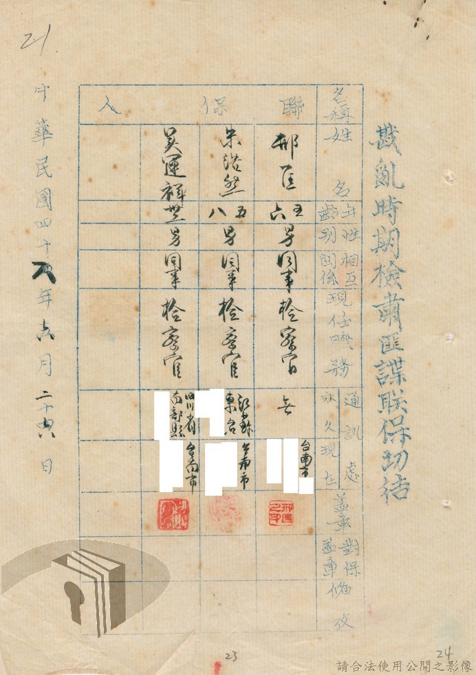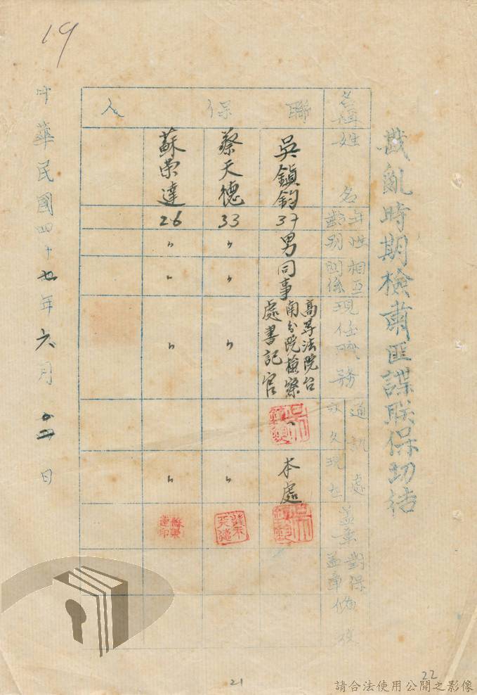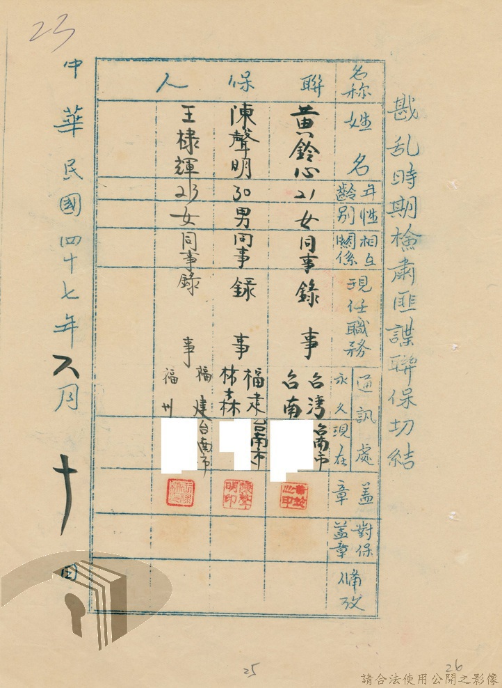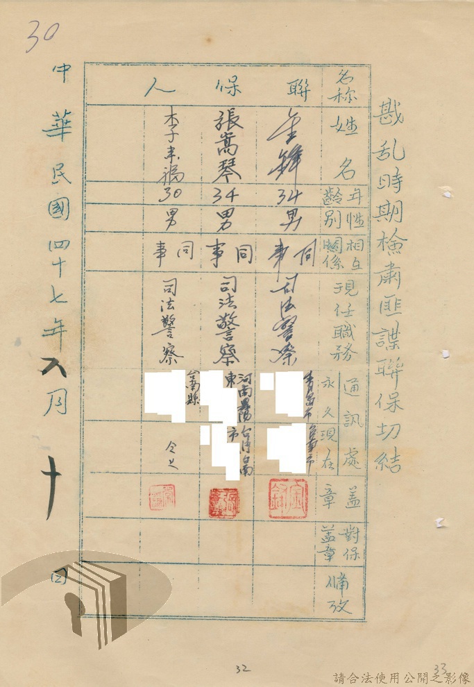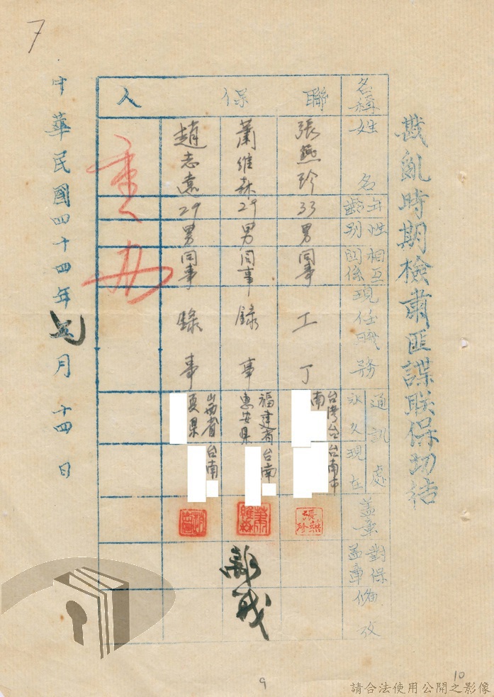 本案為48年間,臺灣高等法院檢察處檢送該處員工聯保切結注意事項予臺灣高等法院臺南分院首席檢察官參辦,並請其將第一次聯保切結清查工作於限定期間內完成。附戡亂時期檢肅匪諜聯保切結、聯保切結清查注意事項。