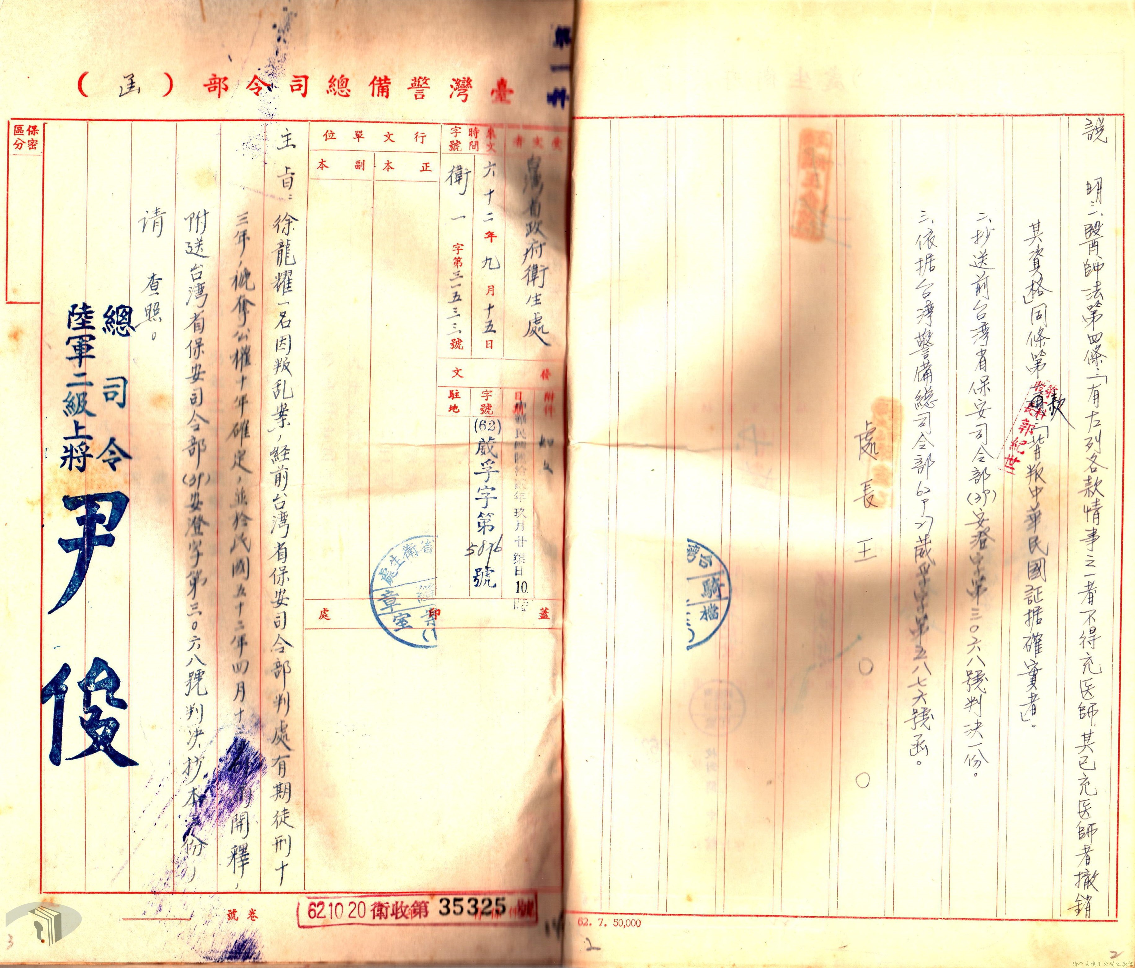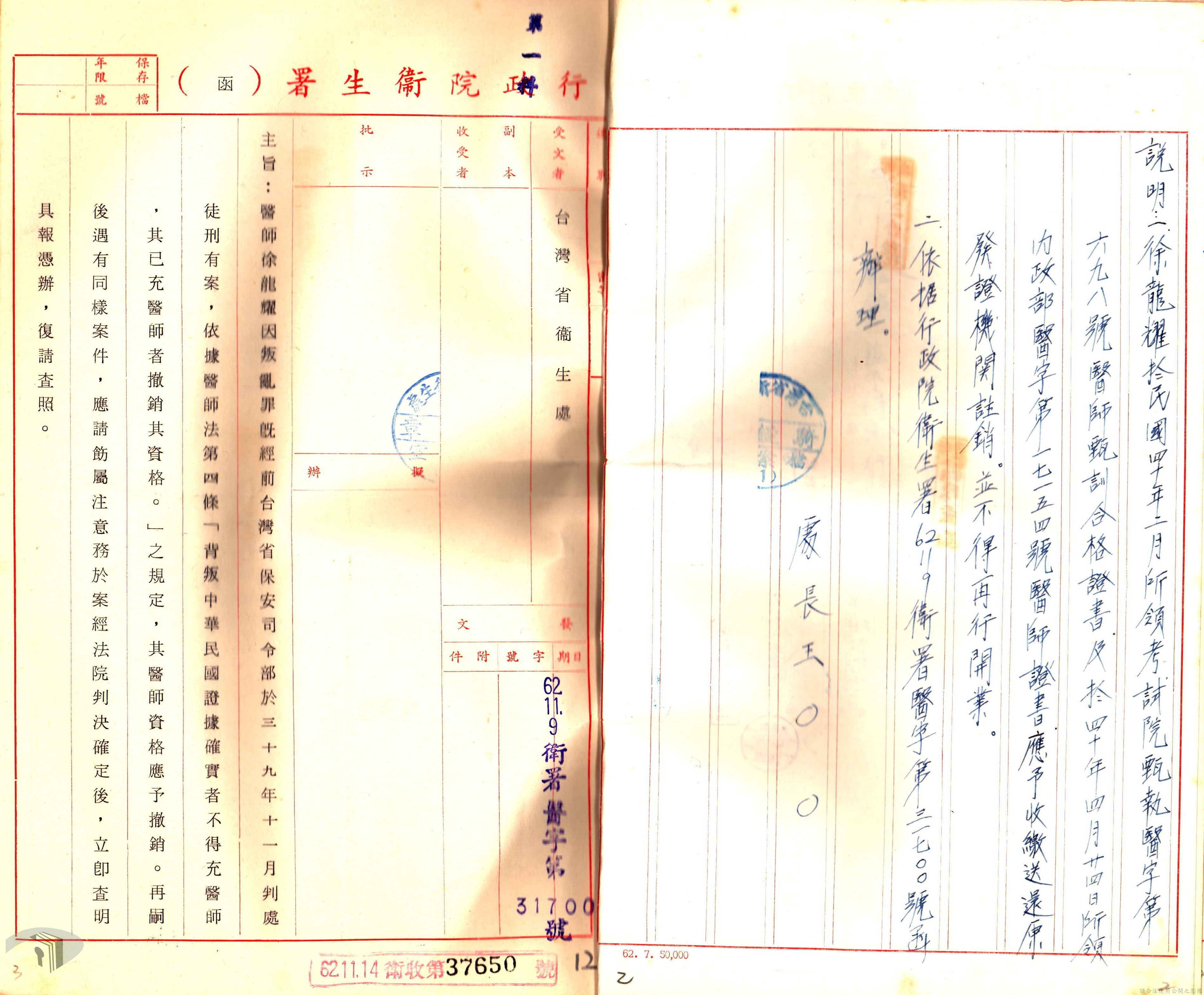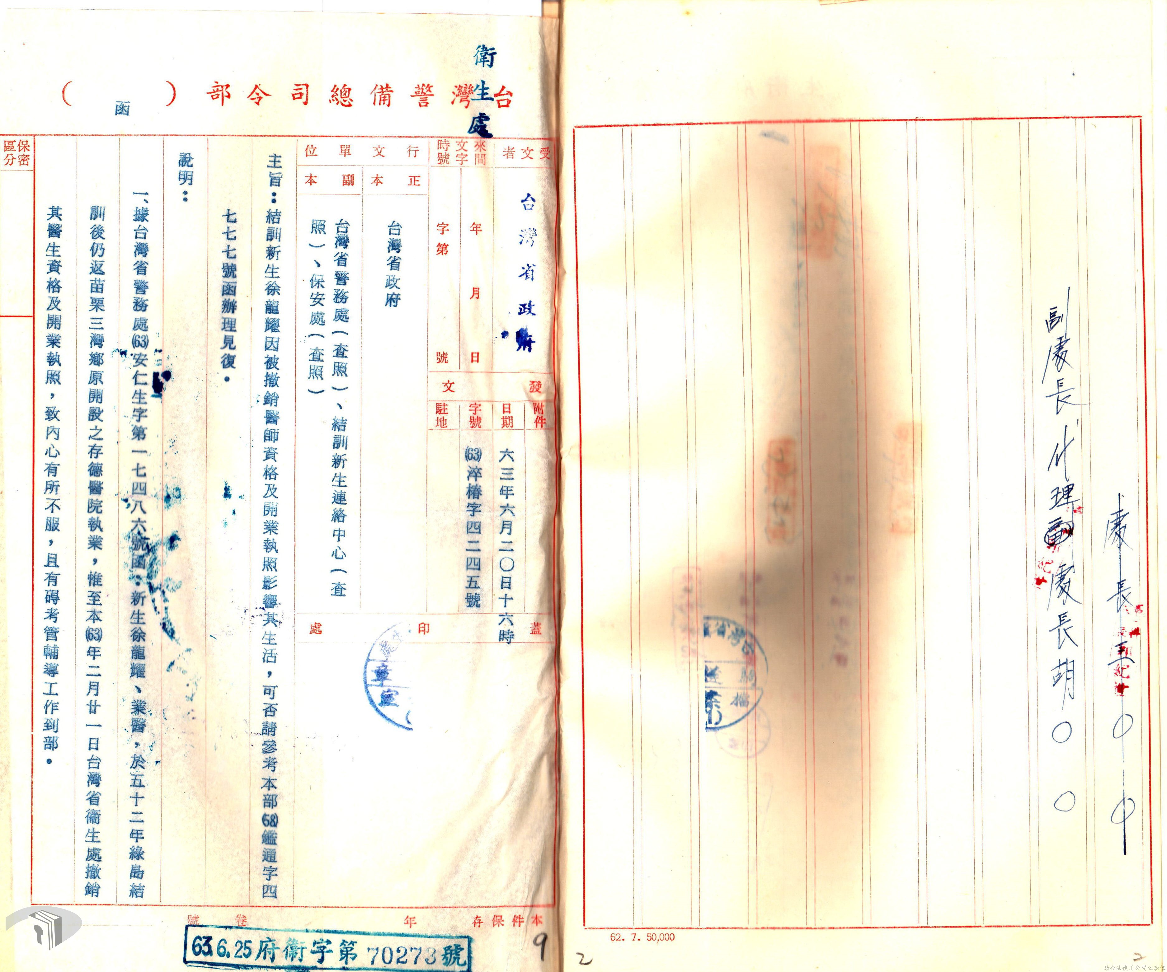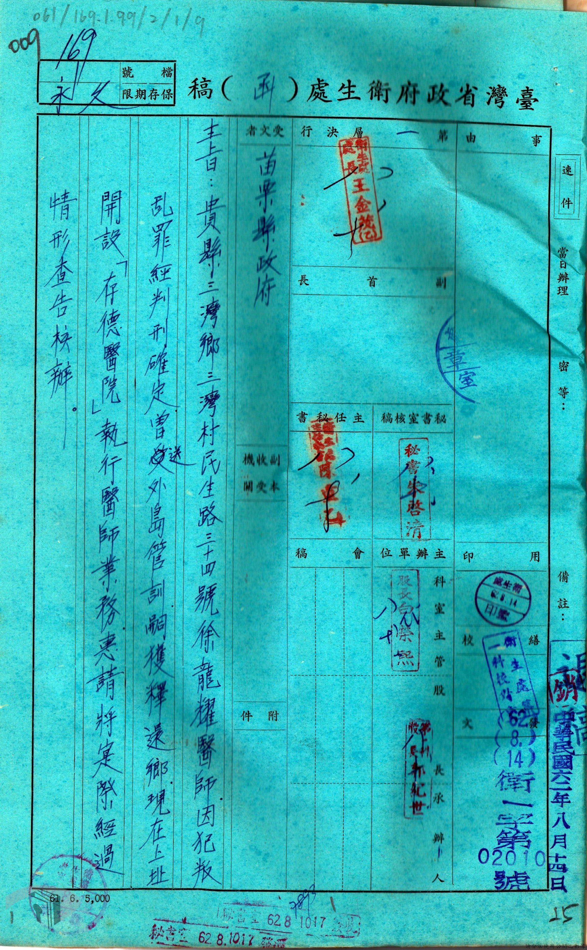 本案為民國61至63年間醫師停業事宜,臺灣省衛生處依據新竹地方法院檢察處判決而函請苗栗縣政府配合辦理相關事項,臺灣警備總司令部則函請臺灣省政府放寬其停業限制,以免影響其生活,後衛生處依行政院衛生署函示意見轉知警備總部。附判決書。