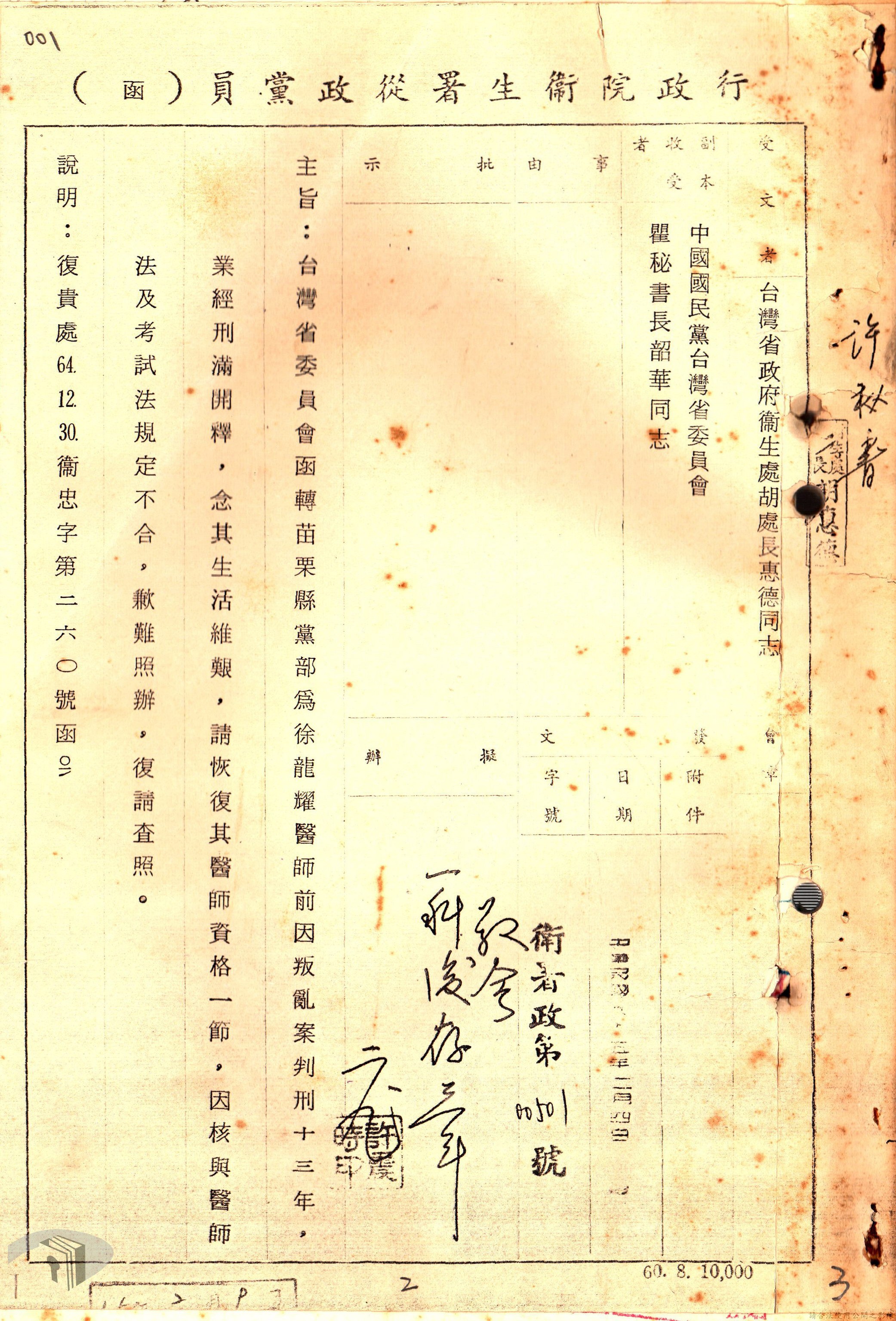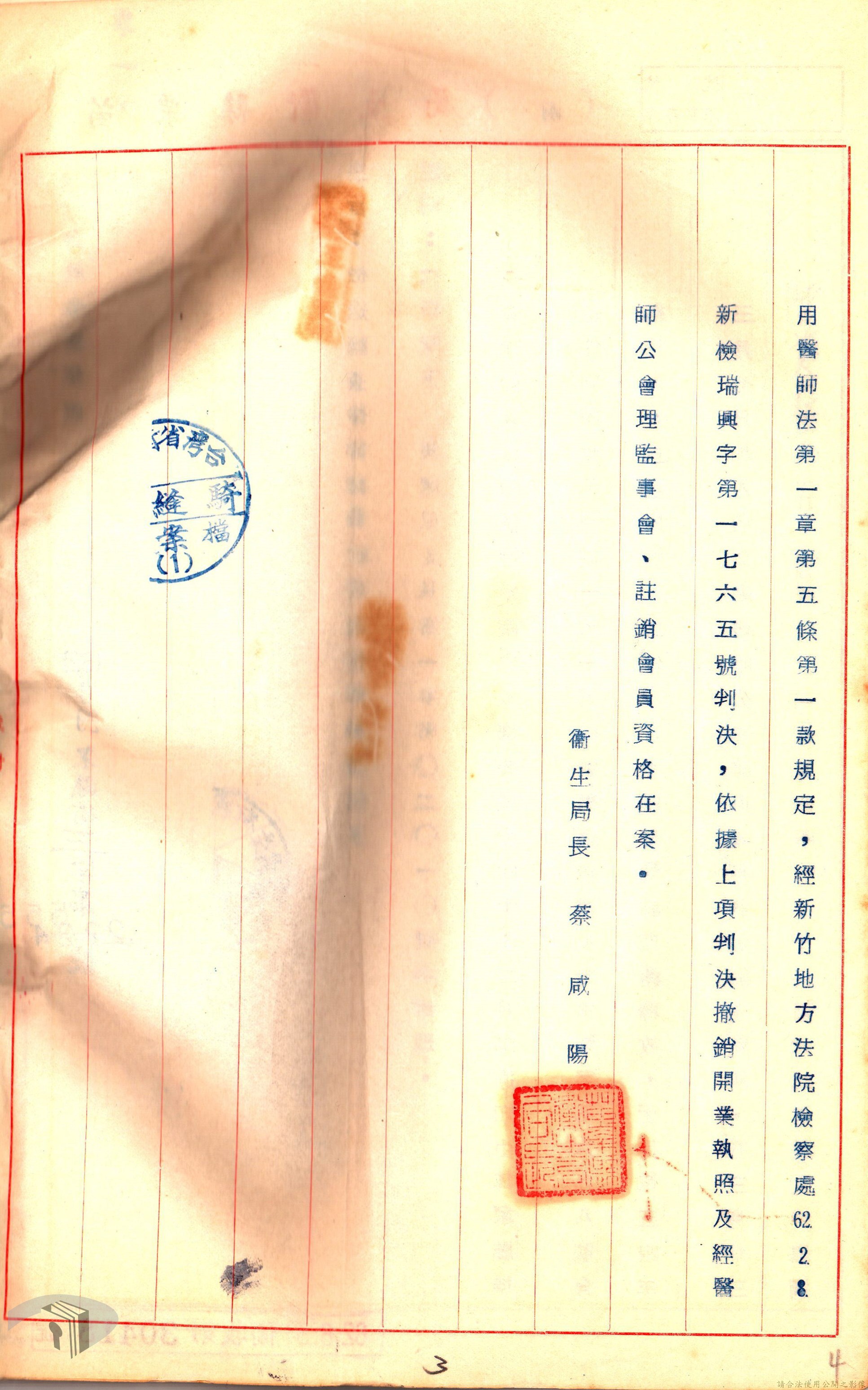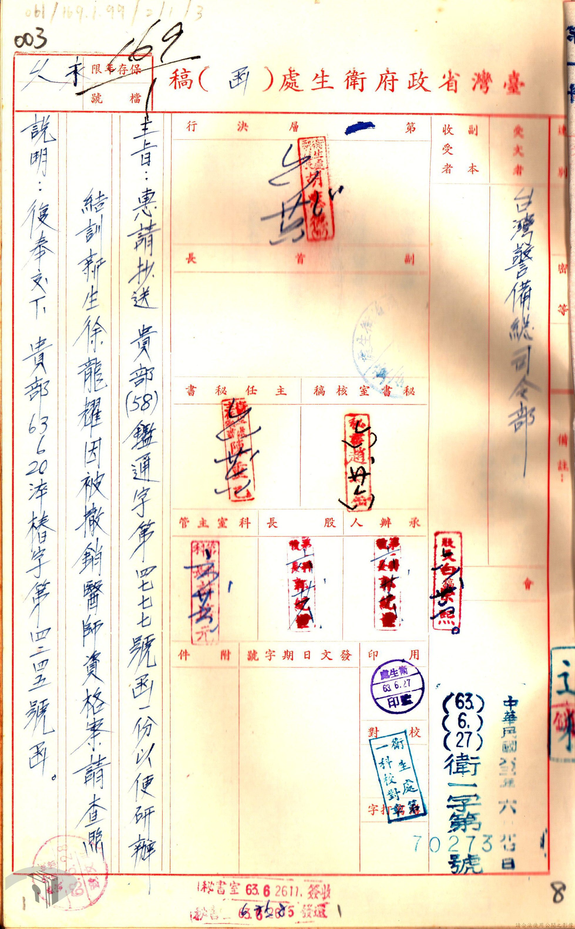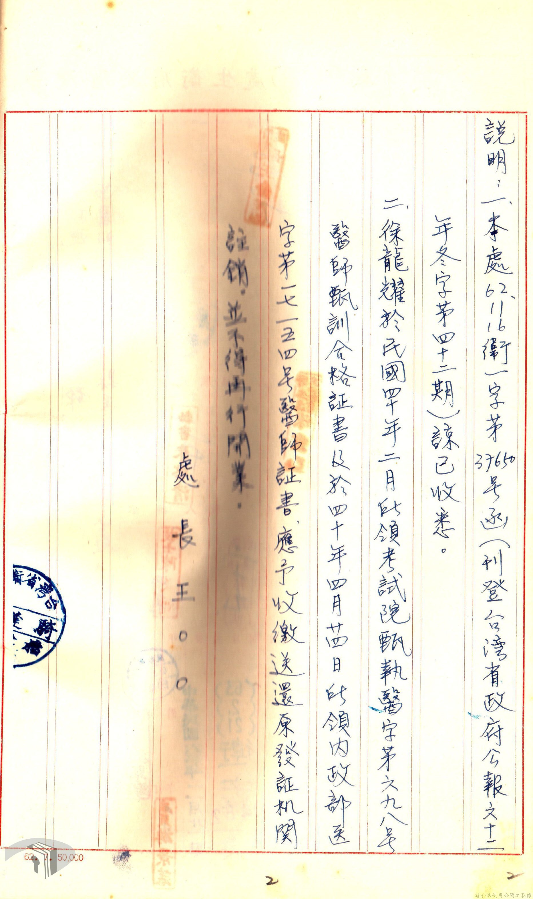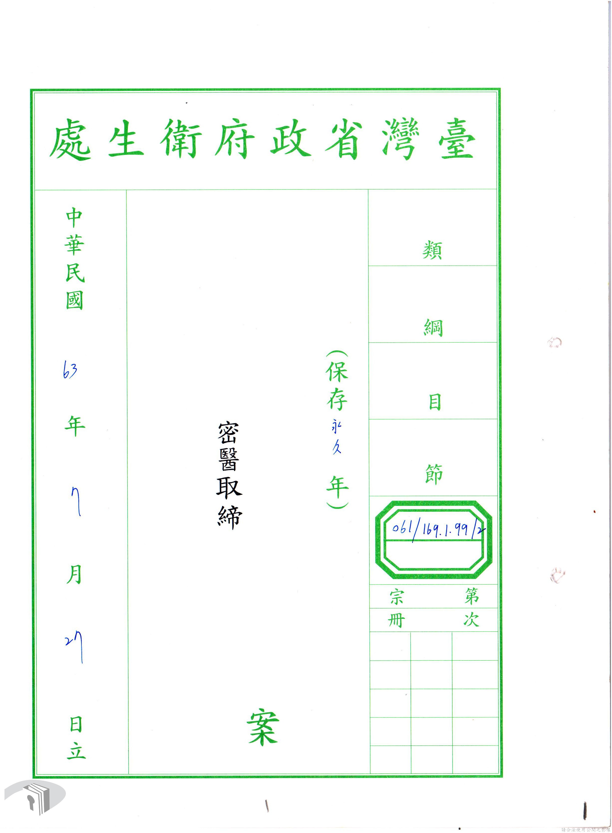 本案為民國61至63年間醫師停業事宜,臺灣省衛生處依據新竹地方法院檢察處判決而函請苗栗縣政府配合辦理相關事項,臺灣警備總司令部則函請臺灣省政府放寬其停業限制,以免影響其生活,後衛生處依行政院衛生署函示意見轉知警備總部。附判決書。