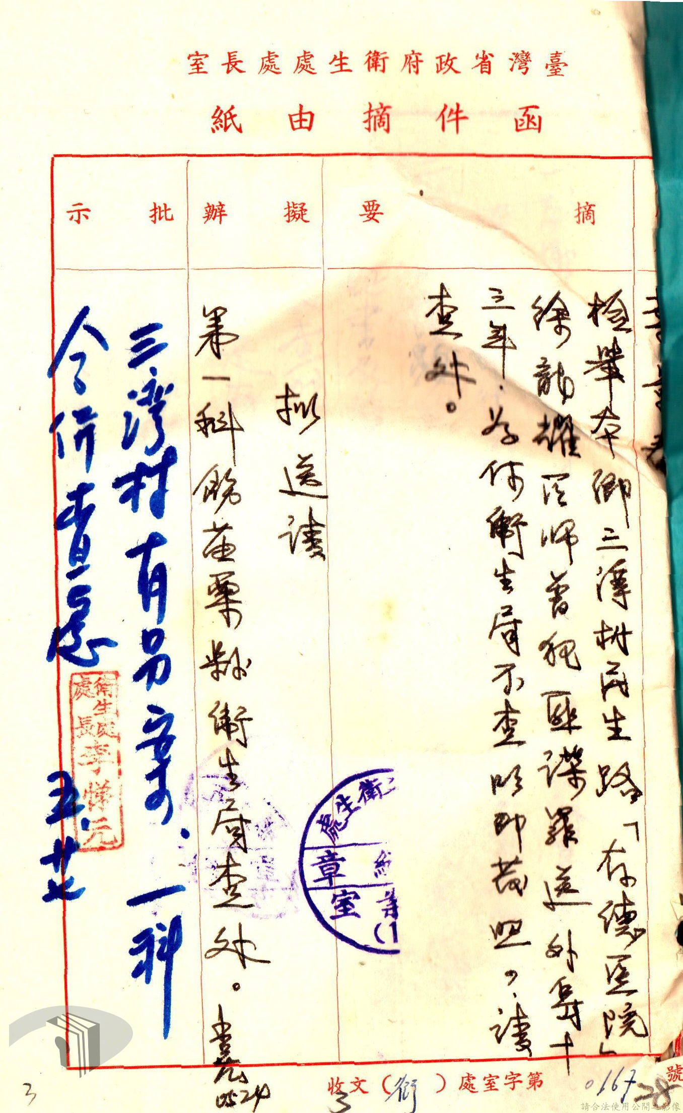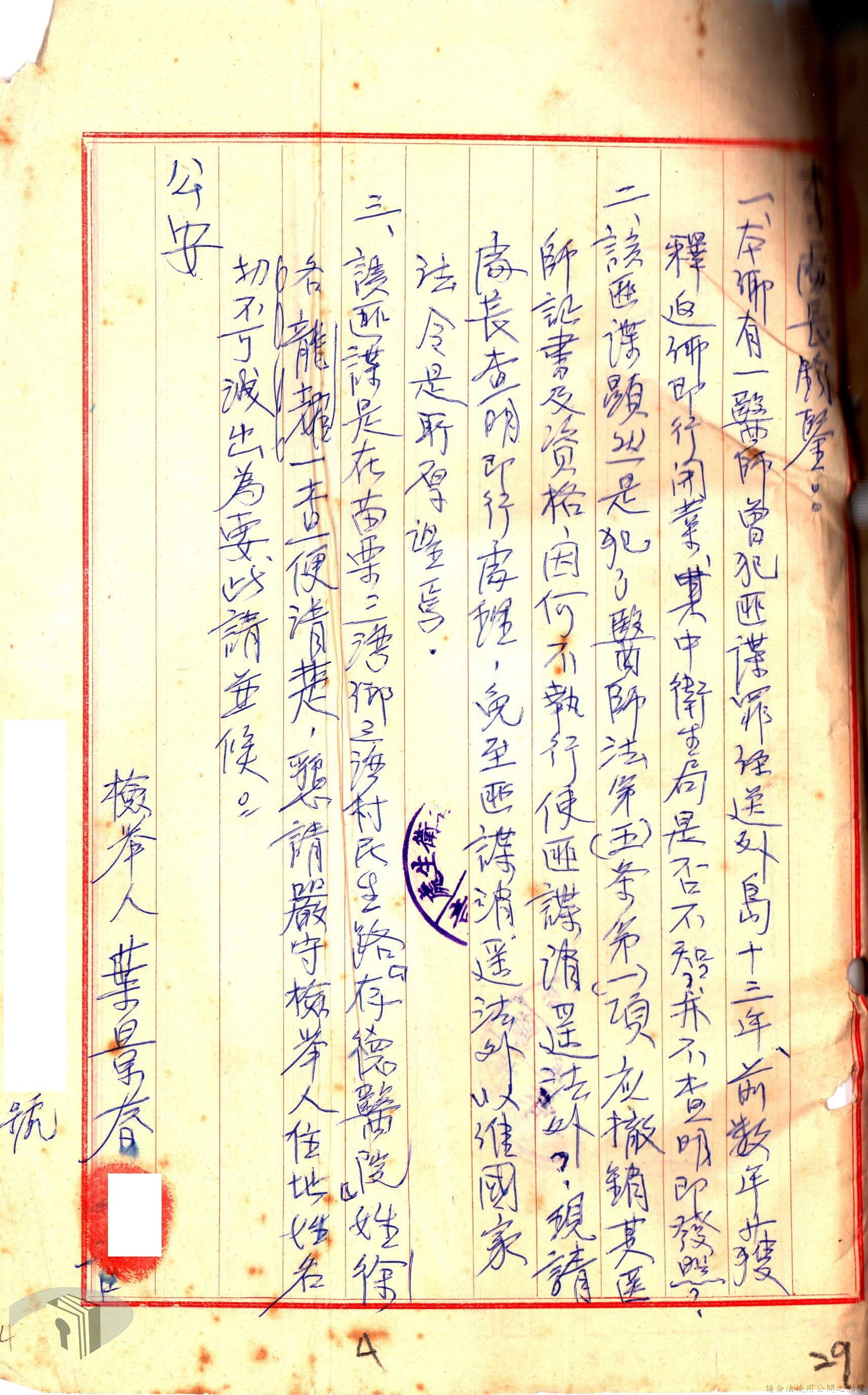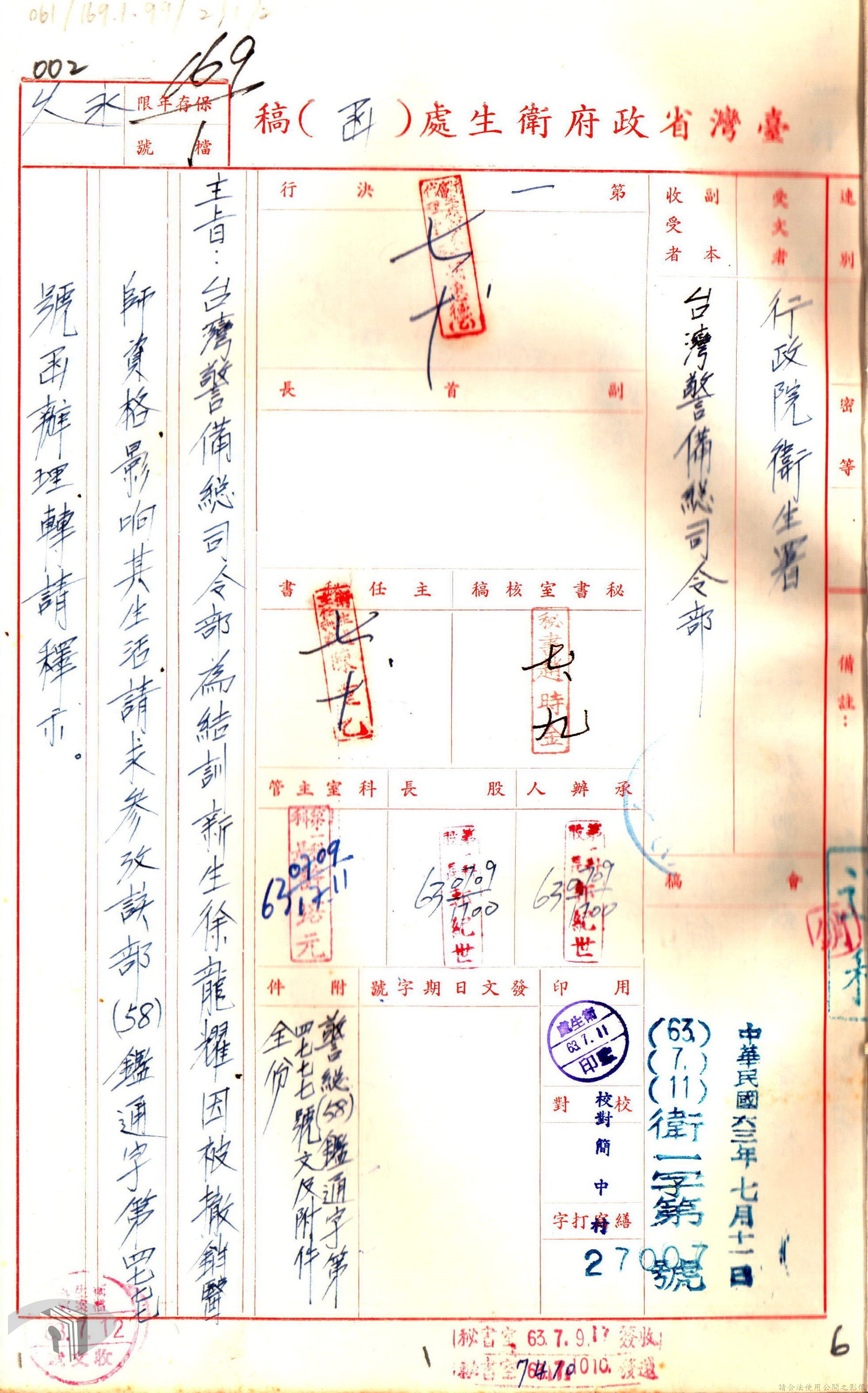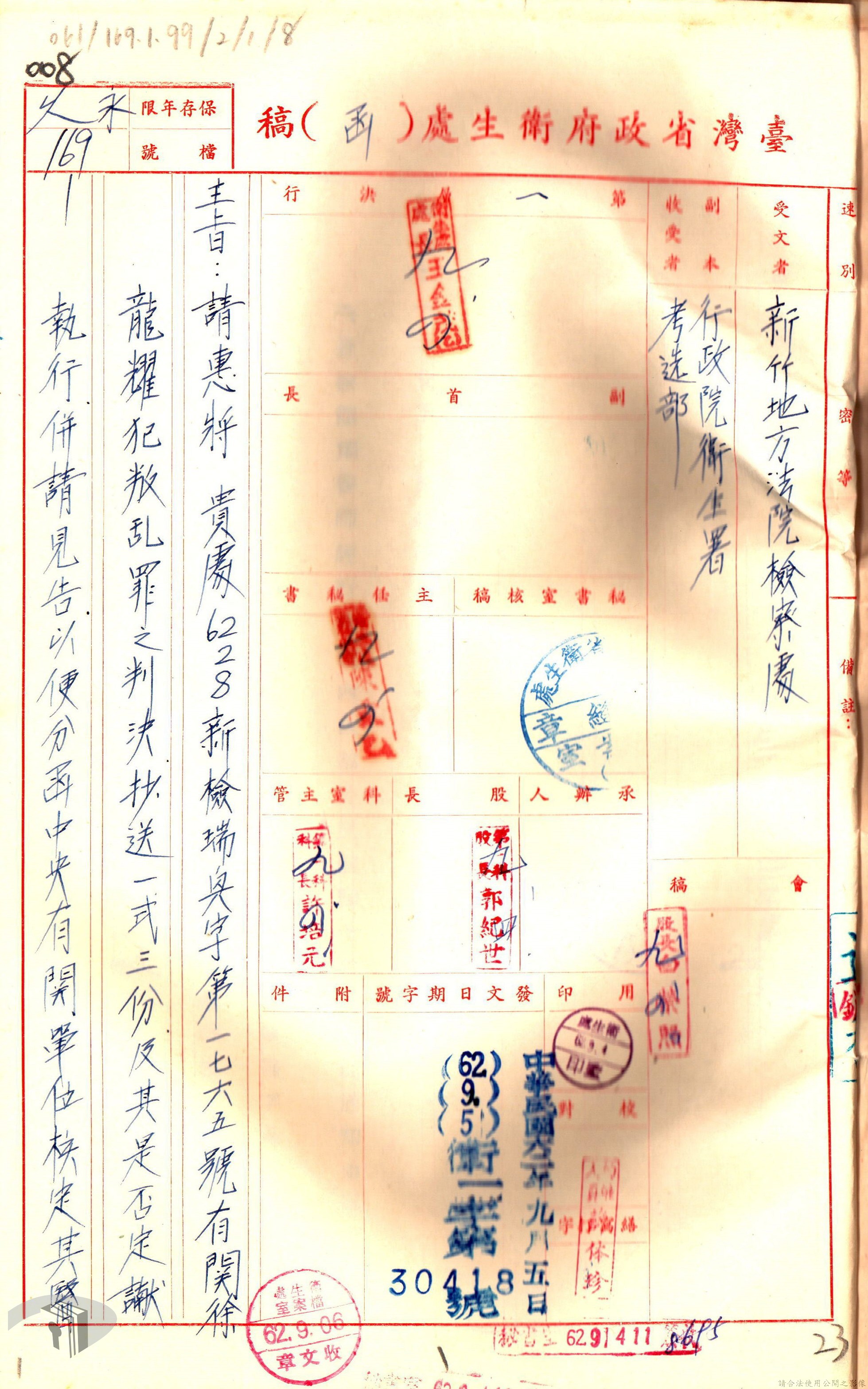 本案為民國61至63年間醫師停業事宜,臺灣省衛生處依據新竹地方法院檢察處判決而函請苗栗縣政府配合辦理相關事項,臺灣警備總司令部則函請臺灣省政府放寬其停業限制,以免影響其生活,後衛生處依行政院衛生署函示意見轉知警備總部。附判決書。