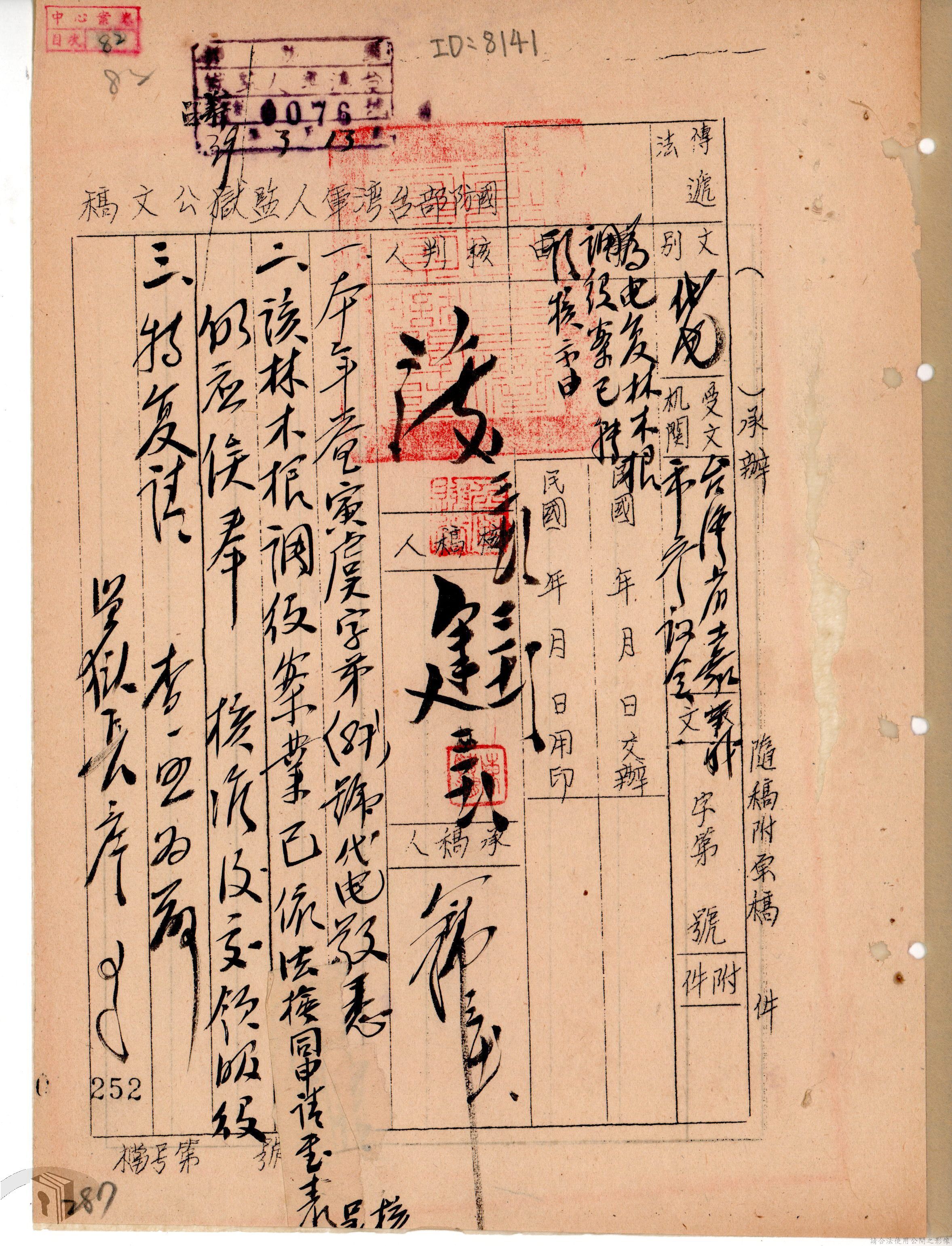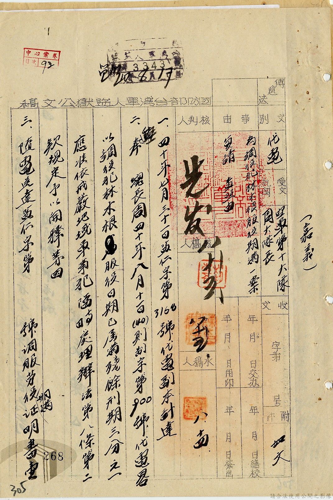 本案為36至43年間,有關臺籍人士於日本統治時期擔任巡察時,涉嫌對中國僑胞實施酷刑等案件,經臺灣省警備總司令部審判戰犯軍事法庭判決,三名判處五年至無期徒刑不等的刑期;二名因涉與日人陰謀從事臺獨及竊據國土等案件,經警備總部分處一至二年徒刑;其中二員申請調役以及以服刑期殘餘三分之一申請保釋,獲國防部核准;另一名於服刑期間患病獲准保外就醫,經核准將住院期間視為在監執行,並於住院期間服刑期滿獲准開釋;嘉義市參議會副議長因涉惡意侮辱元首遭處七年徒刑,經嘉市議會電請政府賜予優惠,空軍第十大隊並提請將該員調服勞役並填具保證書,至該員服刑滿殘餘刑期三分之一復請准將其開釋,經國防部發文表示核准;女戰犯因臺灣軍人監獄並無女監設備,經申請改交由臺北監獄執行刑期;全案包含臺灣省警備司令部軍事法庭的判決書,戰犯關係人填具的臺籍戰犯保釋保證書,以及調服機關移送的調服勞役期滿證明書等資料。