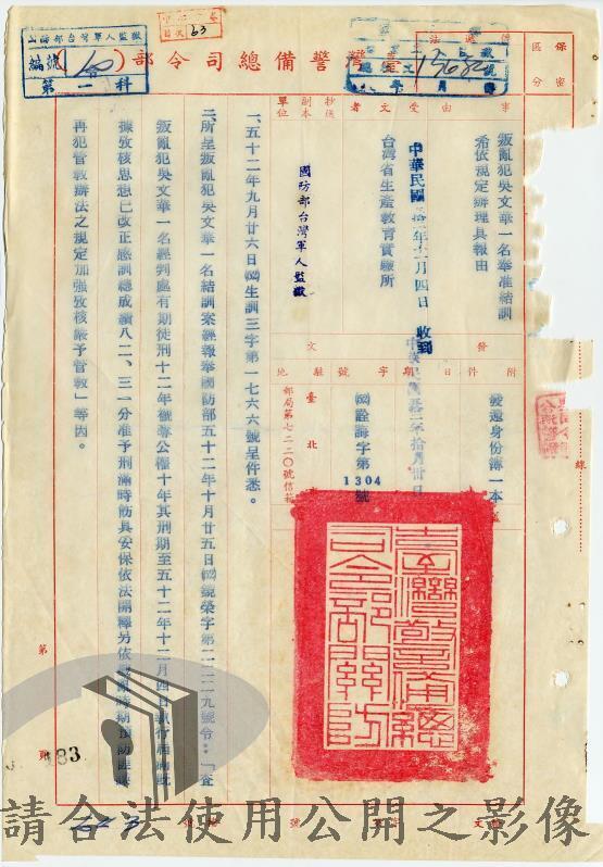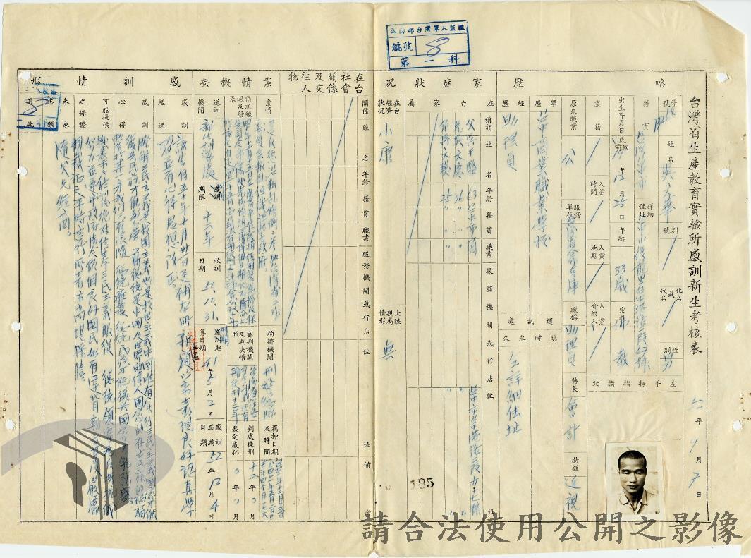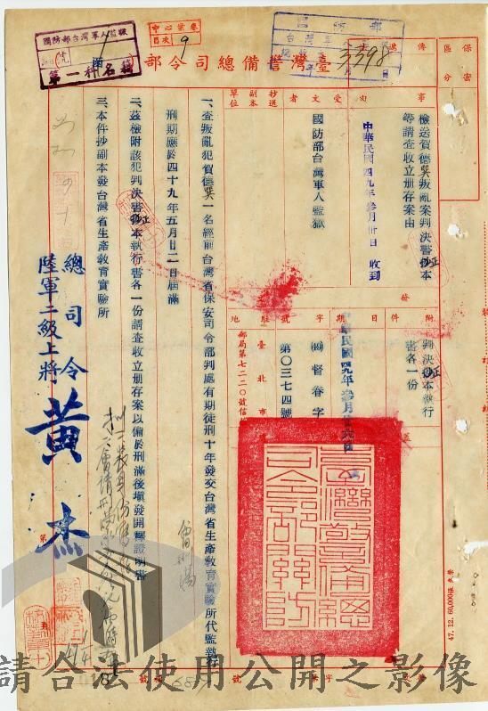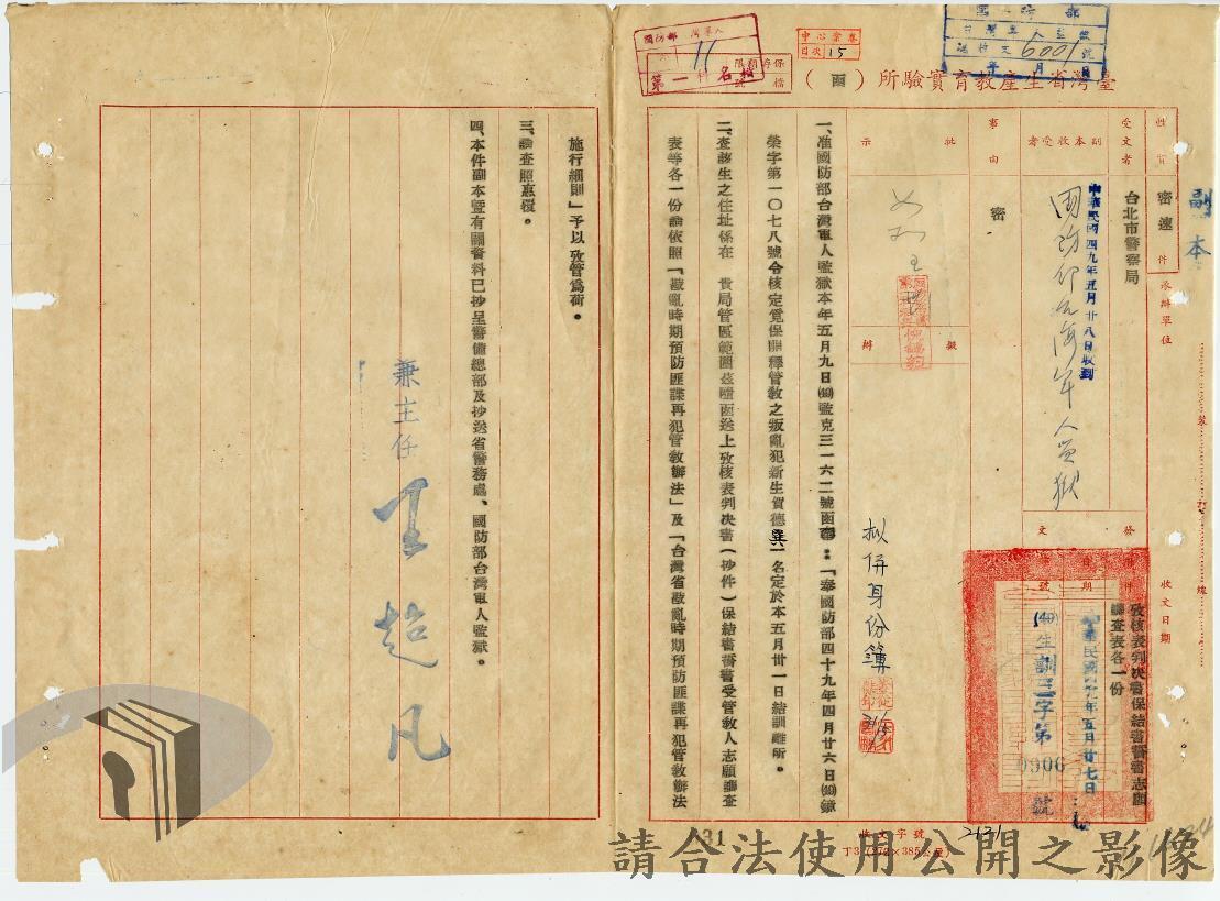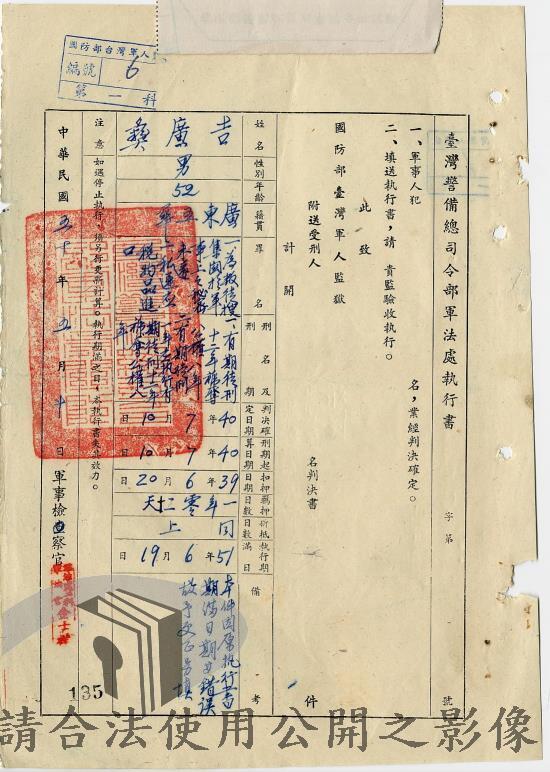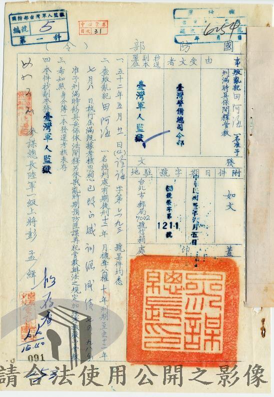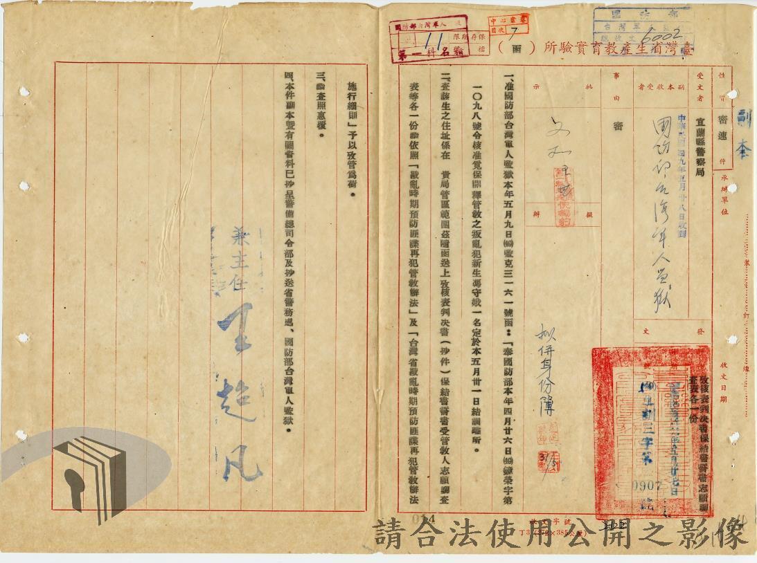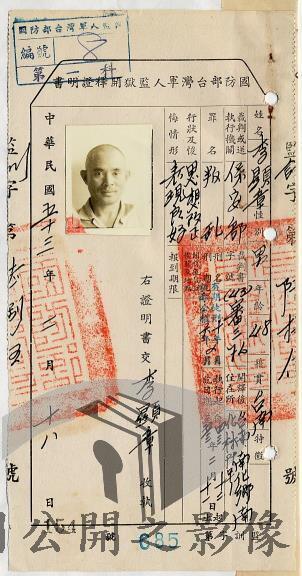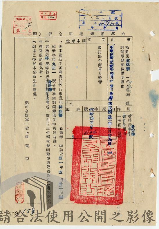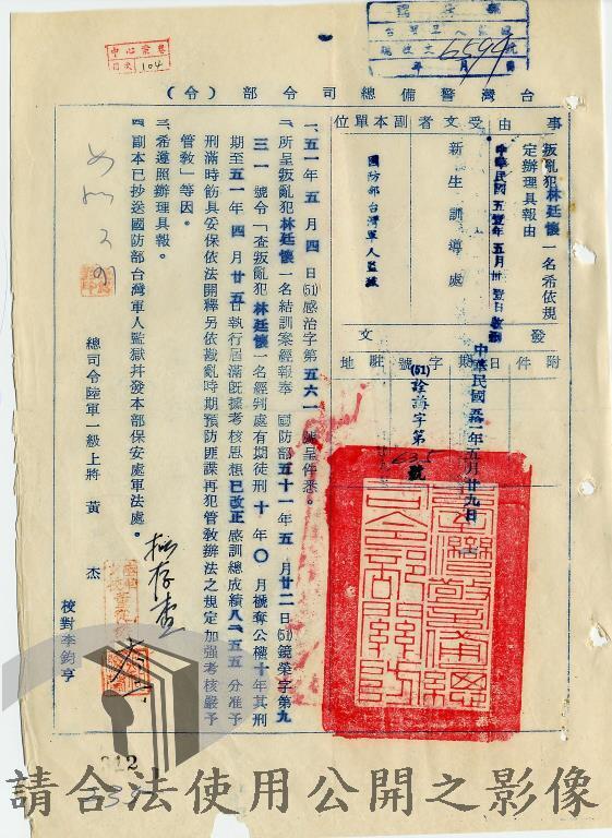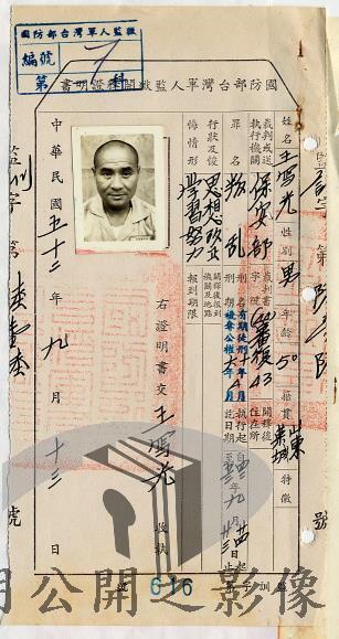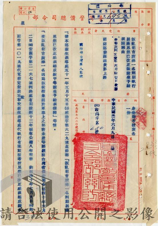 本案為39至53年間,民眾因案獲臺灣省保安司令部判決,臺灣省生產教育實驗所、臺灣警備總司令部新生訓導處後因受刑人刑期執行屆滿,且達到考核標準,函請國防部臺灣軍人監獄協助辦理出獄手續,軍人監獄函請國防部軍法局、國防部軍法覆判局轉陳該部准予具保開釋,並檢送開釋證書予生產教育實驗所、新生訓導處。附臺灣省生產教育實驗所新生考核表、國防部臺灣軍人監獄開釋證明書、臺灣省保安司令部判決書、臺灣省保安司令部軍法處執行書等文件資料。