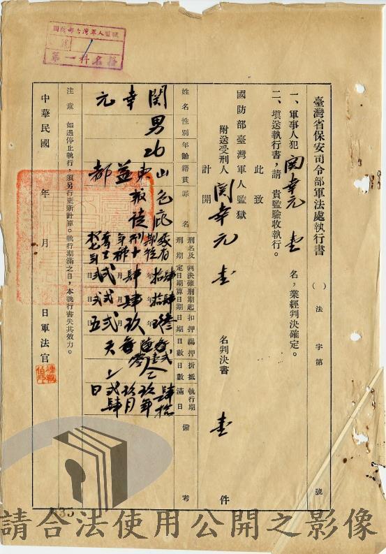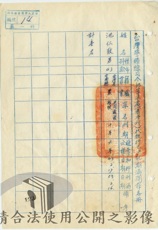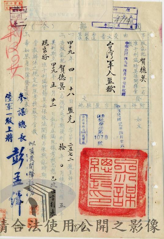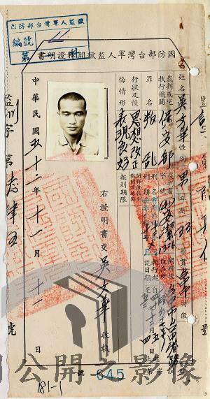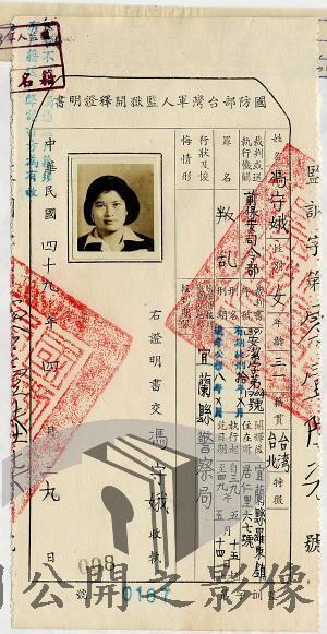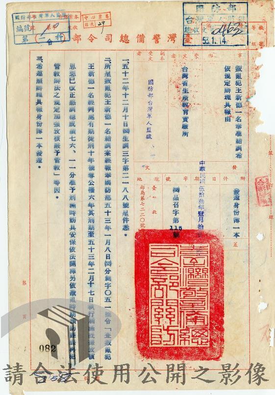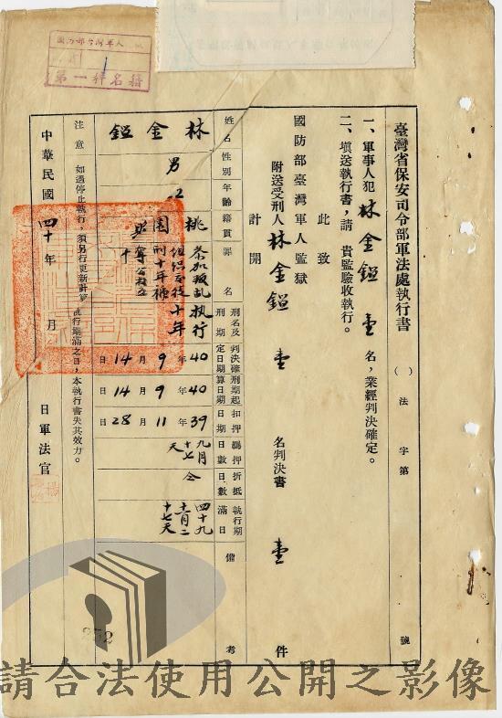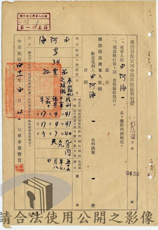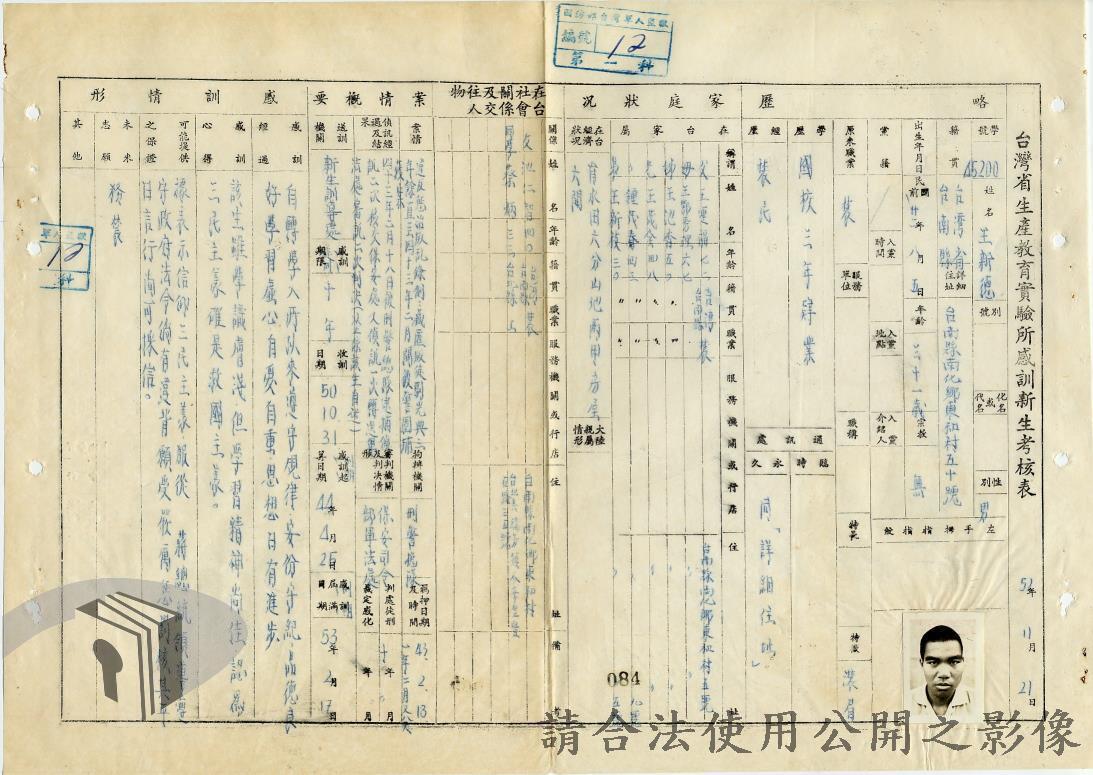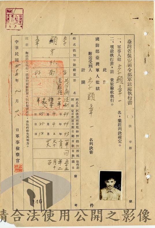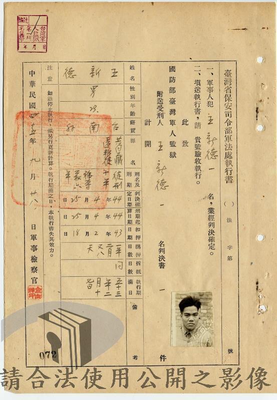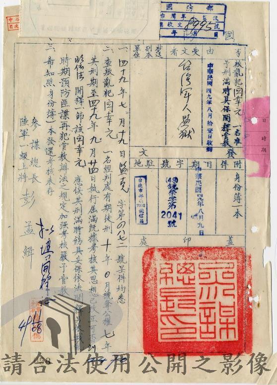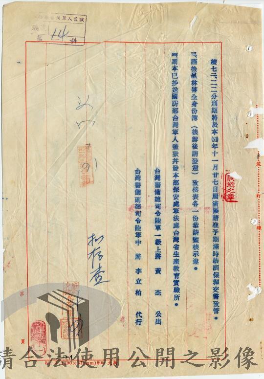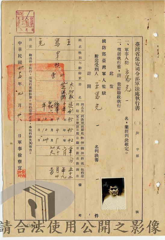 本案為39至53年間,民眾因案獲臺灣省保安司令部判決,臺灣省生產教育實驗所、臺灣警備總司令部新生訓導處後因受刑人刑期執行屆滿,且達到考核標準,函請國防部臺灣軍人監獄協助辦理出獄手續,軍人監獄函請國防部軍法局、國防部軍法覆判局轉陳該部准予具保開釋,並檢送開釋證書予生產教育實驗所、新生訓導處。附臺灣省生產教育實驗所新生考核表、國防部臺灣軍人監獄開釋證明書、臺灣省保安司令部判決書、臺灣省保安司令部軍法處執行書等文件資料。