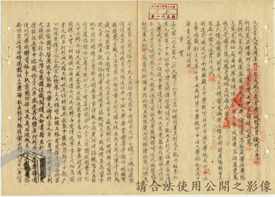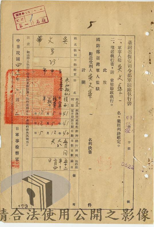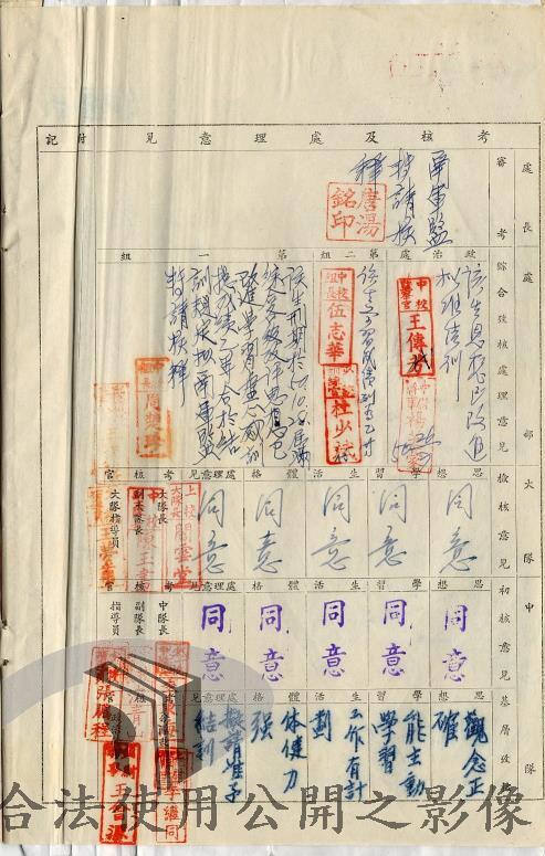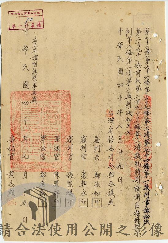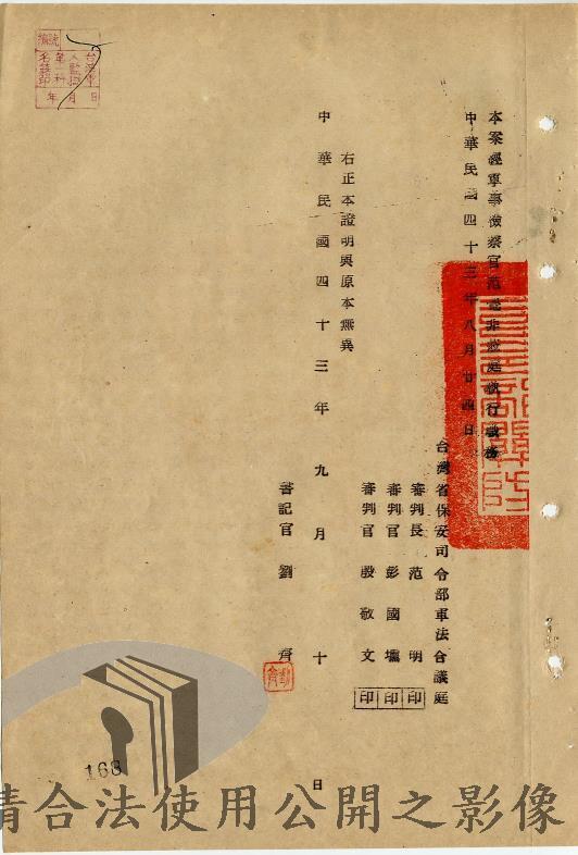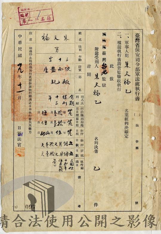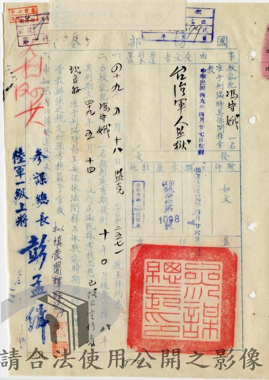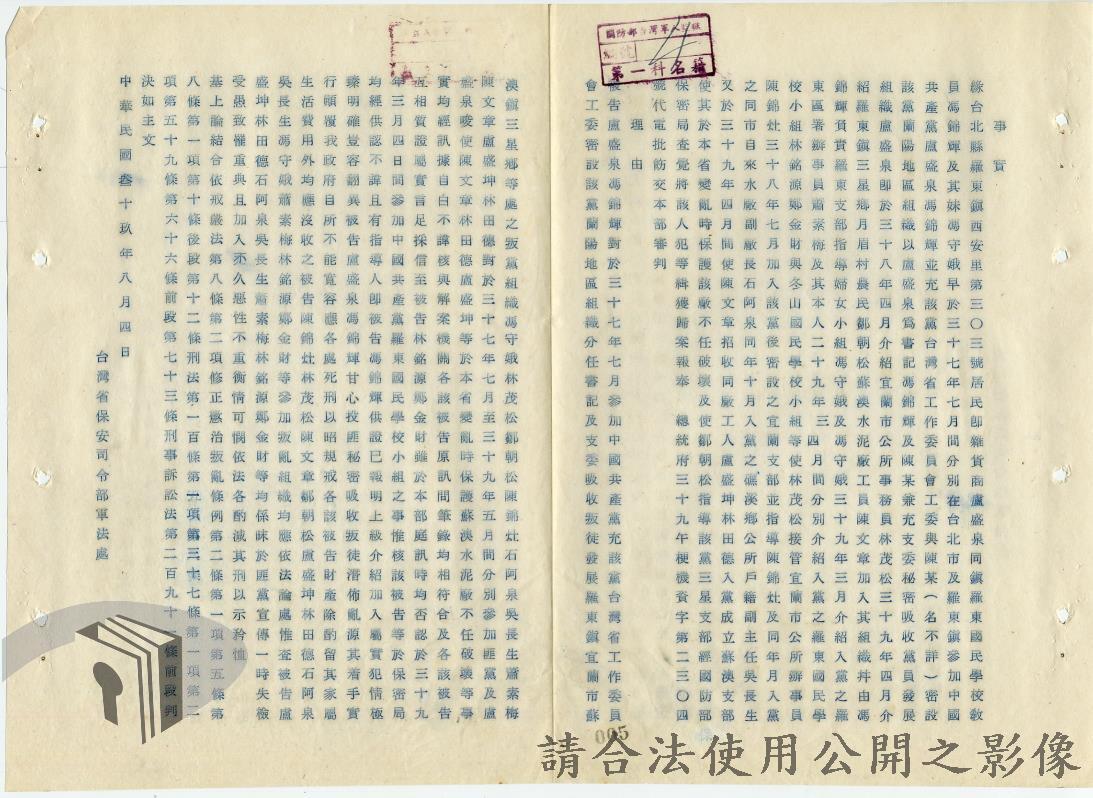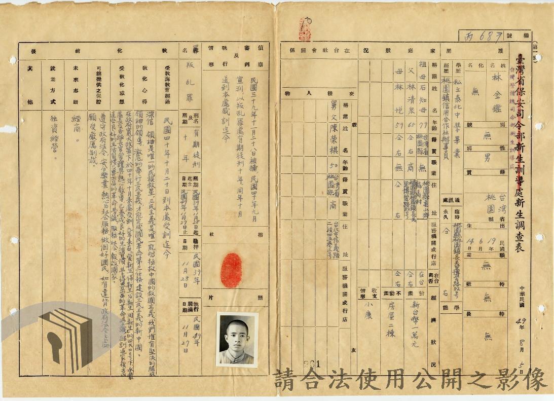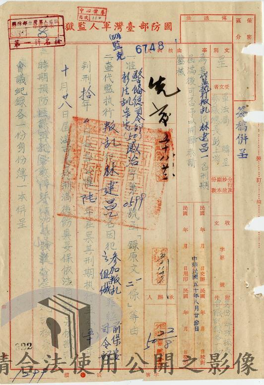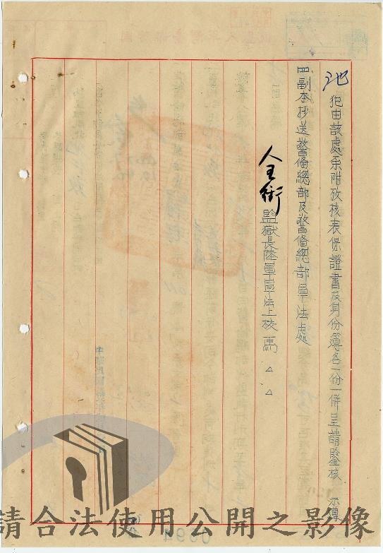 本案為39至53年間,民眾因案獲臺灣省保安司令部判決,臺灣省生產教育實驗所、臺灣警備總司令部新生訓導處後因受刑人刑期執行屆滿,且達到考核標準,函請國防部臺灣軍人監獄協助辦理出獄手續,軍人監獄函請國防部軍法局、國防部軍法覆判局轉陳該部准予具保開釋,並檢送開釋證書予生產教育實驗所、新生訓導處。附臺灣省生產教育實驗所新生考核表、國防部臺灣軍人監獄開釋證明書、臺灣省保安司令部判決書、臺灣省保安司令部軍法處執行書等文件資料。