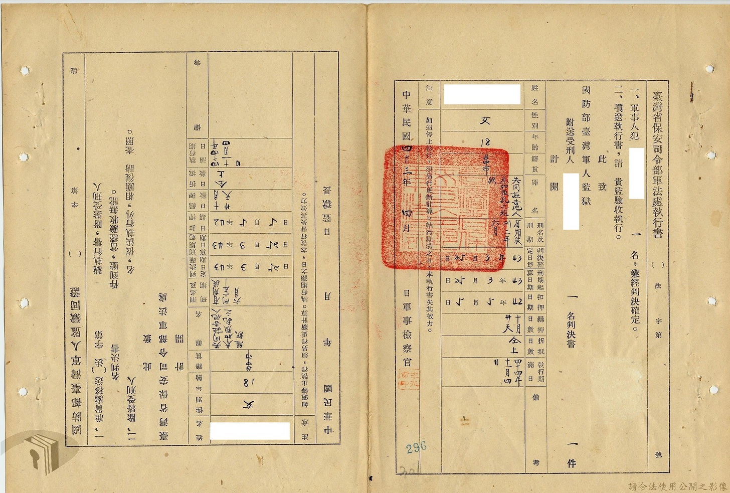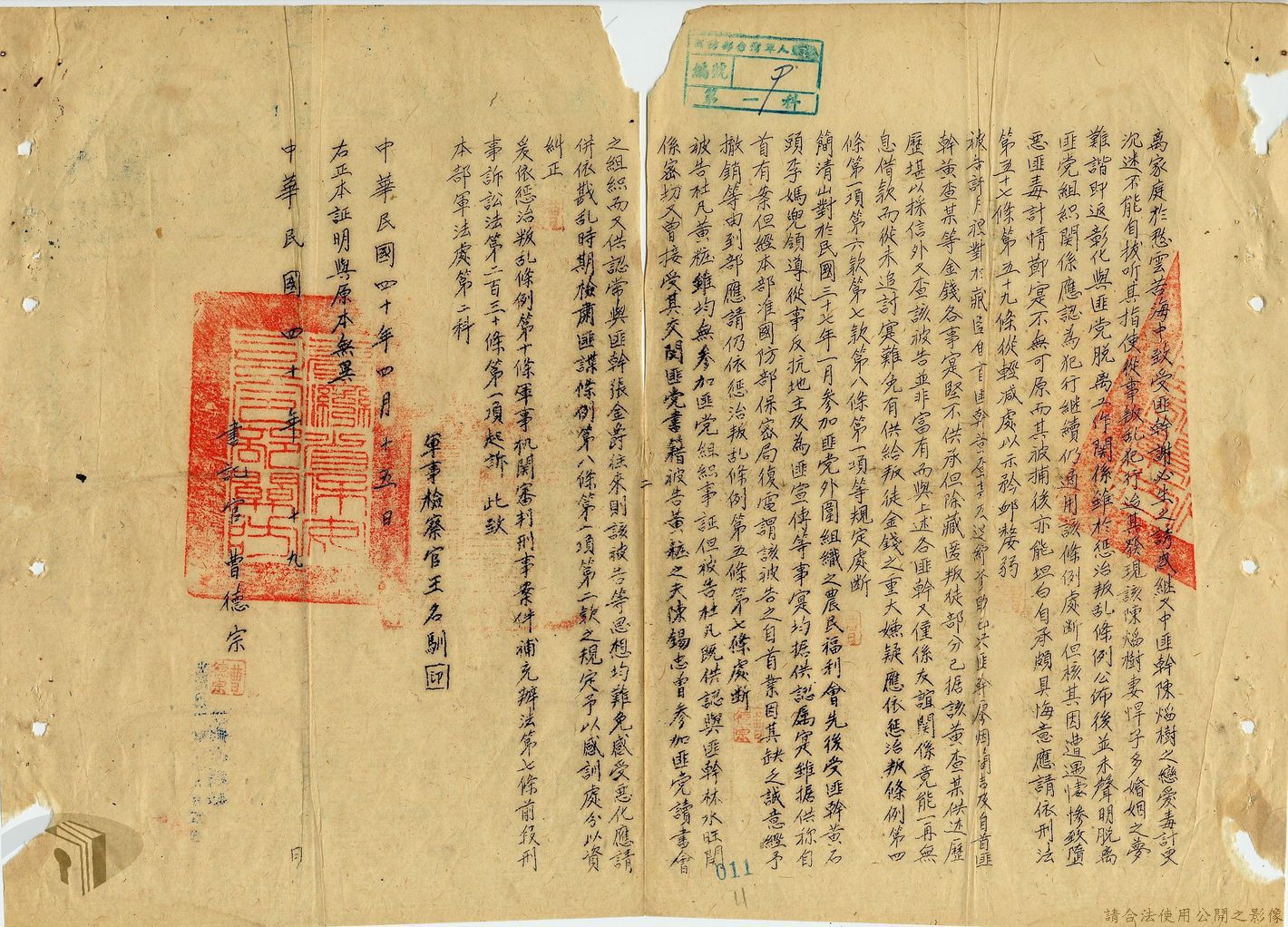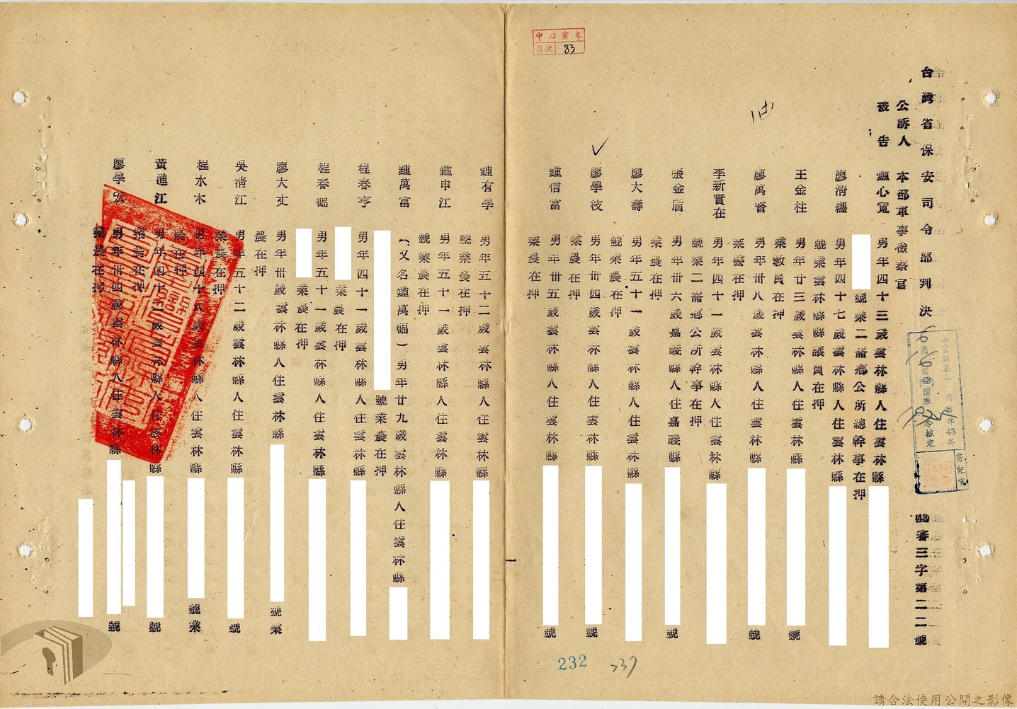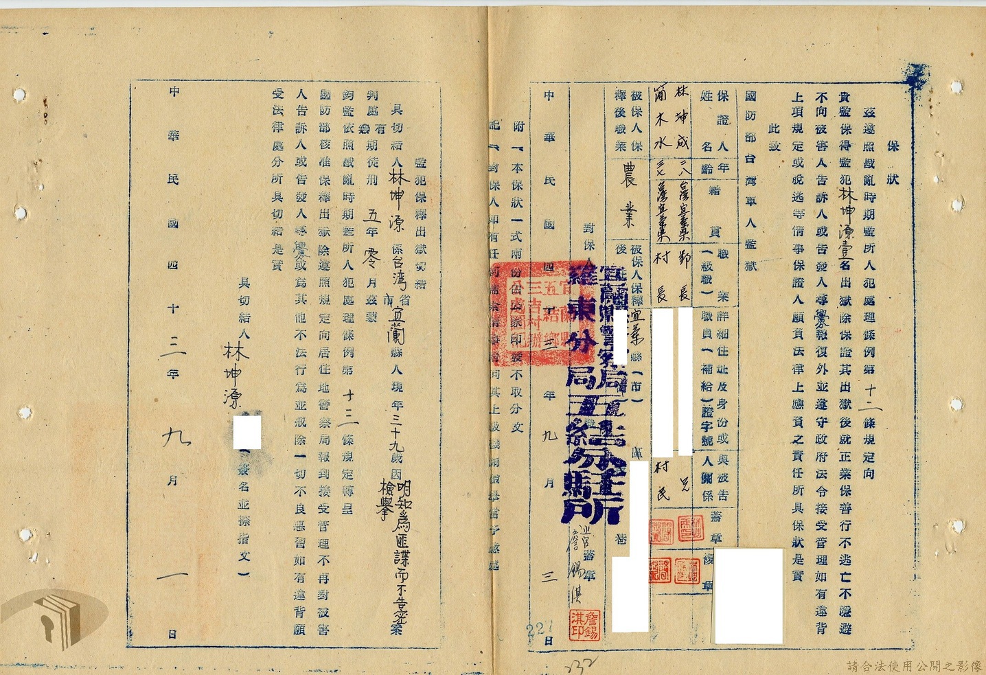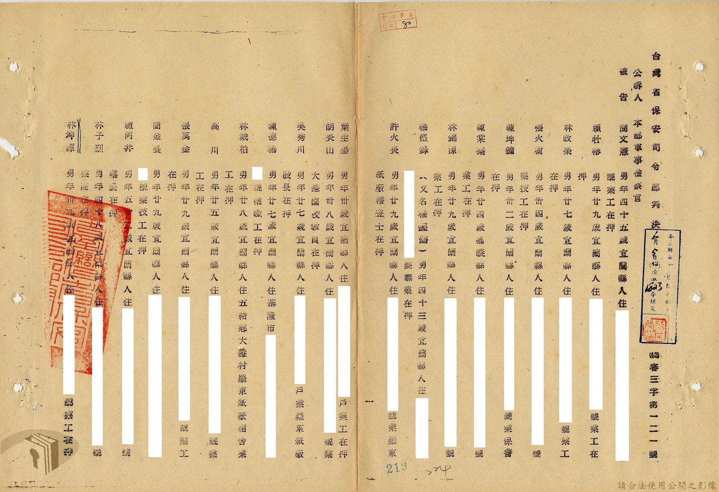 本案為40至55年間,有關民眾因涉嫌參與叛亂團體等案件,經臺灣省保安司令部等機關以叛亂罪判處有期徒刑並褫奪公權,以及後續發監執行與服刑期滿後之處置情形。全案包括臺灣省保安司令部等機關之判決書、執行書、新生考核表、證明書及受刑人出獄時填具之保證書等資料。