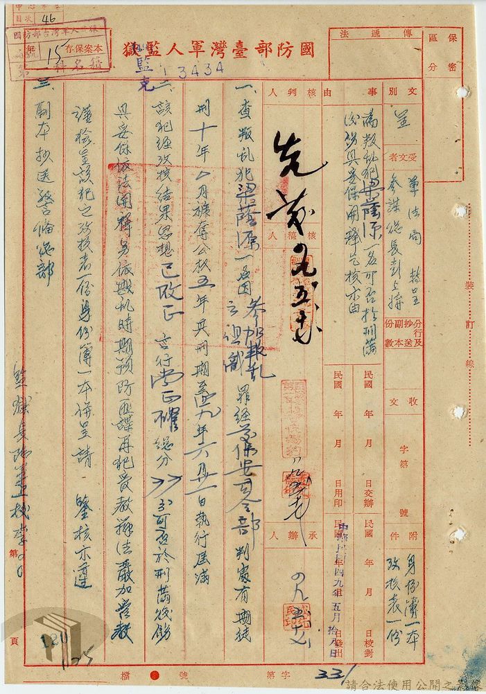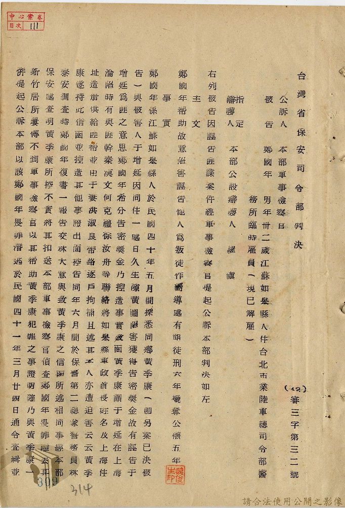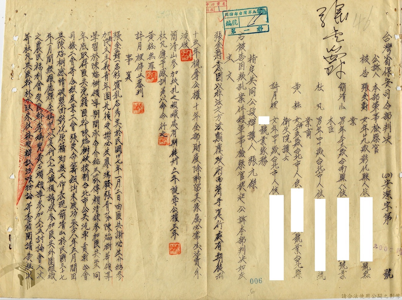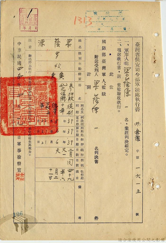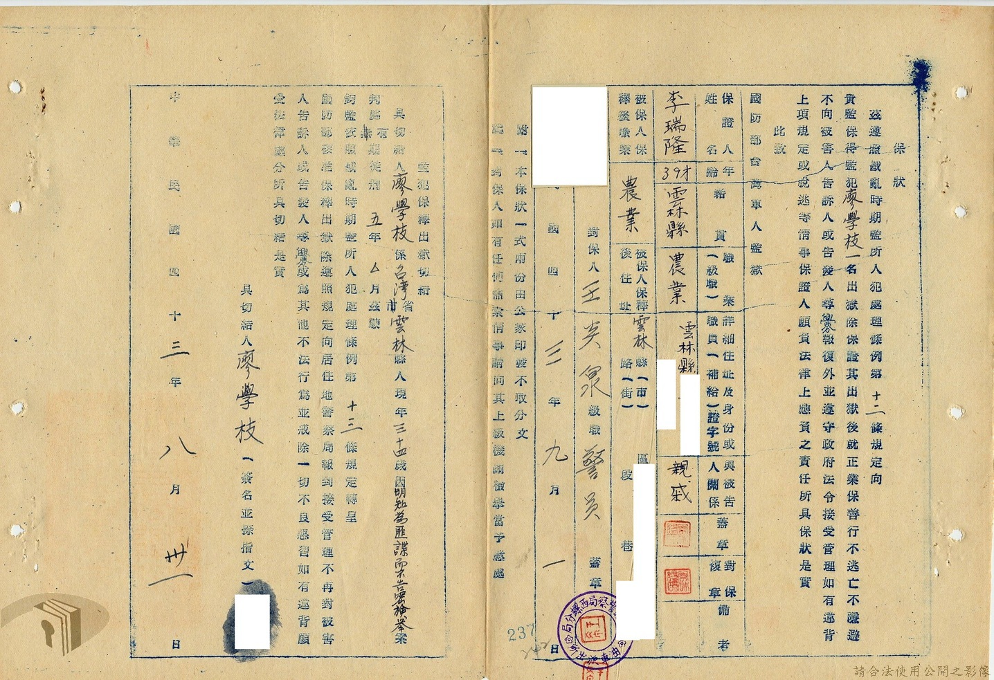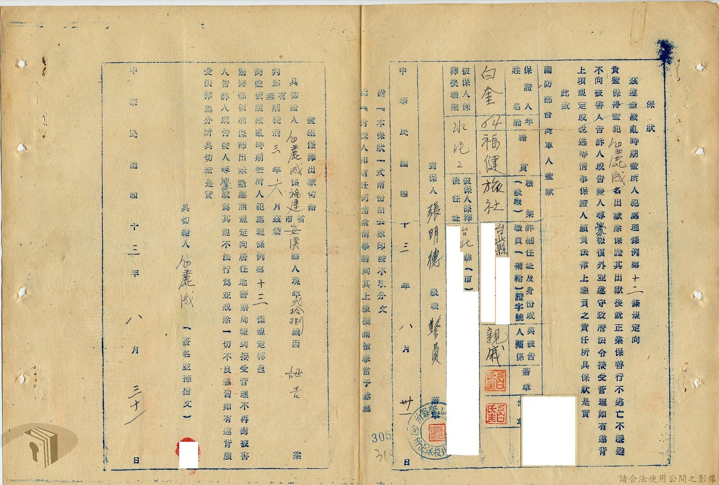 本案為40至55年間,有關民眾因涉嫌參與叛亂團體等案件,經臺灣省保安司令部等機關以叛亂罪判處有期徒刑並褫奪公權,以及後續發監執行與服刑期滿後之處置情形。全案包括臺灣省保安司令部等機關之判決書、執行書、新生考核表、證明書及受刑人出獄時填具之保證書等資料。