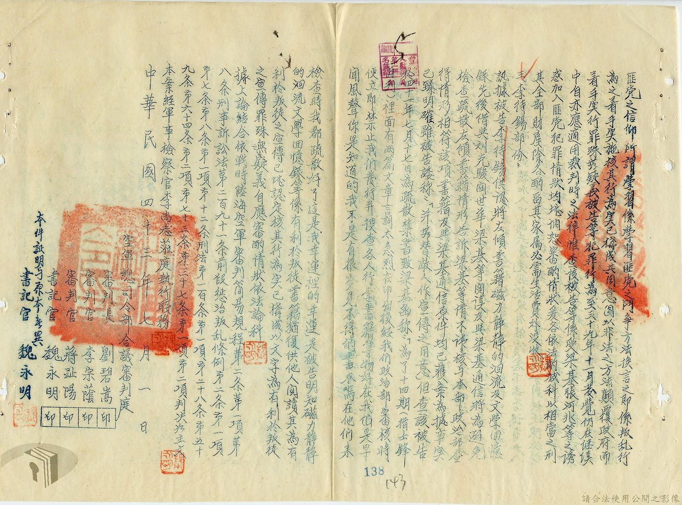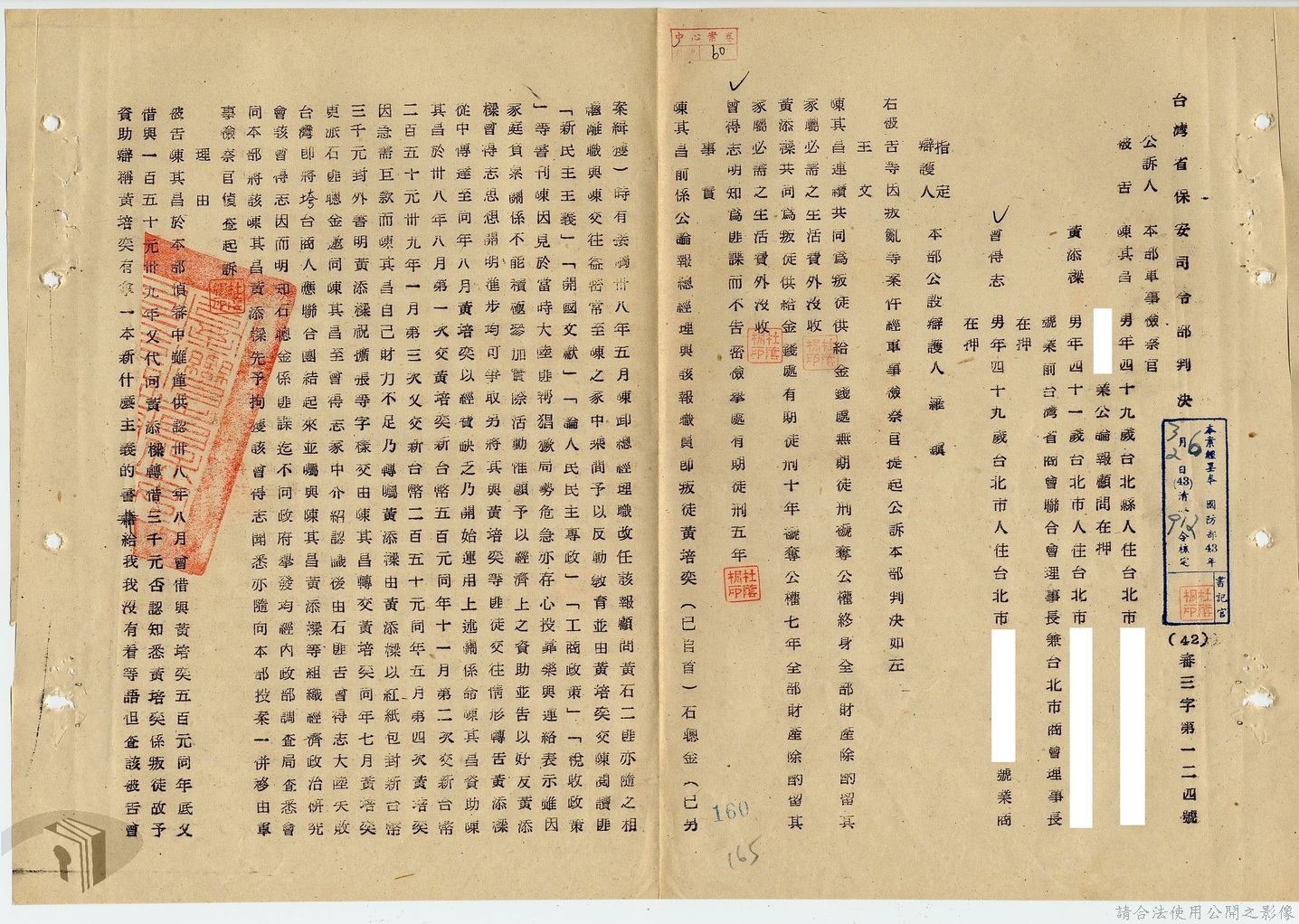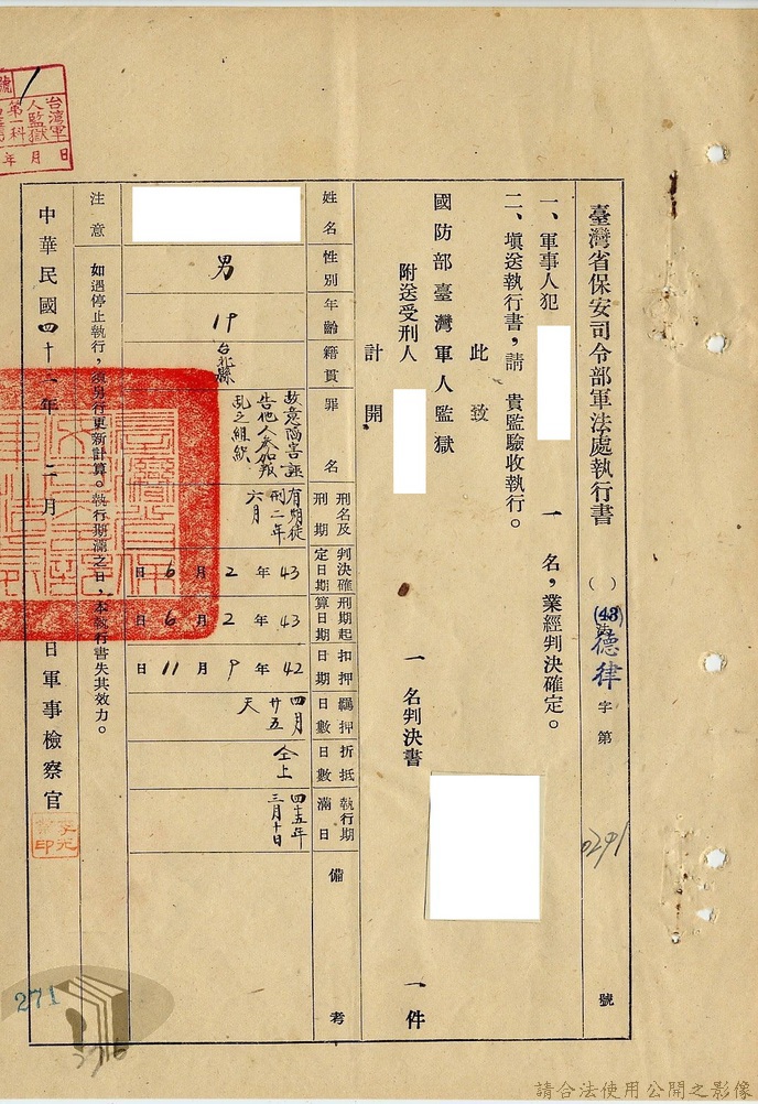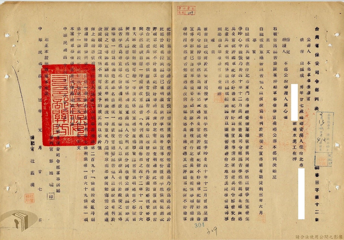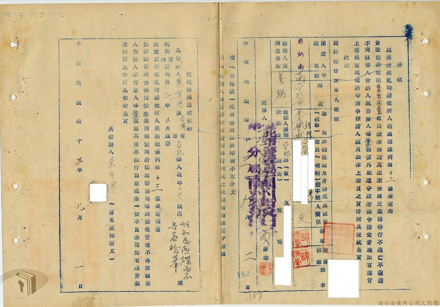 本案為40至55年間,有關民眾因涉嫌參與叛亂團體等案件,經臺灣省保安司令部等機關以叛亂罪判處有期徒刑並褫奪公權,以及後續發監執行與服刑期滿後之處置情形。全案包括臺灣省保安司令部等機關之判決書、執行書、新生考核表、證明書及受刑人出獄時填具之保證書等資料。