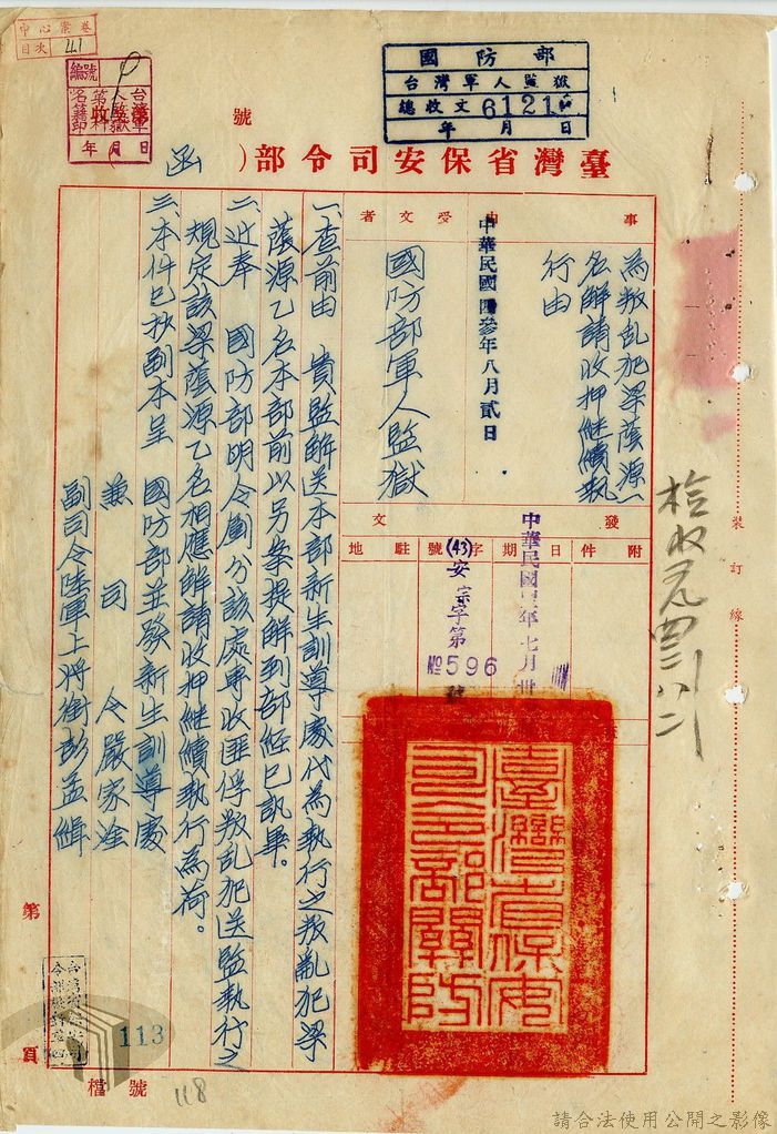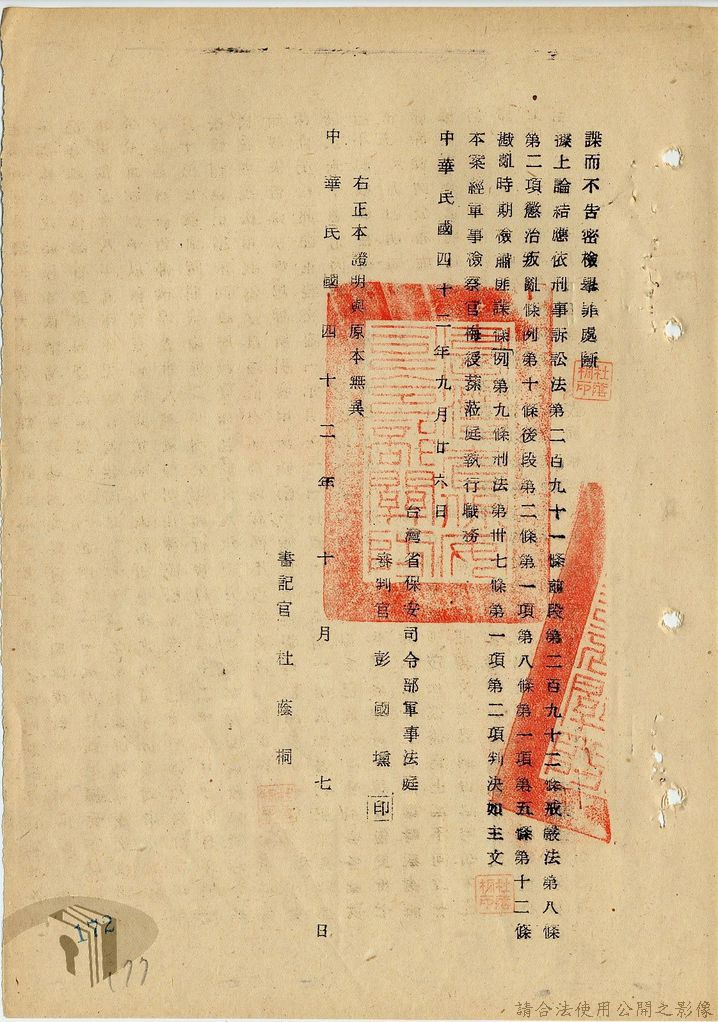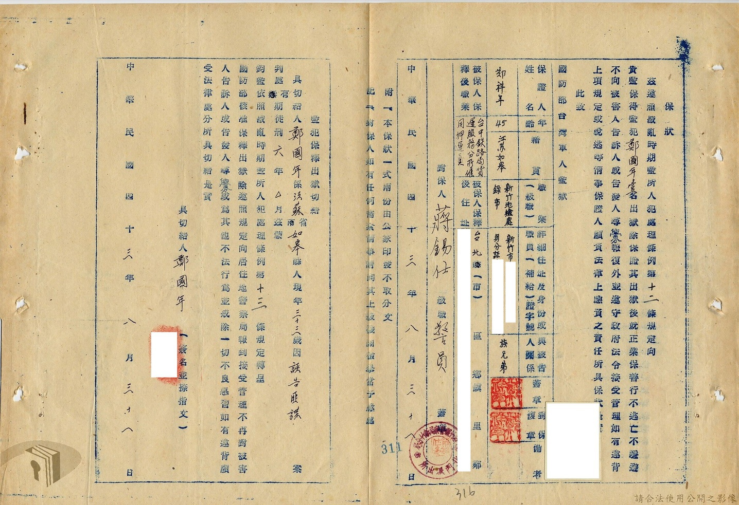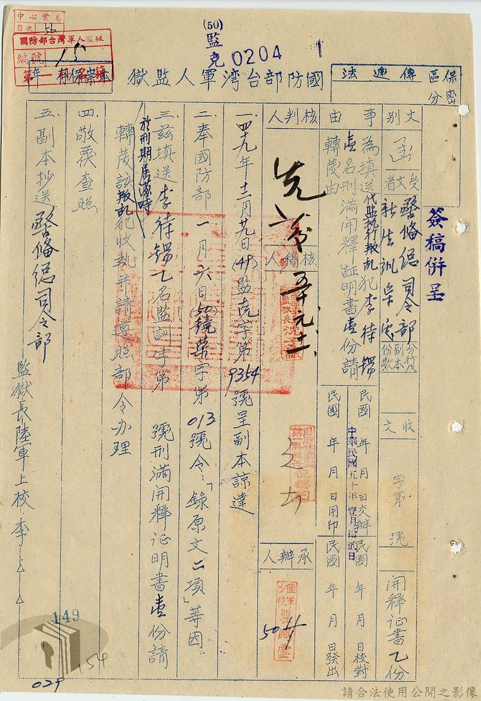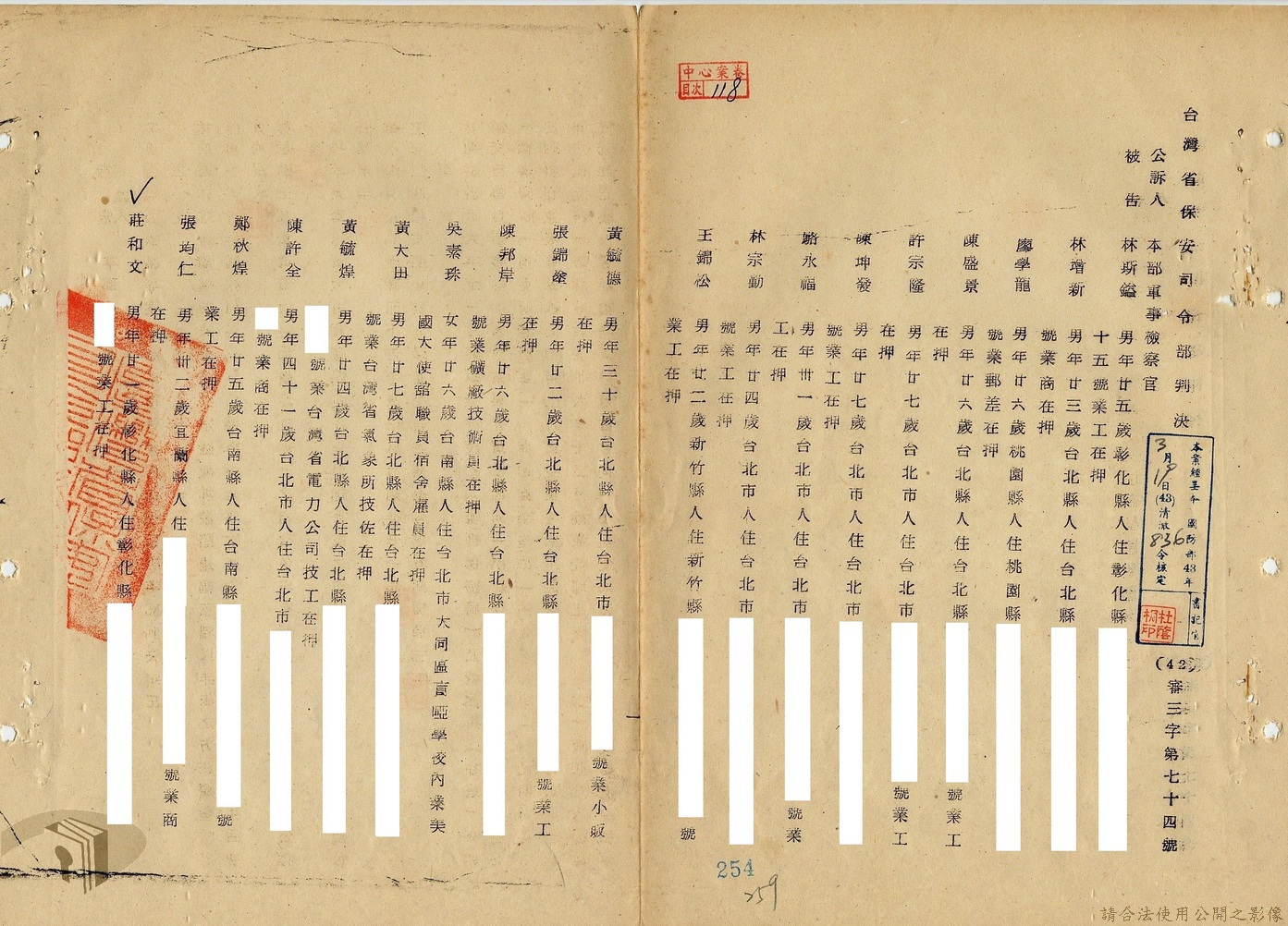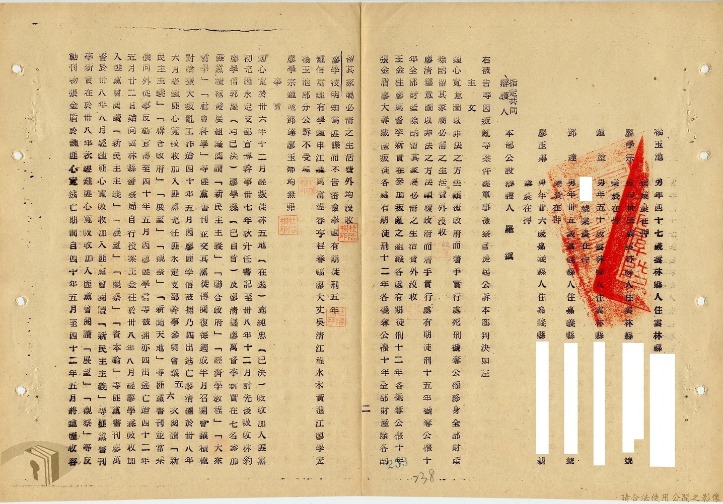 本案為40至55年間,有關民眾因涉嫌參與叛亂團體等案件,經臺灣省保安司令部等機關以叛亂罪判處有期徒刑並褫奪公權,以及後續發監執行與服刑期滿後之處置情形。全案包括臺灣省保安司令部等機關之判決書、執行書、新生考核表、證明書及受刑人出獄時填具之保證書等資料。
