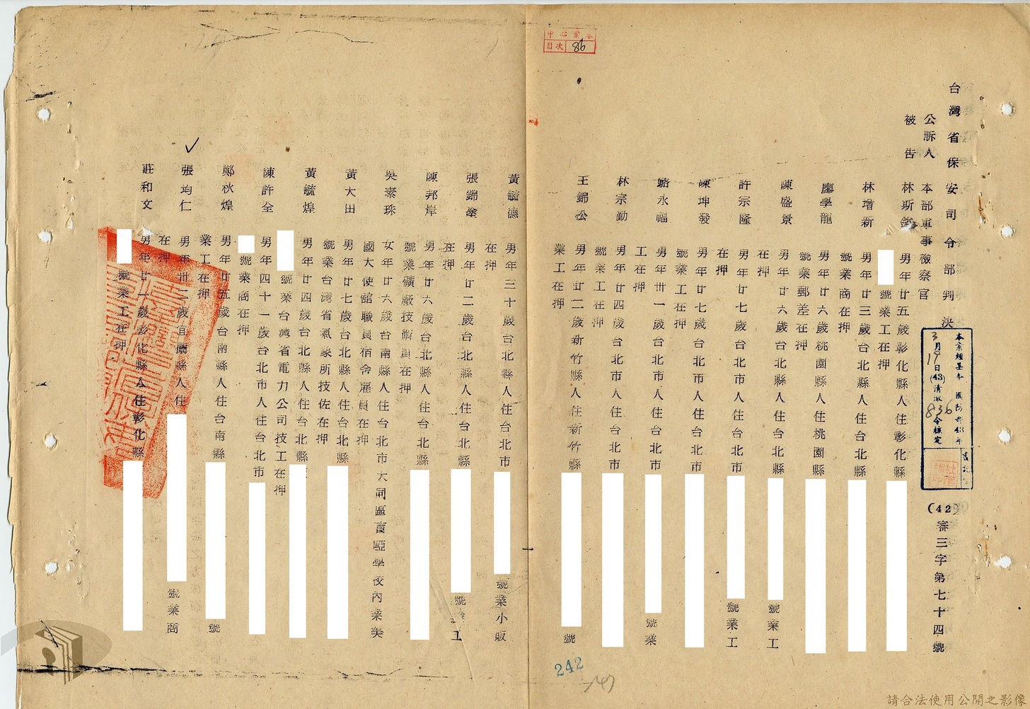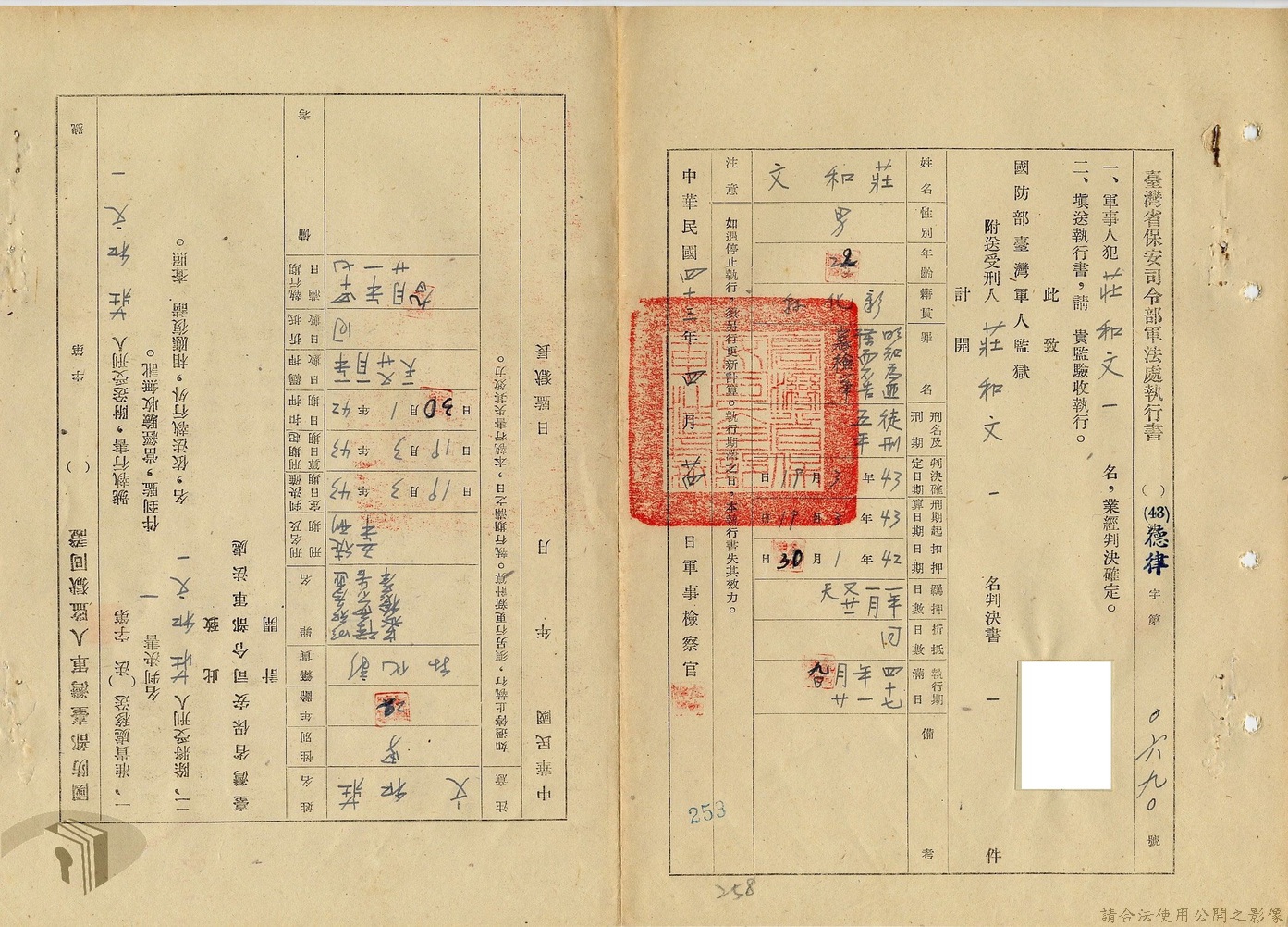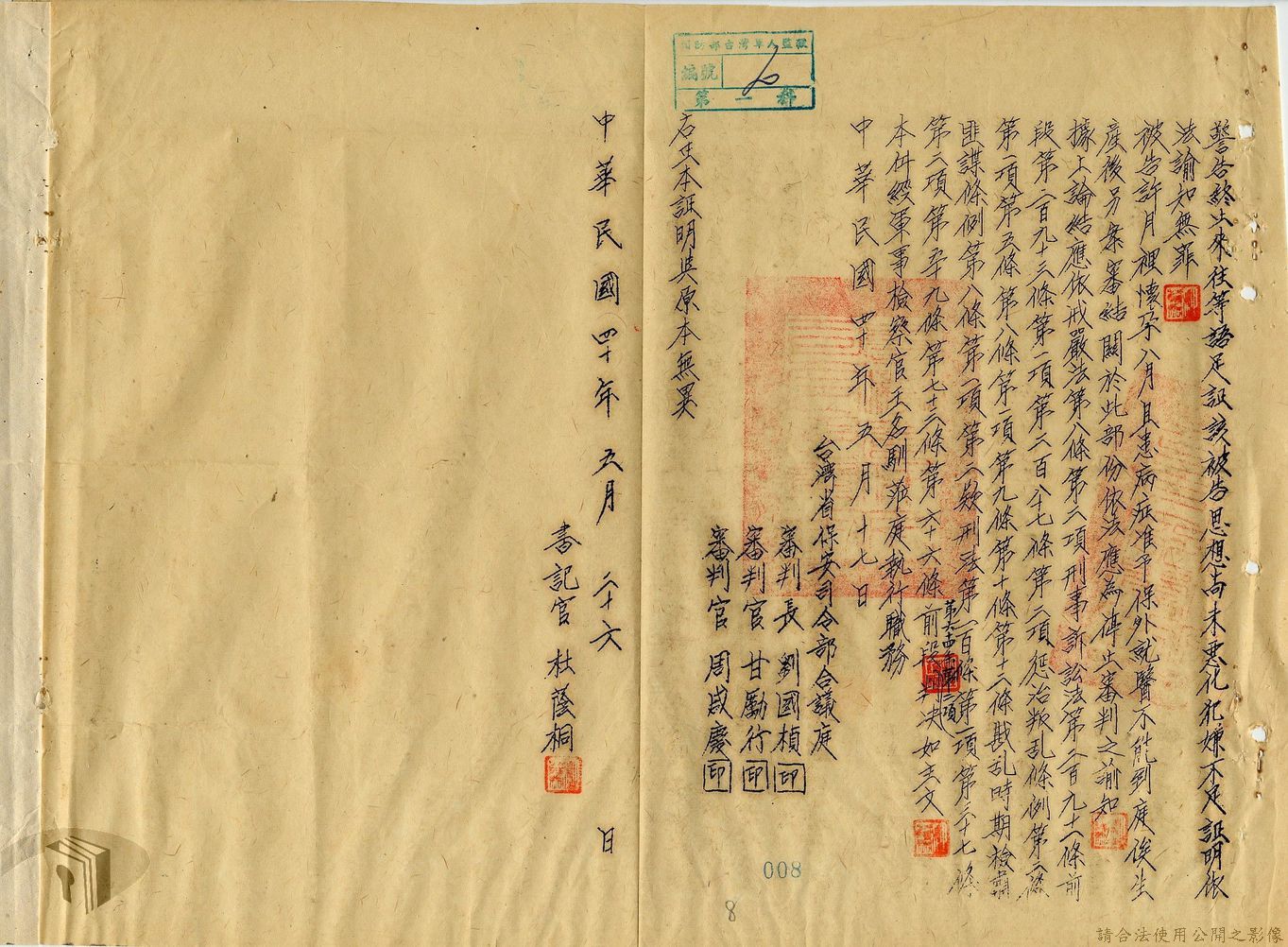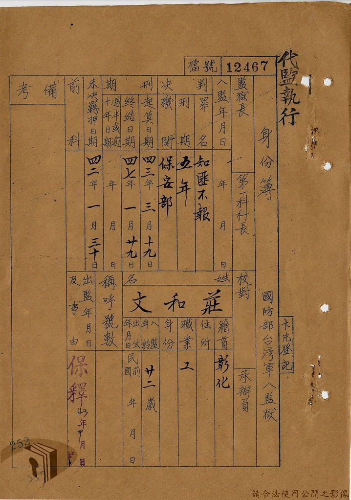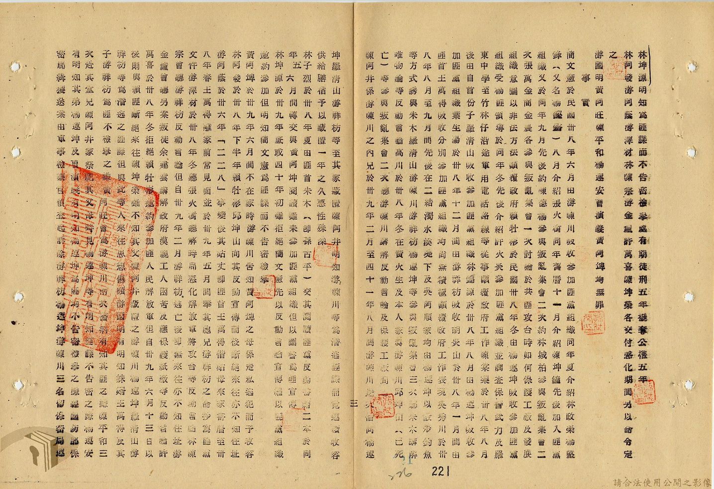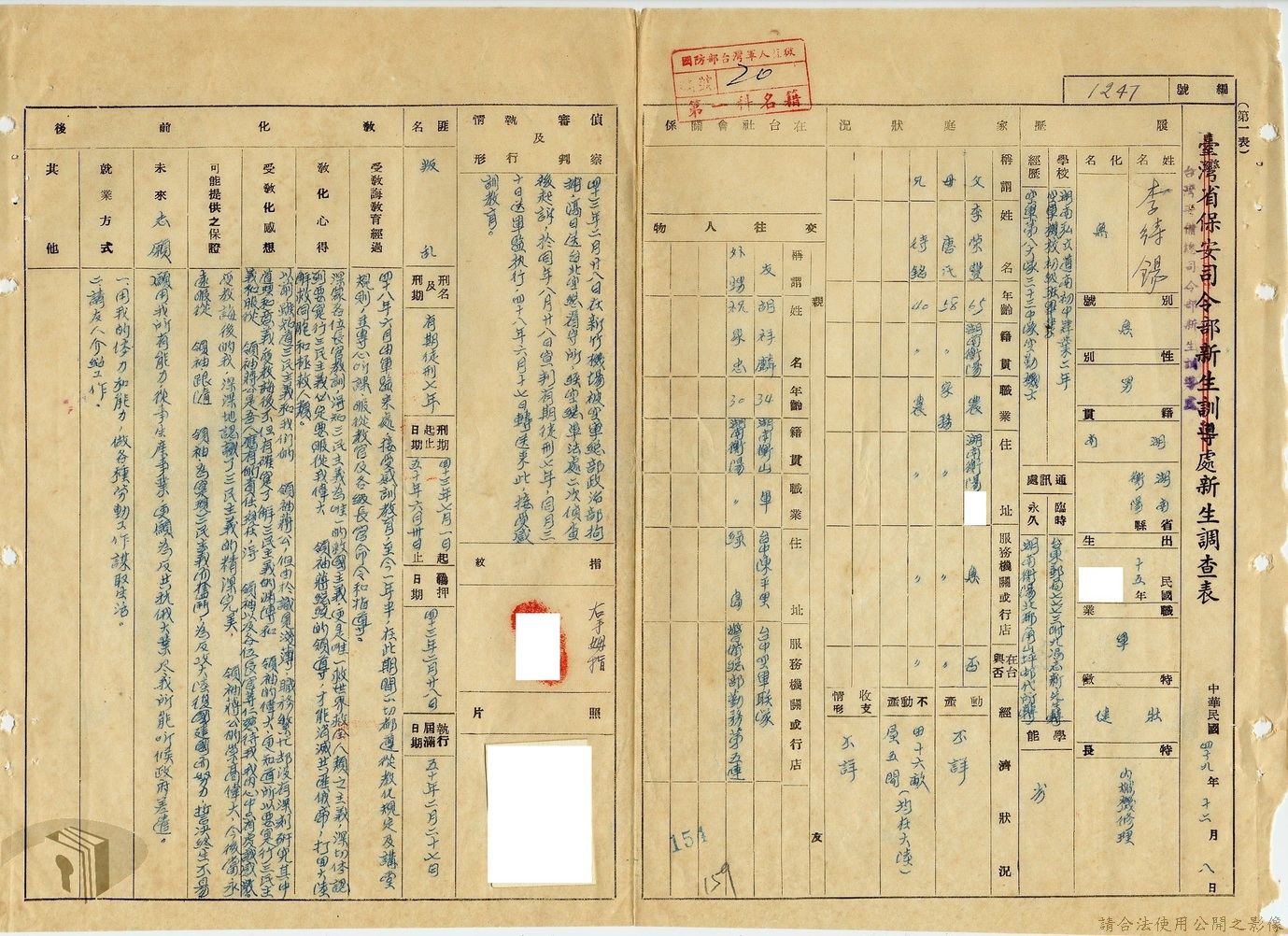 本案為40至55年間,有關民眾因涉嫌參與叛亂團體等案件,經臺灣省保安司令部等機關以叛亂罪判處有期徒刑並褫奪公權,以及後續發監執行與服刑期滿後之處置情形。全案包括臺灣省保安司令部等機關之判決書、執行書、新生考核表、證明書及受刑人出獄時填具之保證書等資料。