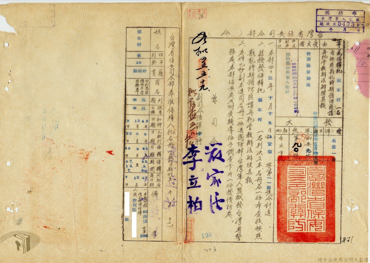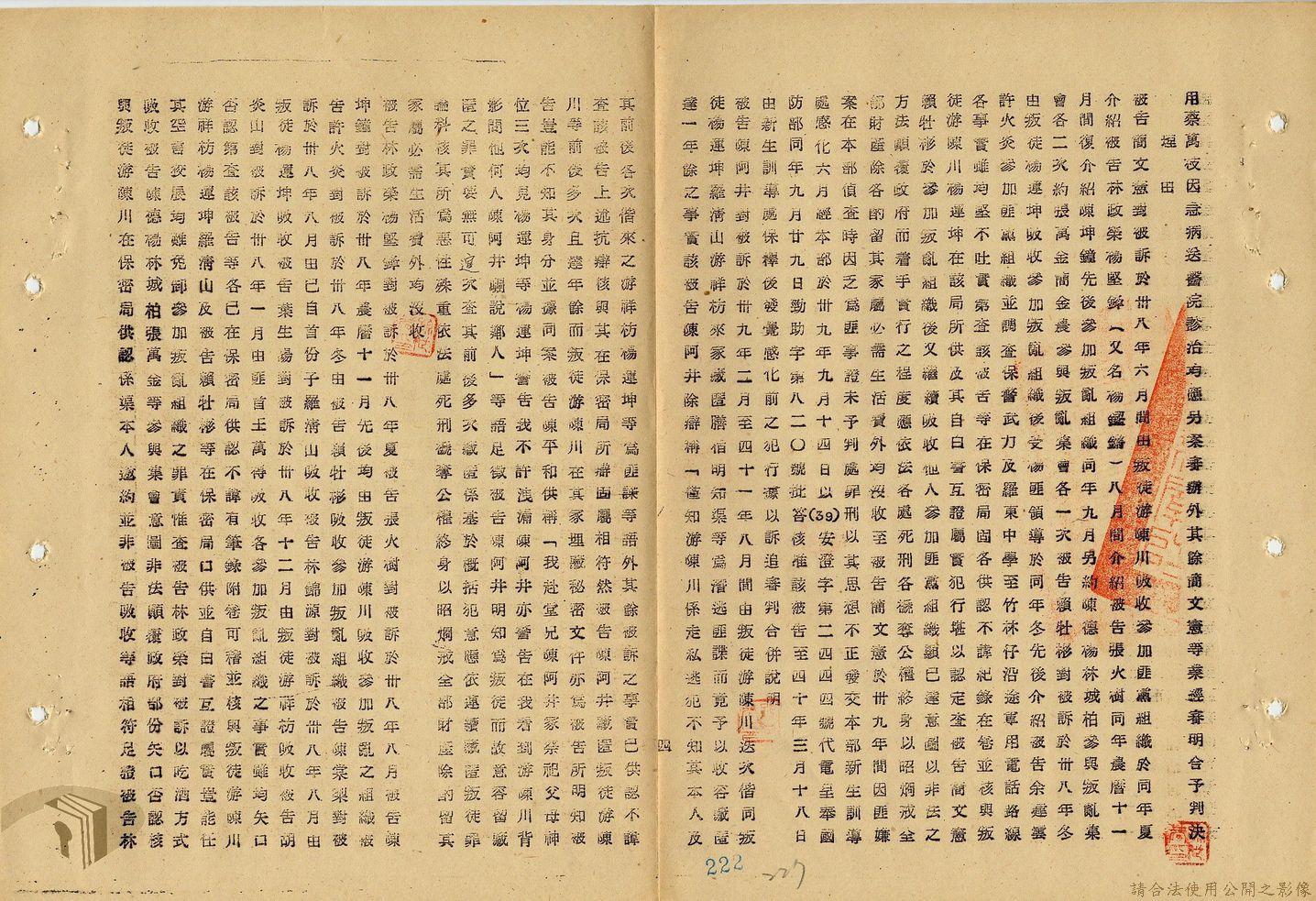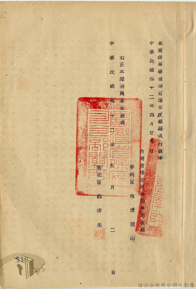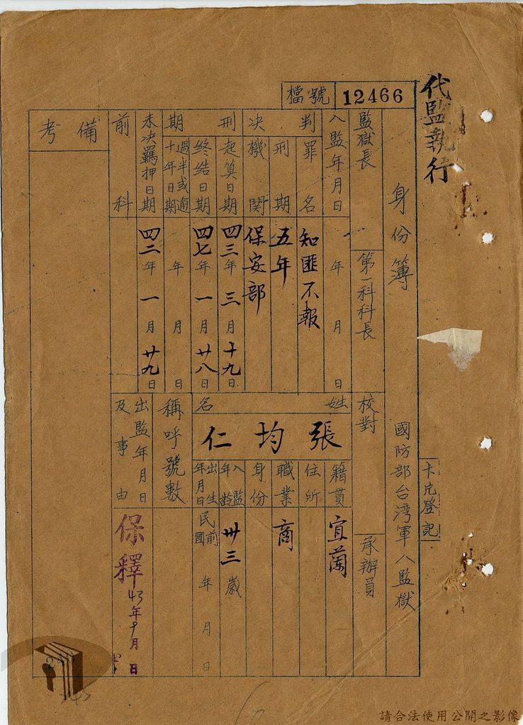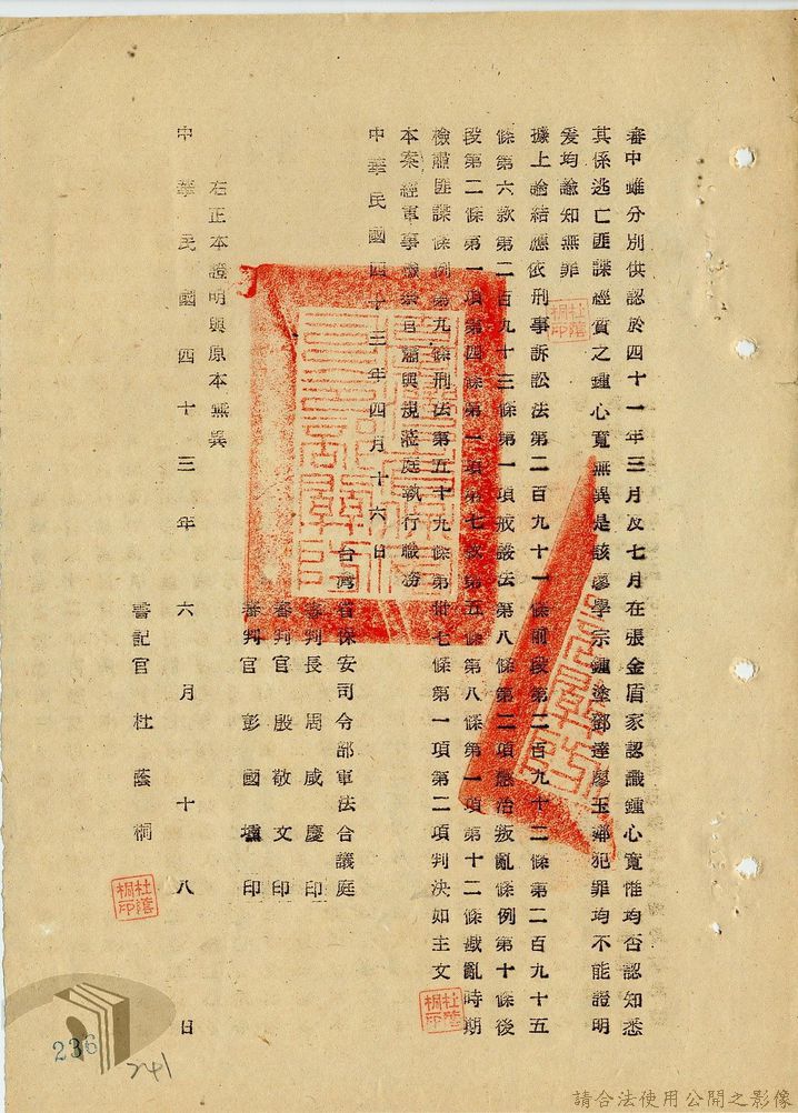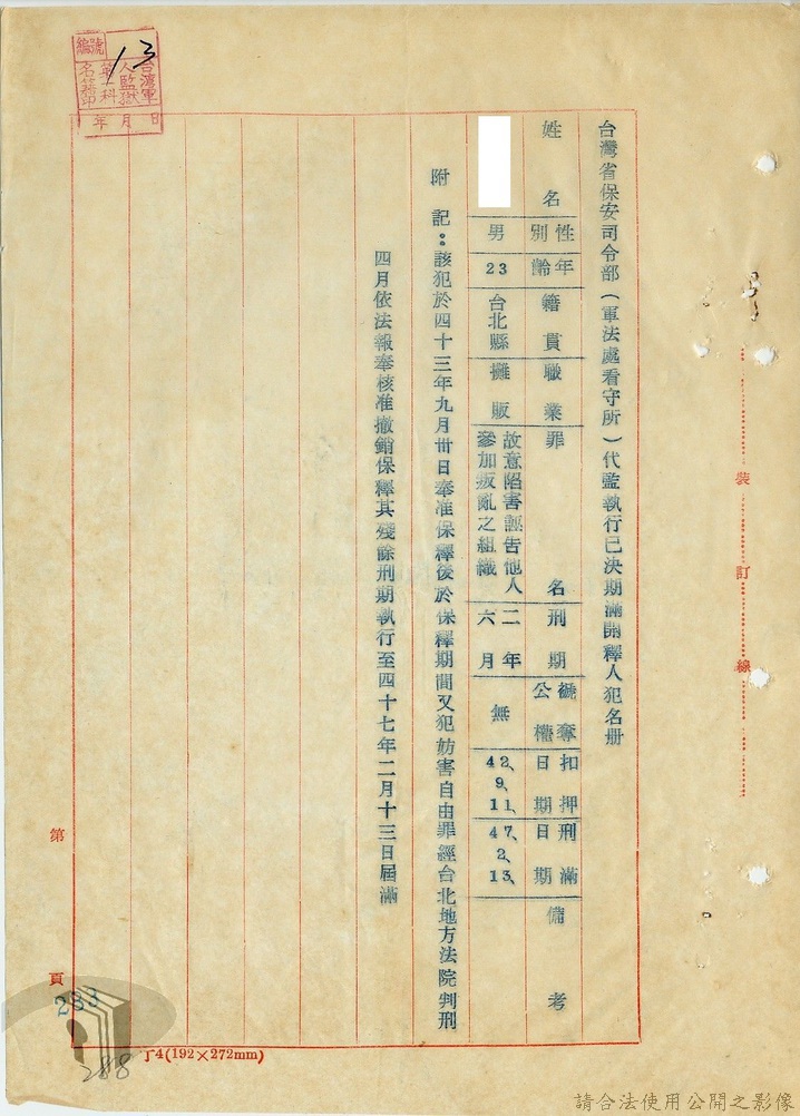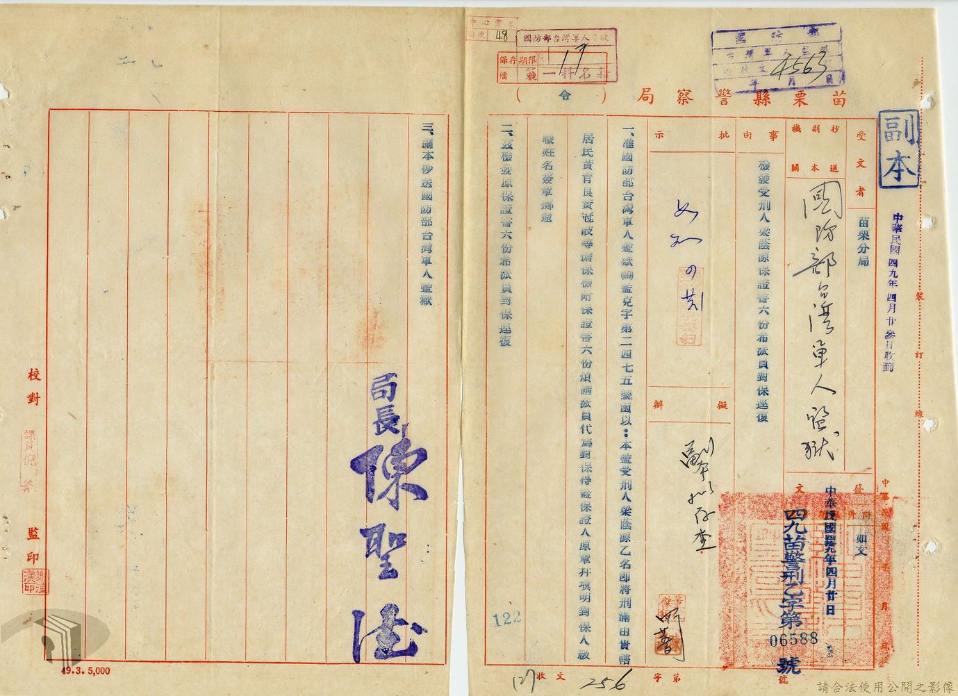 本案為40至55年間,有關民眾因涉嫌參與叛亂團體等案件,經臺灣省保安司令部等機關以叛亂罪判處有期徒刑並褫奪公權,以及後續發監執行與服刑期滿後之處置情形。全案包括臺灣省保安司令部等機關之判決書、執行書、新生考核表、證明書及受刑人出獄時填具之保證書等資料。