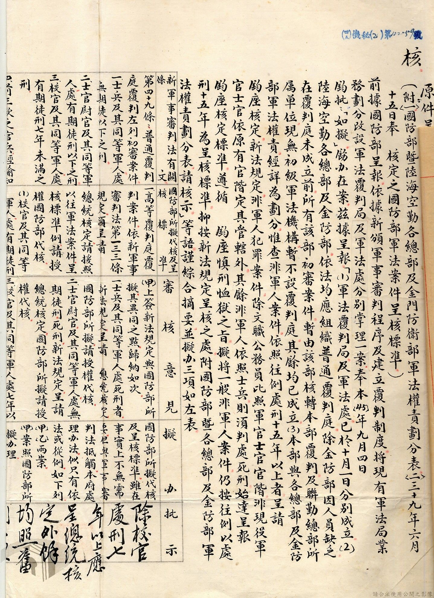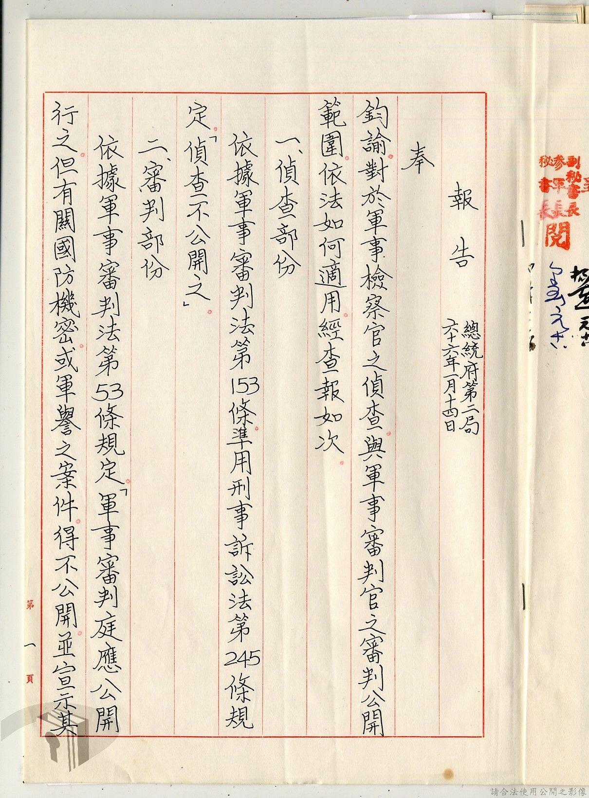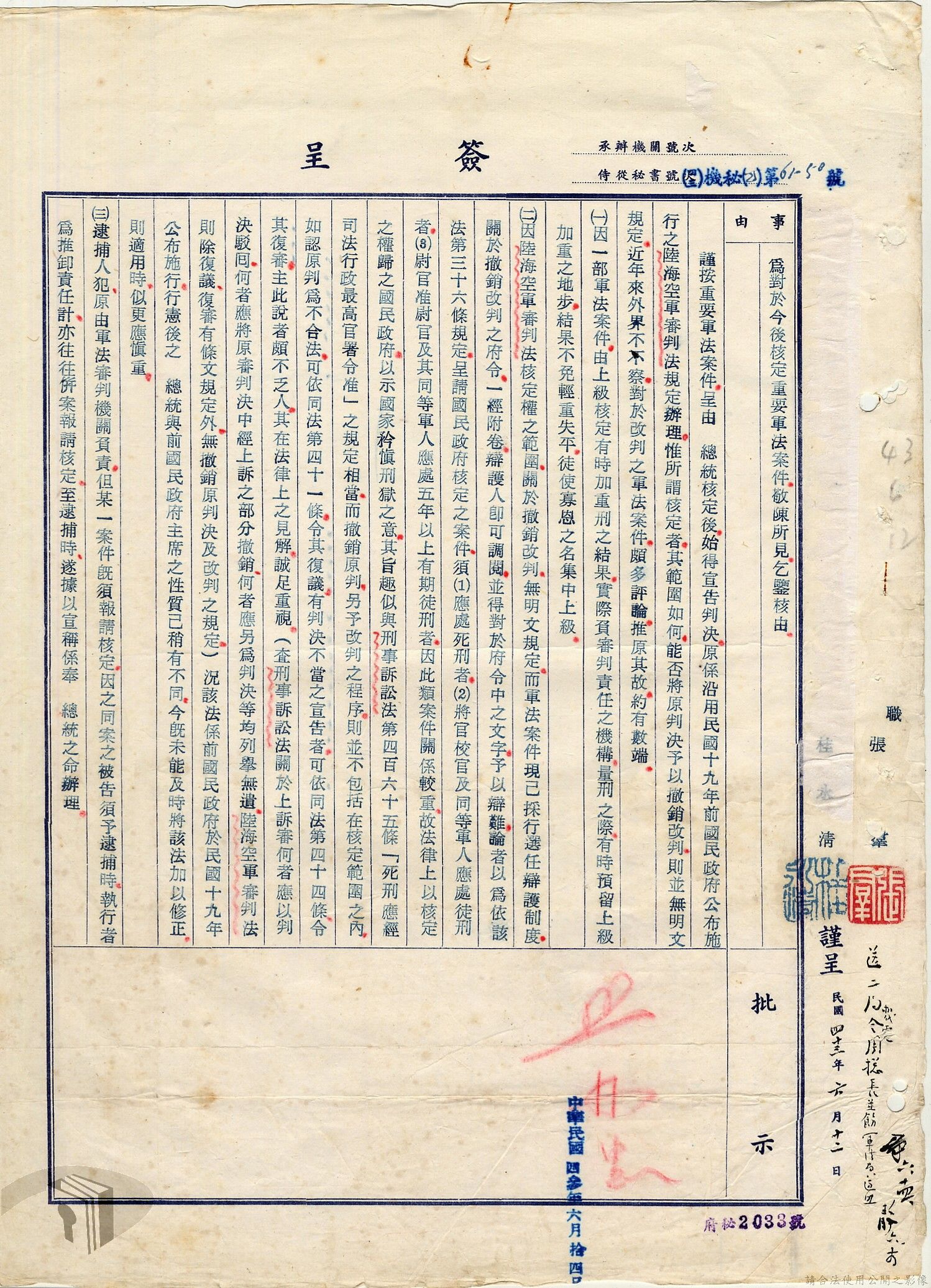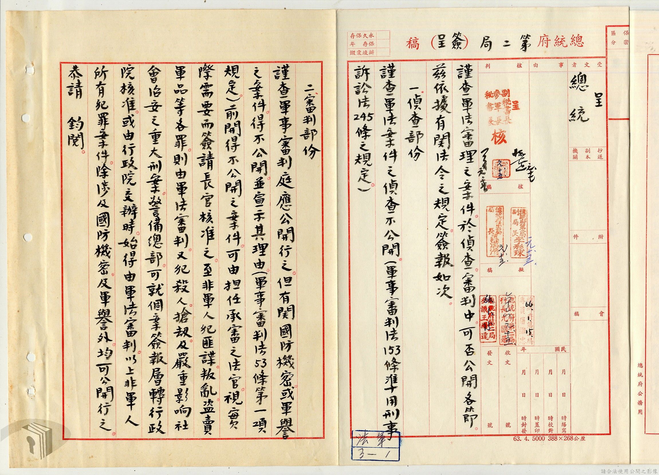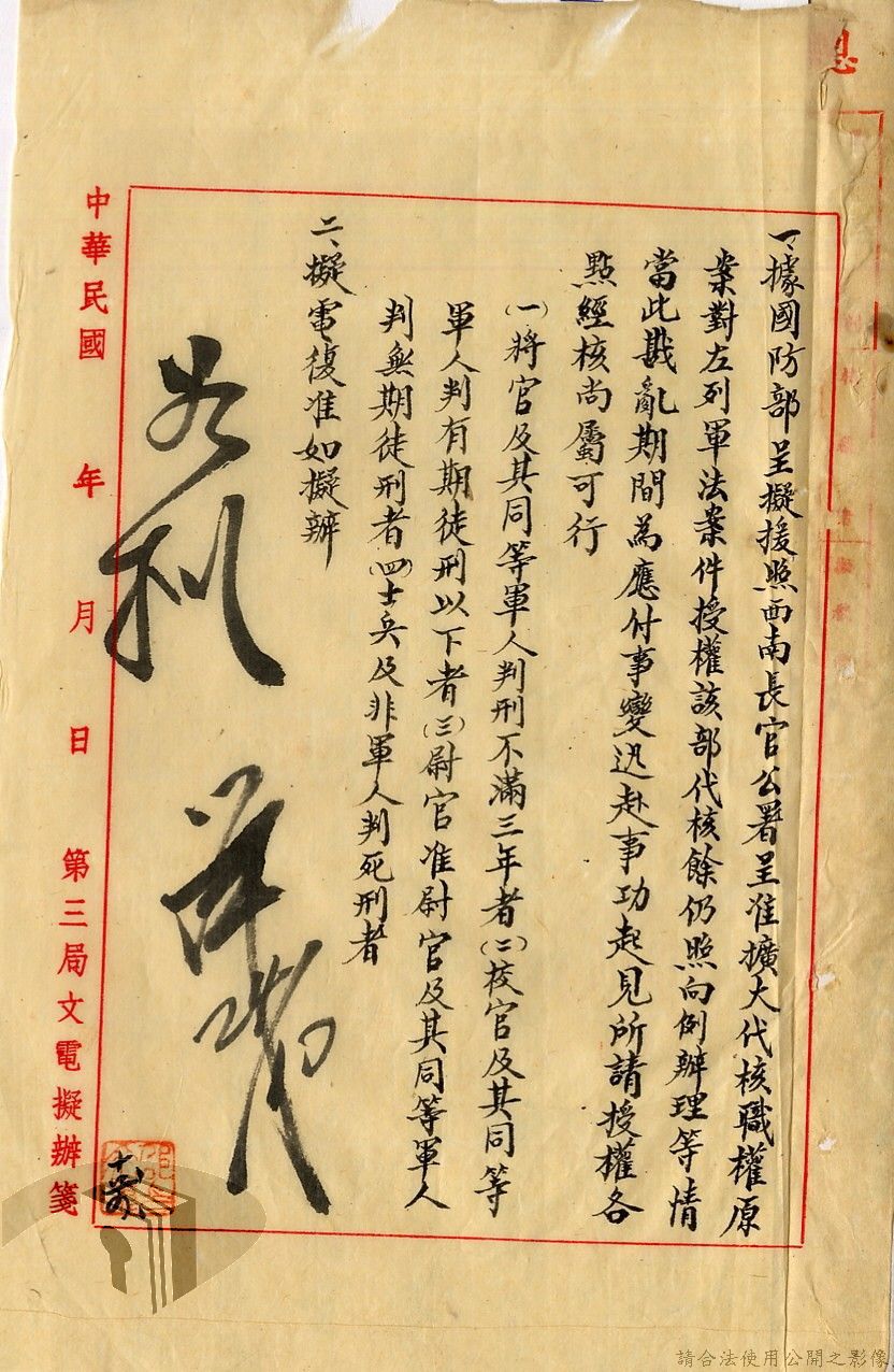 本案為38至66年間軍法案件代核及規定修訂事宜,西南行政長官公署向國防部建議將軍法案件有關將官及其同等軍人判處徒刑不滿三年者、校官及其同等軍人判處有期徒刑以下者、尉官及准尉官及其同等軍人判處無期徒刑以下者、士兵及非軍人判處死刑者均由該部代為核准而呈請代總統核示獲准,後來國防部、總統府第二局等單位研辦軍法案件相關法規之修訂事宜。