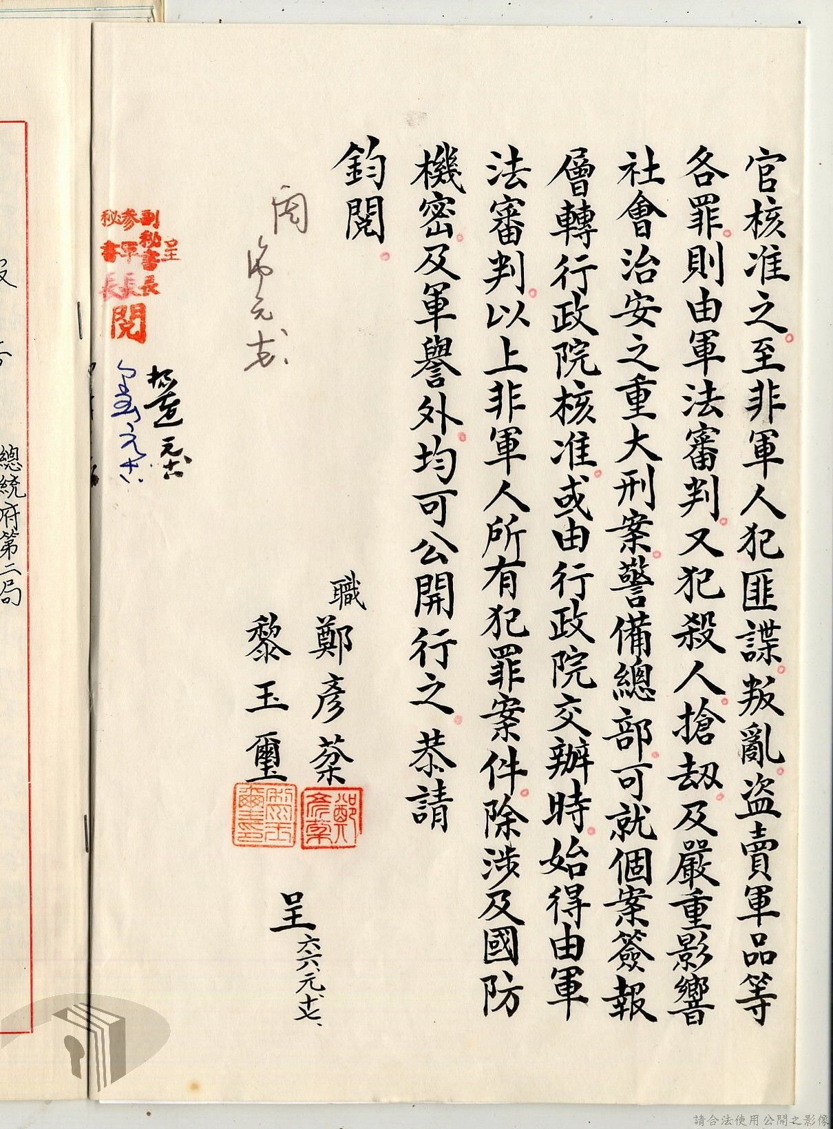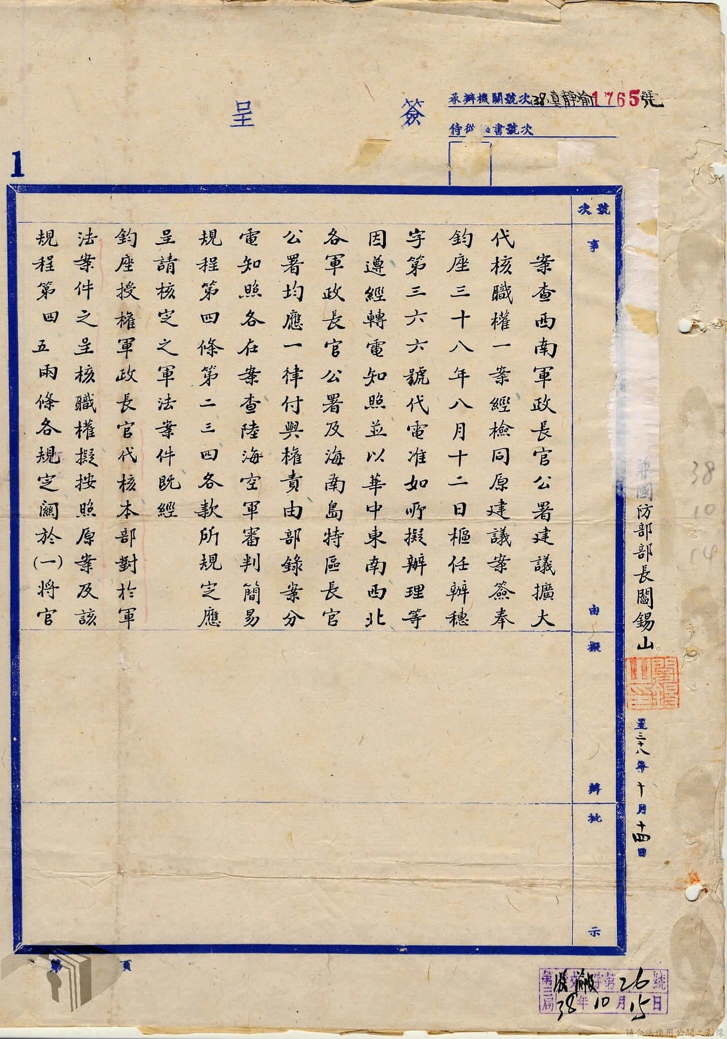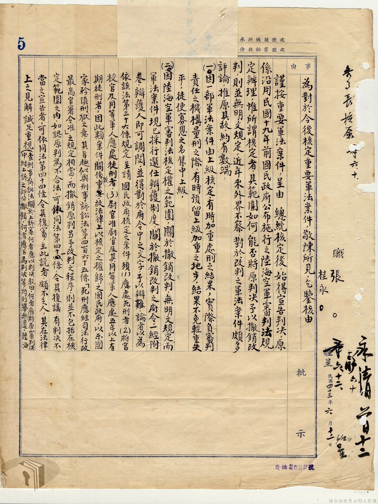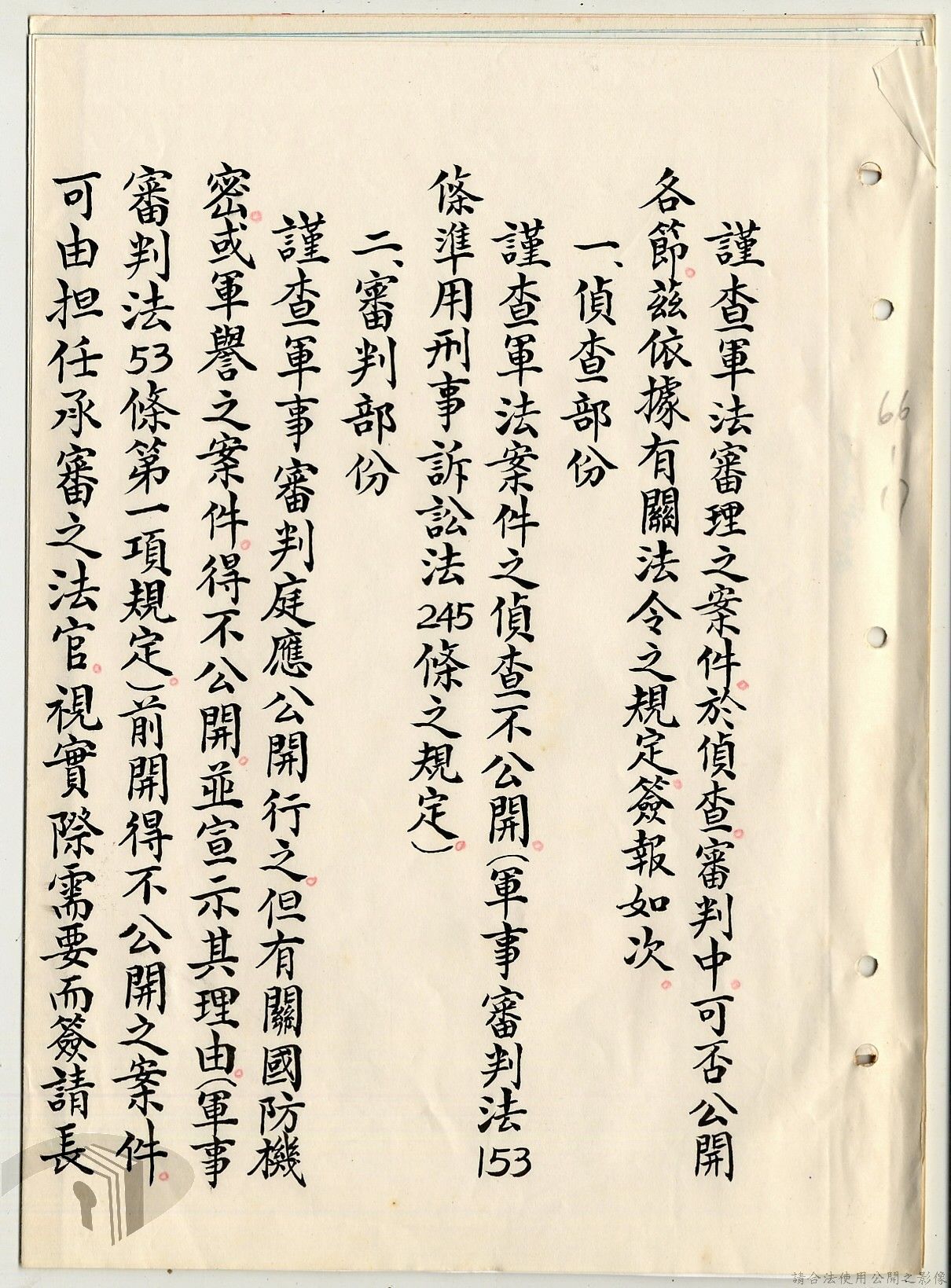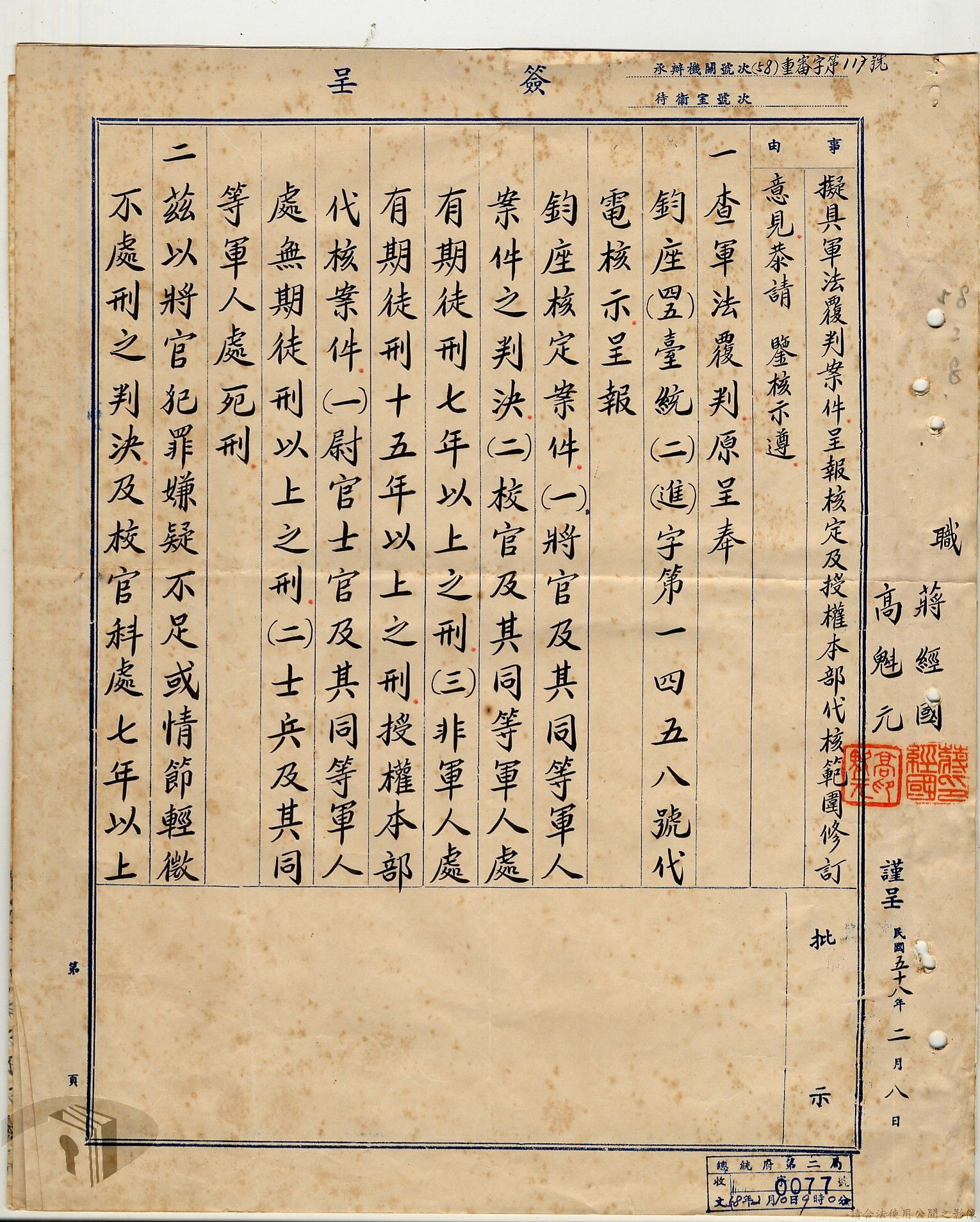 本案為38至66年間軍法案件代核及規定修訂事宜,西南行政長官公署向國防部建議將軍法案件有關將官及其同等軍人判處徒刑不滿三年者、校官及其同等軍人判處有期徒刑以下者、尉官及准尉官及其同等軍人判處無期徒刑以下者、士兵及非軍人判處死刑者均由該部代為核准而呈請代總統核示獲准,後來國防部、總統府第二局等單位研辦軍法案件相關法規之修訂事宜。