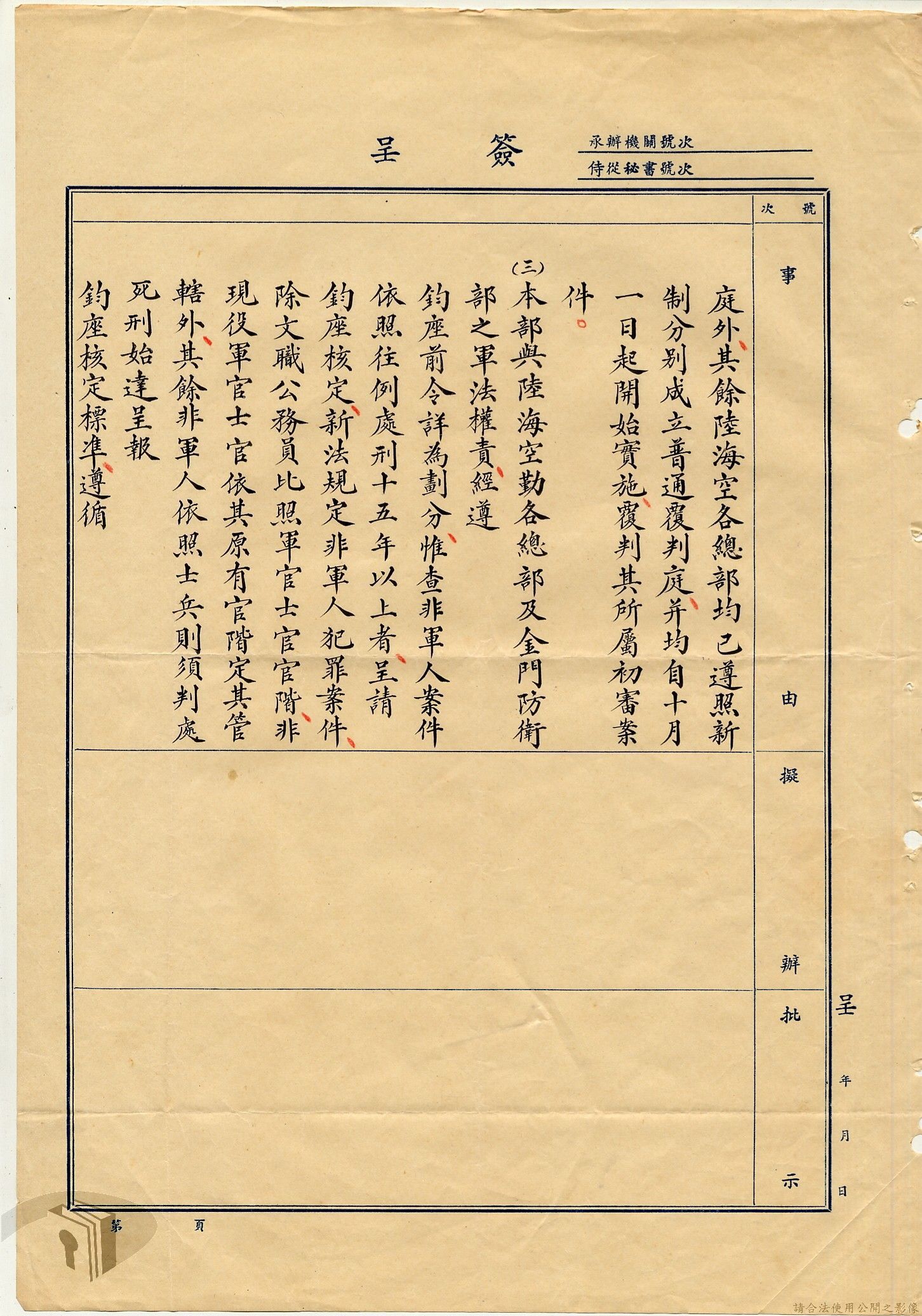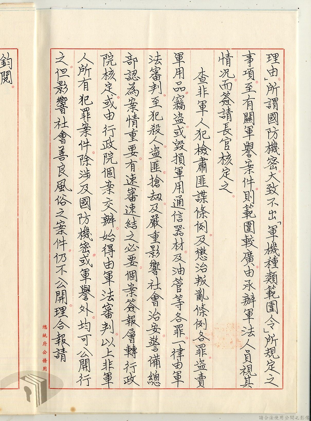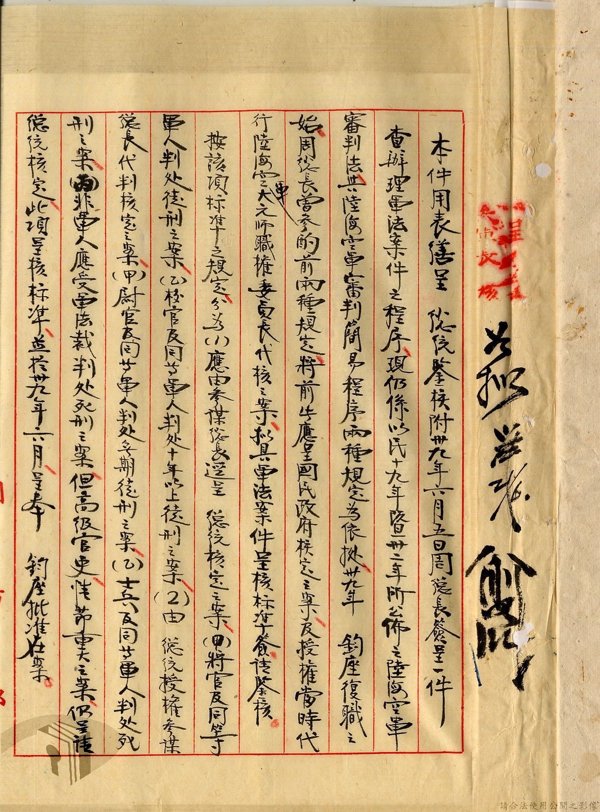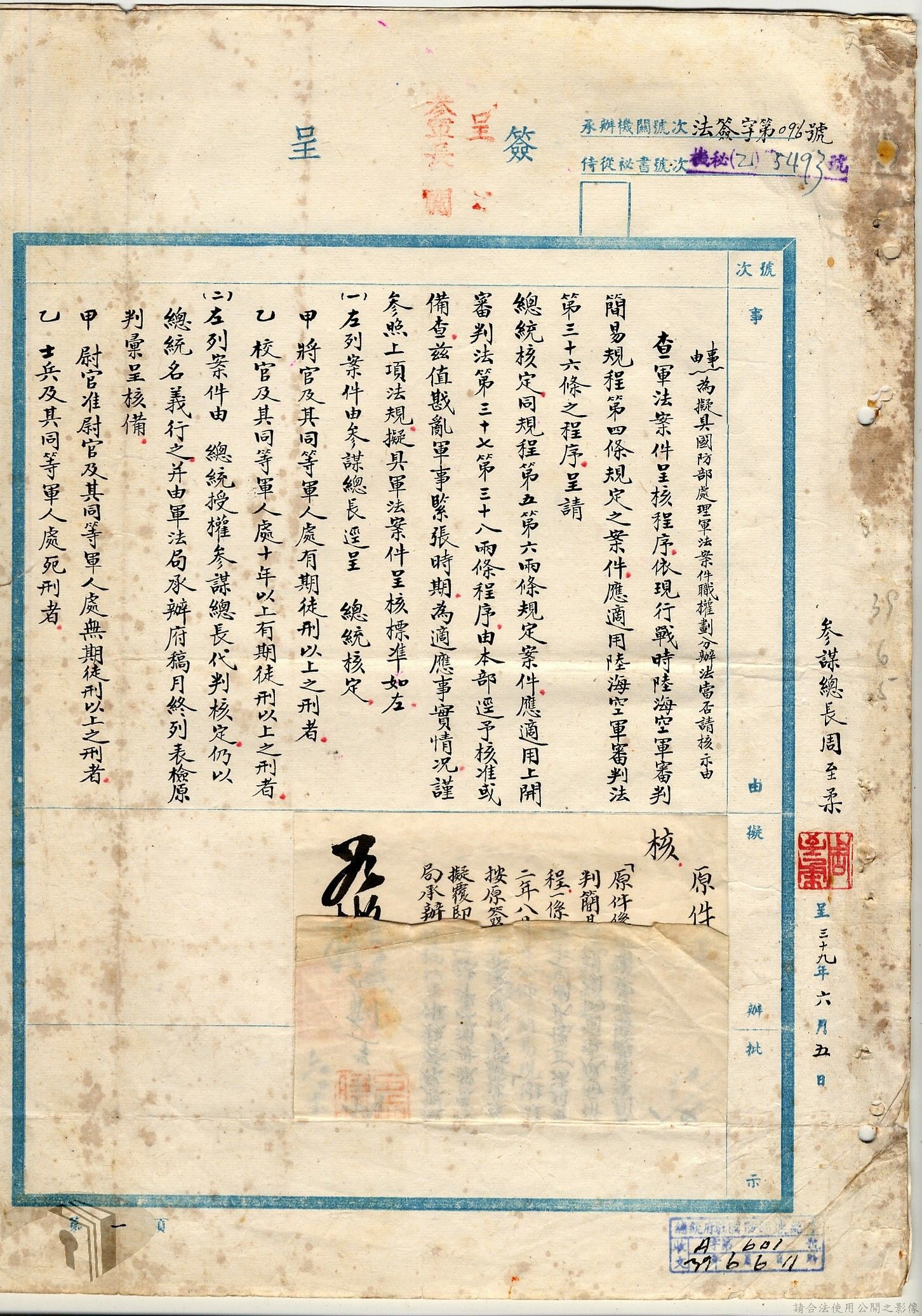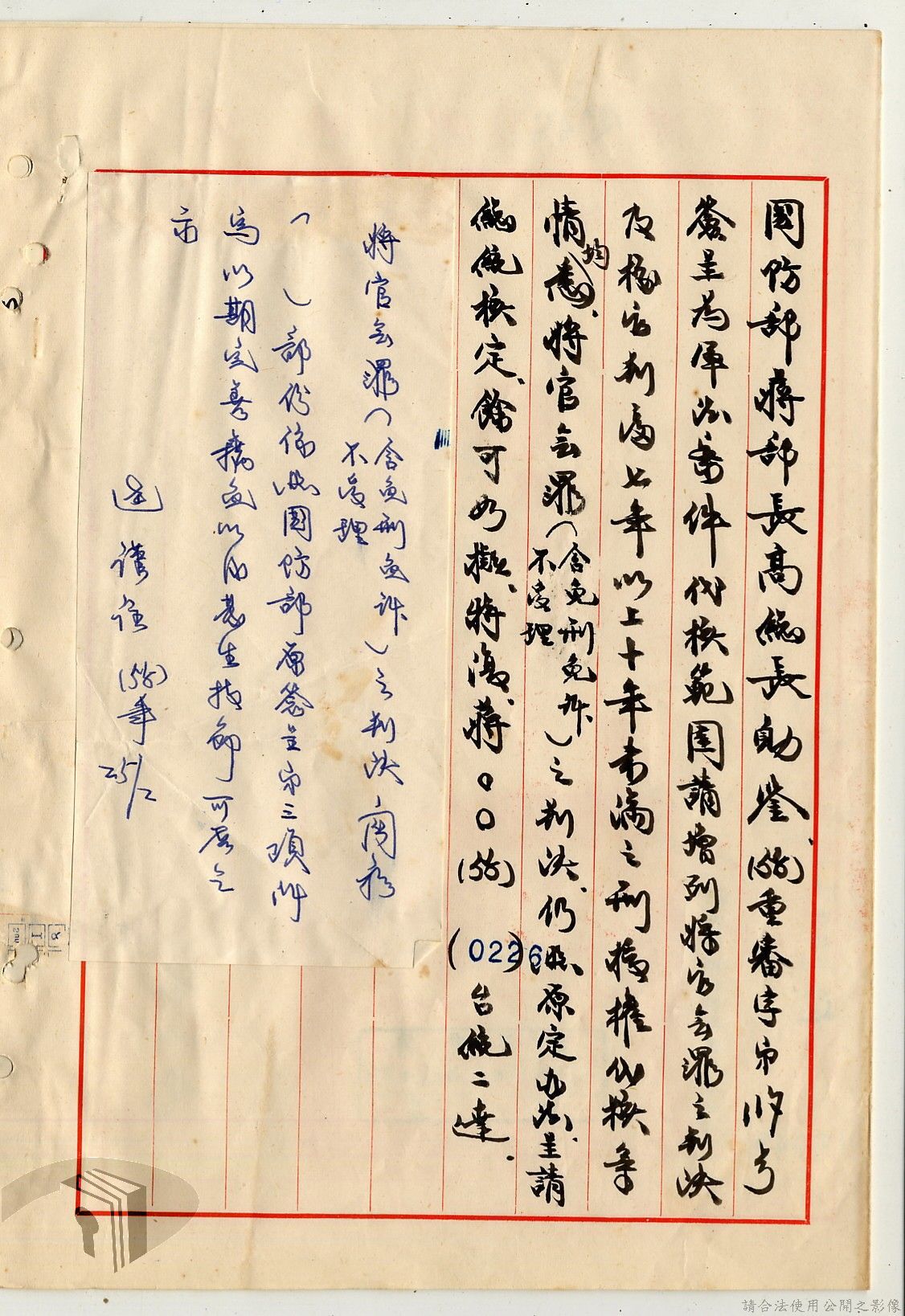 本案為38至66年間軍法案件代核及規定修訂事宜,西南行政長官公署向國防部建議將軍法案件有關將官及其同等軍人判處徒刑不滿三年者、校官及其同等軍人判處有期徒刑以下者、尉官及准尉官及其同等軍人判處無期徒刑以下者、士兵及非軍人判處死刑者均由該部代為核准而呈請代總統核示獲准,後來國防部、總統府第二局等單位研辦軍法案件相關法規之修訂事宜。