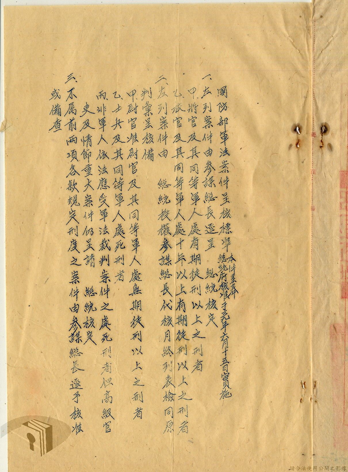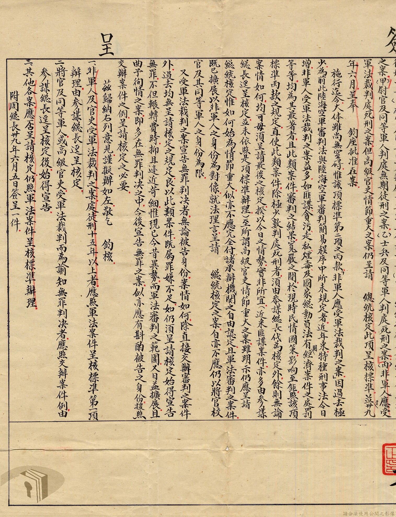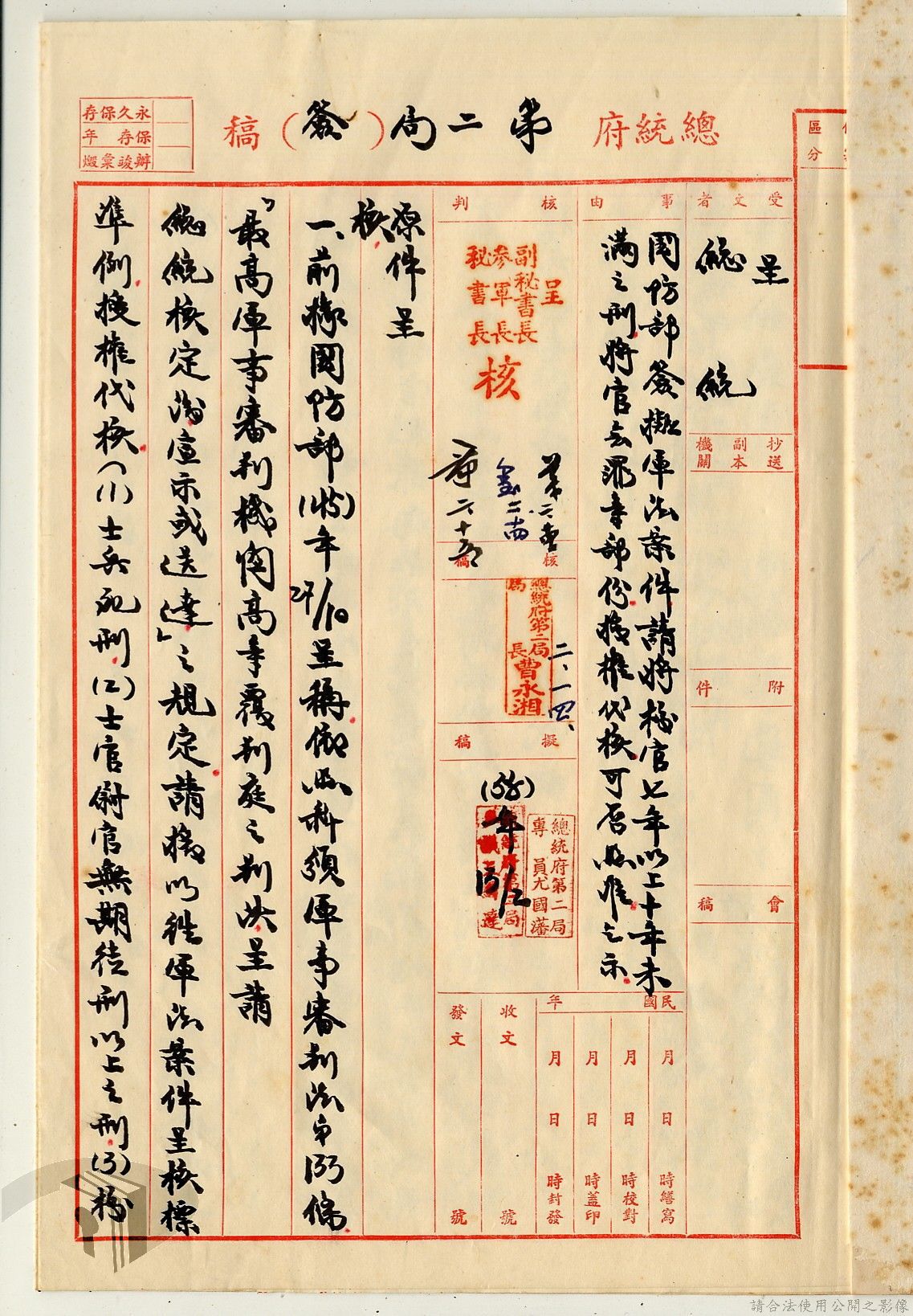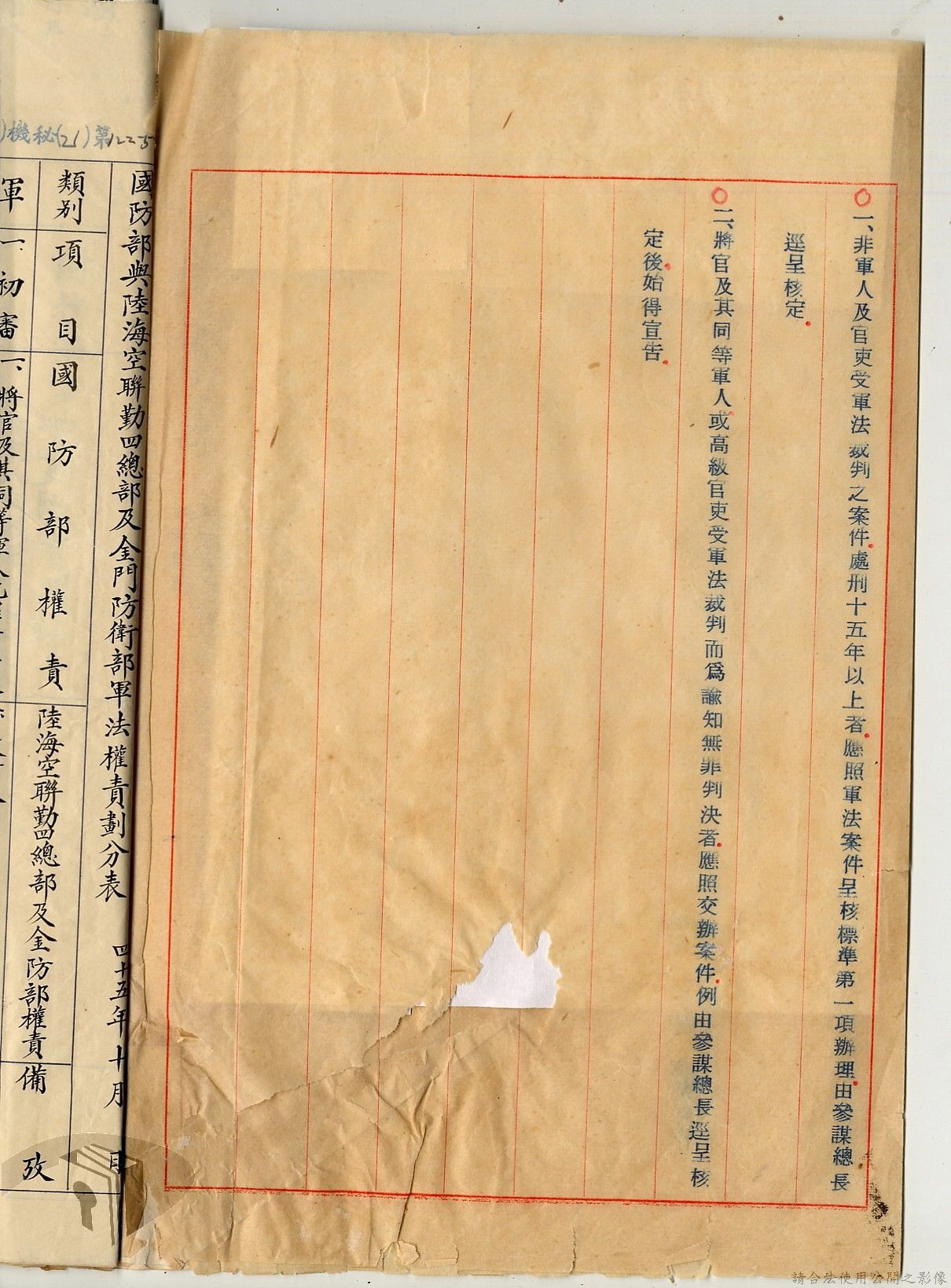 本案為38至66年間軍法案件代核及規定修訂事宜,西南行政長官公署向國防部建議將軍法案件有關將官及其同等軍人判處徒刑不滿三年者、校官及其同等軍人判處有期徒刑以下者、尉官及准尉官及其同等軍人判處無期徒刑以下者、士兵及非軍人判處死刑者均由該部代為核准而呈請代總統核示獲准,後來國防部、總統府第二局等單位研辦軍法案件相關法規之修訂事宜。