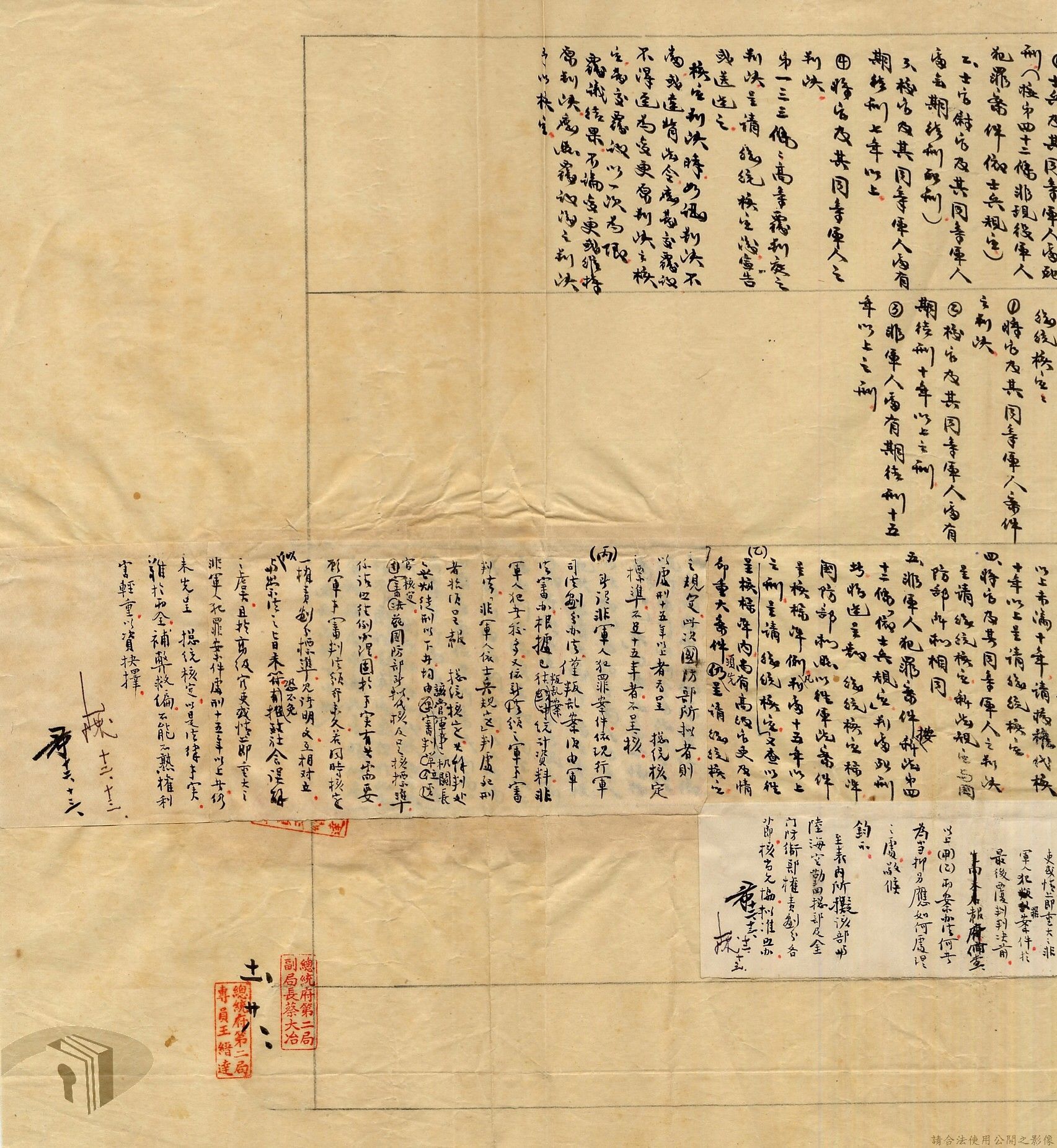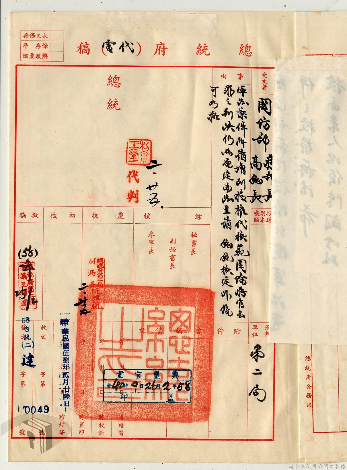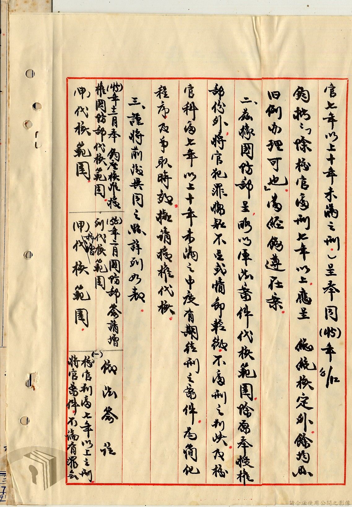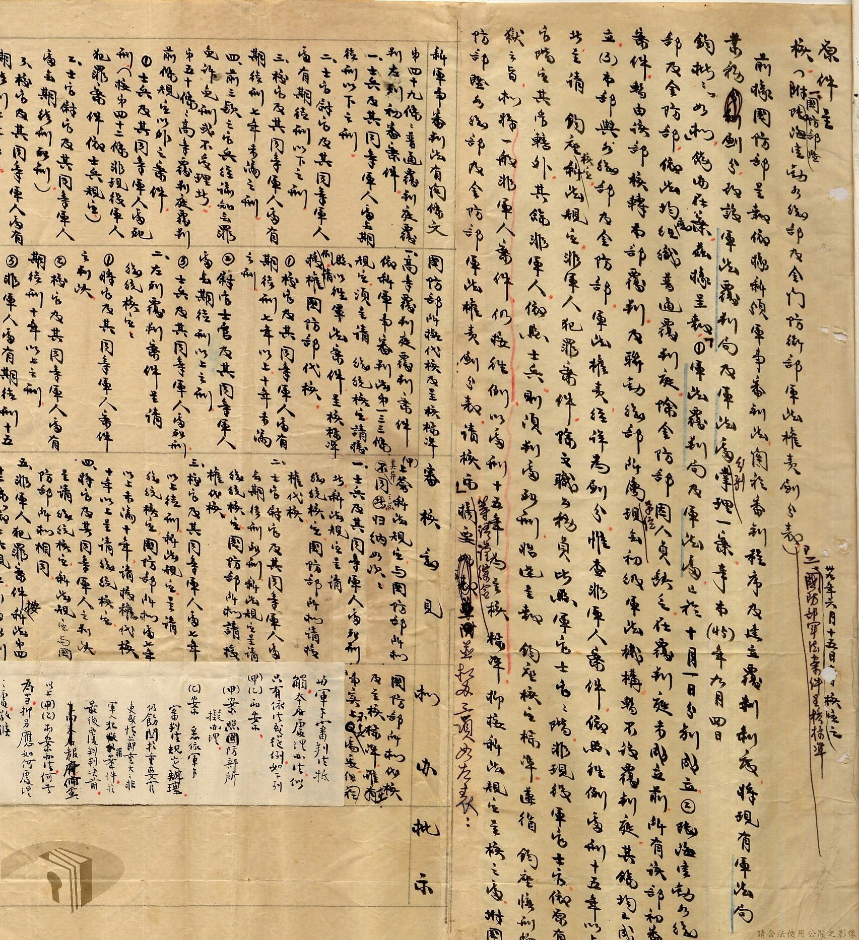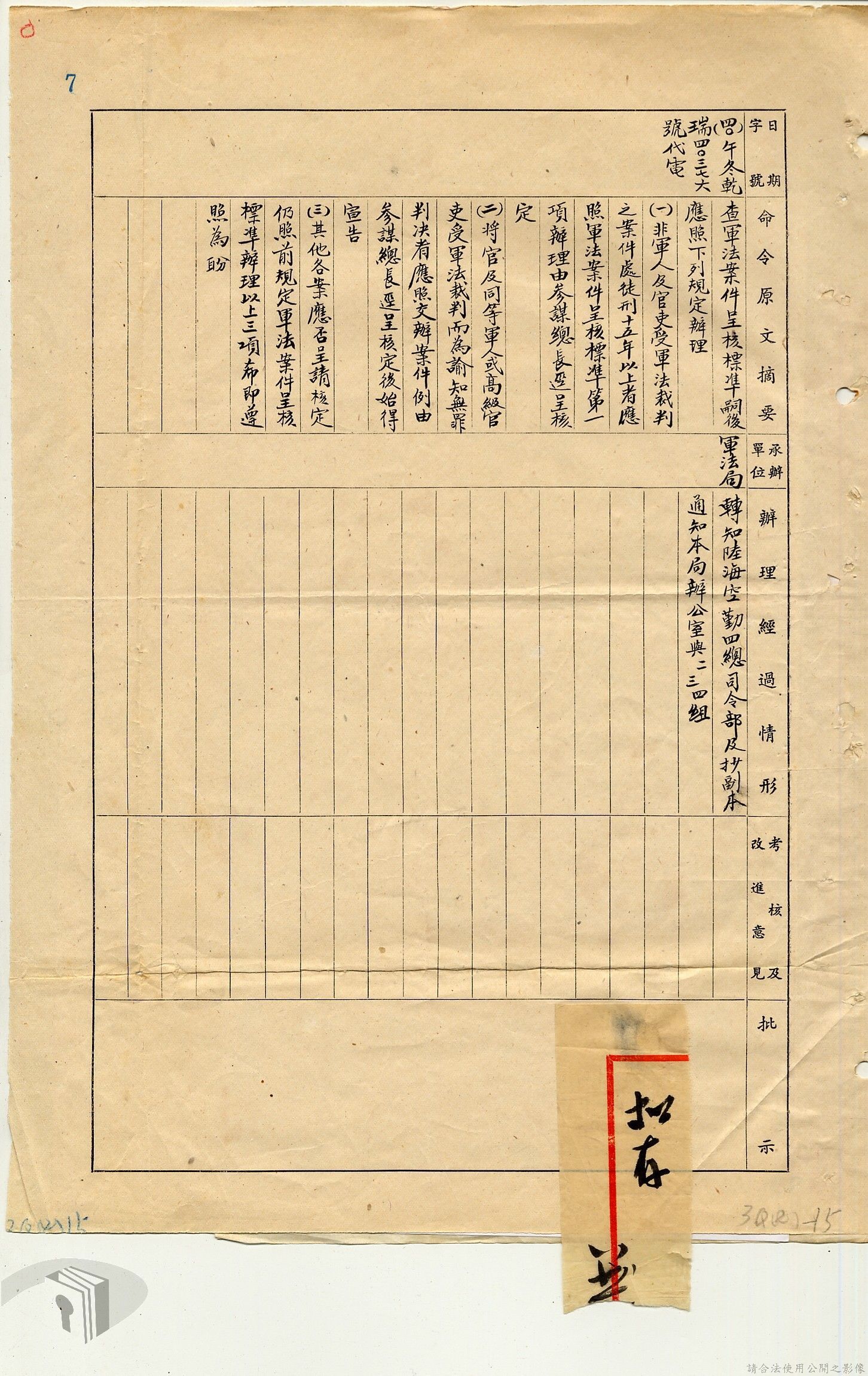本案為38至66年間軍法案件代核及規定修訂事宜,西南行政長官公署向國防部建議將軍法案件有關將官及其同等軍人判處徒刑不滿三年者、校官及其同等軍人判處有期徒刑以下者、尉官及准尉官及其同等軍人判處無期徒刑以下者、士兵及非軍人判處死刑者均由該部代為核准而呈請代總統核示獲准,後來國防部、總統府第二局等單位研辦軍法案件相關法規之修訂事宜。