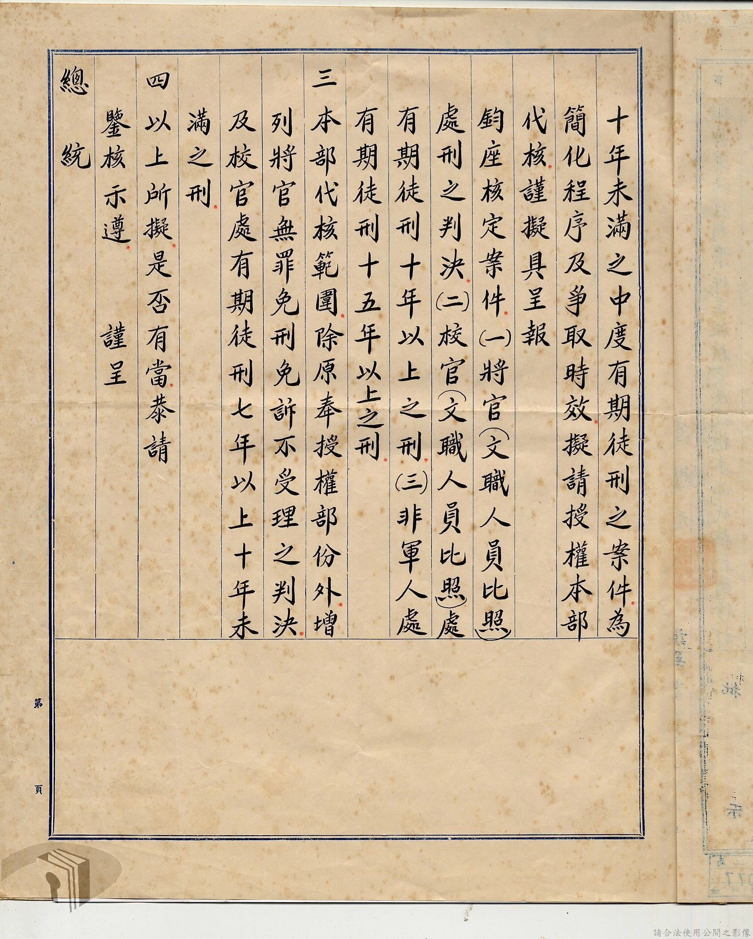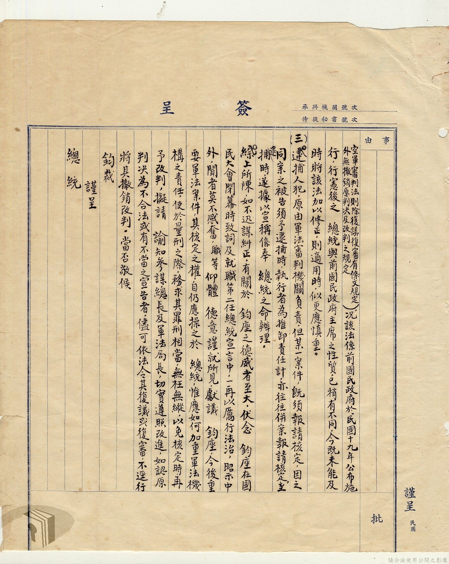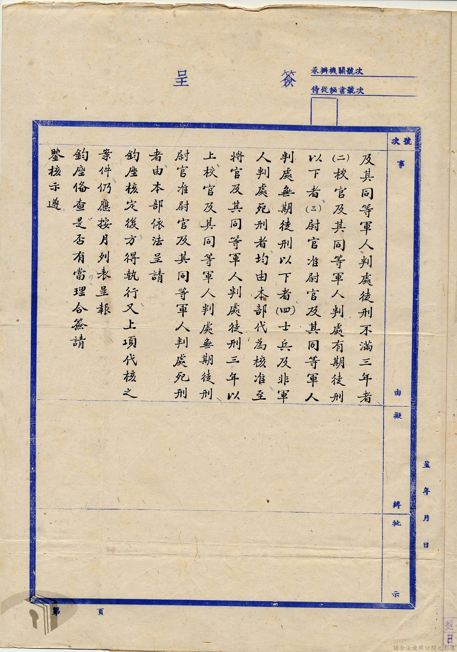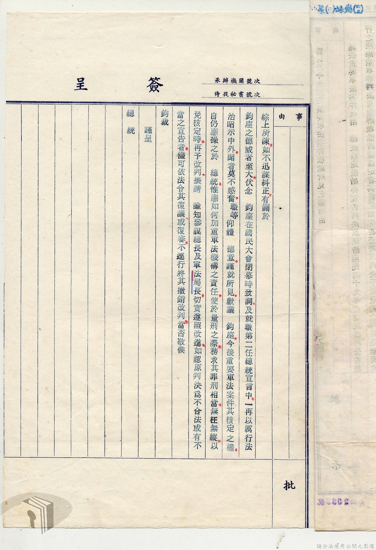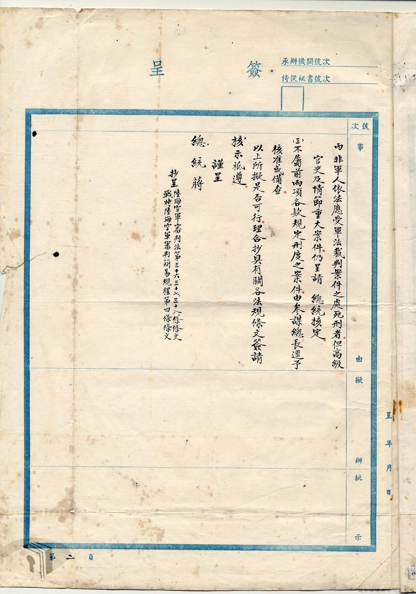 本案為38至66年間軍法案件代核及規定修訂事宜,西南行政長官公署向國防部建議將軍法案件有關將官及其同等軍人判處徒刑不滿三年者、校官及其同等軍人判處有期徒刑以下者、尉官及准尉官及其同等軍人判處無期徒刑以下者、士兵及非軍人判處死刑者均由該部代為核准而呈請代總統核示獲准,後來國防部、總統府第二局等單位研辦軍法案件相關法規之修訂事宜。