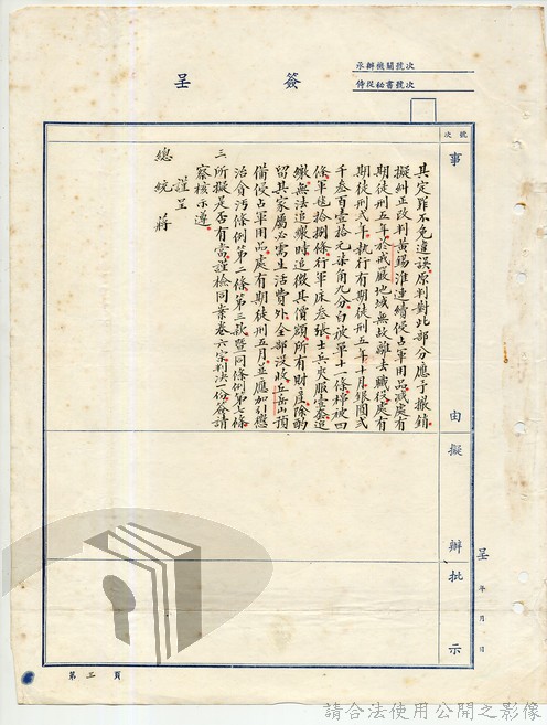 本案為40年間,國防部參謀總長因為前海南第三醫院二等軍需佐財務員及院長等軍官涉嫌貪汙案件,經聯合勤務總司令部審訊、判決的關係,而向總統呈報該案經過情形、判決結果,並獲總統核示意見。附聯合勤務總司令部判決書。