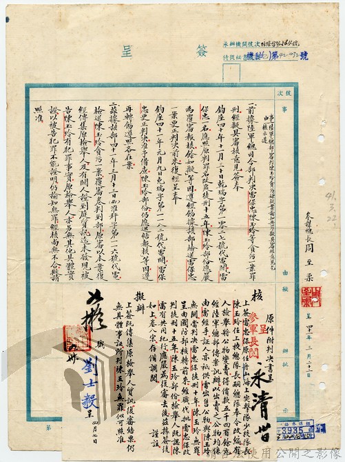 本案為40至41年間,國防部參謀總長因為陸軍第六軍軍官戰鬥團少校中隊長等軍官涉案,經陸軍總司令部審訊、判決的關係,而向總統呈報該案經過情形、判決結果,並獲總統核示意見,後國防部參謀總長將該案變更判決情形報告總統。附陸軍總司令部判決書。