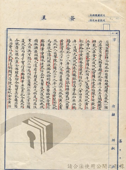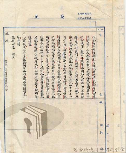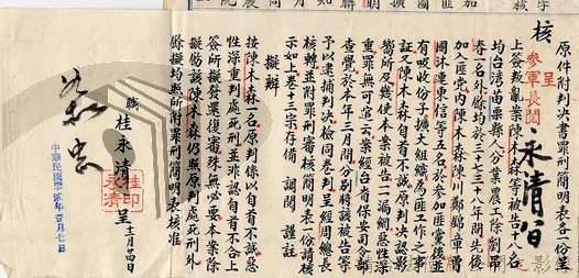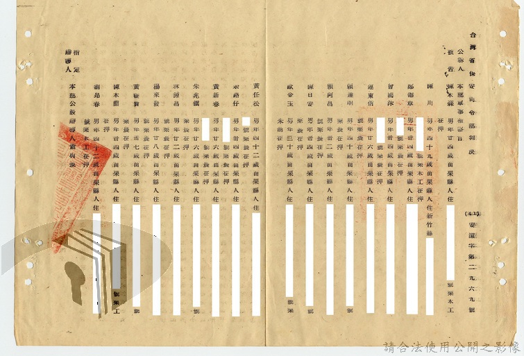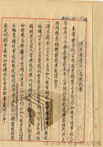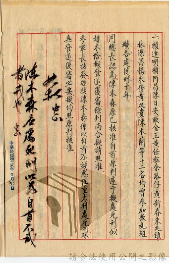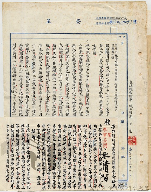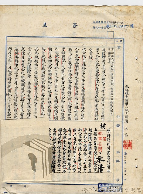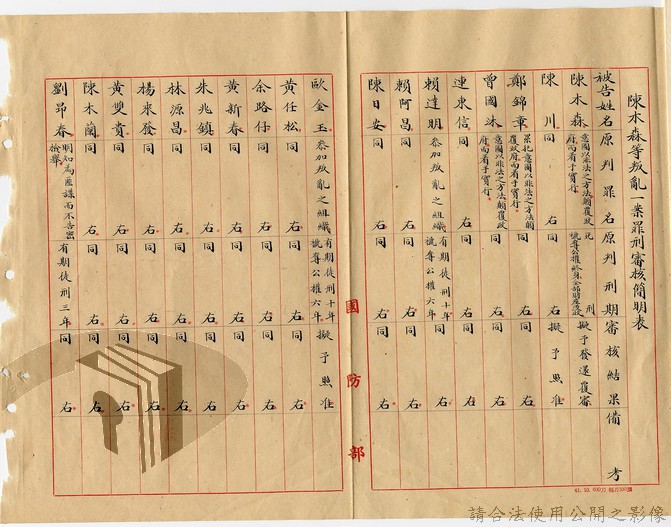 本案為42年間,國防部參謀總長因為民眾涉案經臺灣省保安司令部審訊、判決的關係,而向總統呈報該案經過情形、判決結果及審理建議,獲總統府回復同意辦理,後國防部將該案刑罰執行情形及更正判決情形報告總統。附臺灣省保安司令部判決書、審核簡明表。