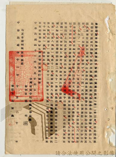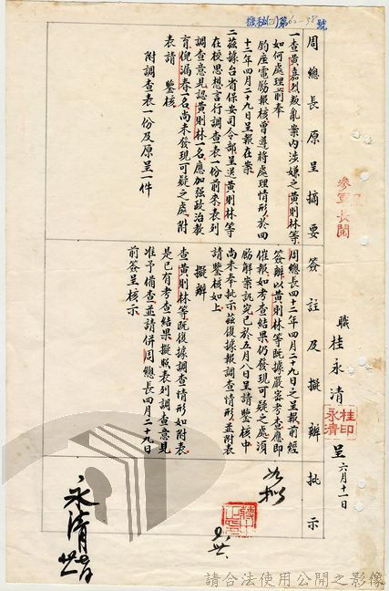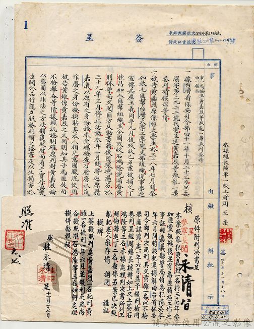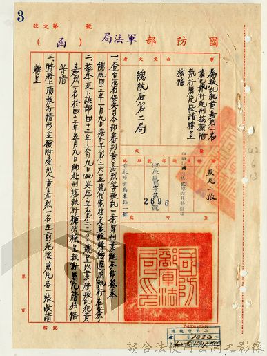 本案為42年間,國防部參謀總長因為臺灣大學學生參加共產黨相關組織而涉案,經臺灣省保安司令部審訊、判決的關係,向總統呈報該案經過情形、判決結果及審理建議,獲總統府回復辦理意見,後國防部軍法局將該案刑罰執行情形函知總統府第二局等。附臺灣省警備總司令部判決書、調查報告表等文件資料。