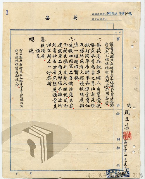 本案為42年間,國防部參謀總長呈送「軍庫儲軍品各級保管責任及爆炸或起火燃燒後懲罰辦法」予總統,並向總統報告有關該辦法相關建議,後獲總統府回復准予備查。附「軍庫儲軍品各級保管責任及爆炸或起火燃燒後懲罰辦法」。