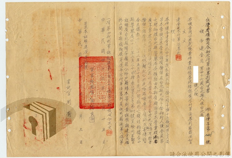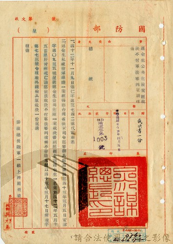 本案為42至43年間,國防部參謀總長因為民眾所涉案件,經臺灣省保安司令部軍事檢察官偵查終結予以起訴,並獲保安司令部判決的關係,而將該案經過情形、判決結果及審理建議呈報總統,後獲總統府核示意見等。附臺灣省保安司令部判決書。