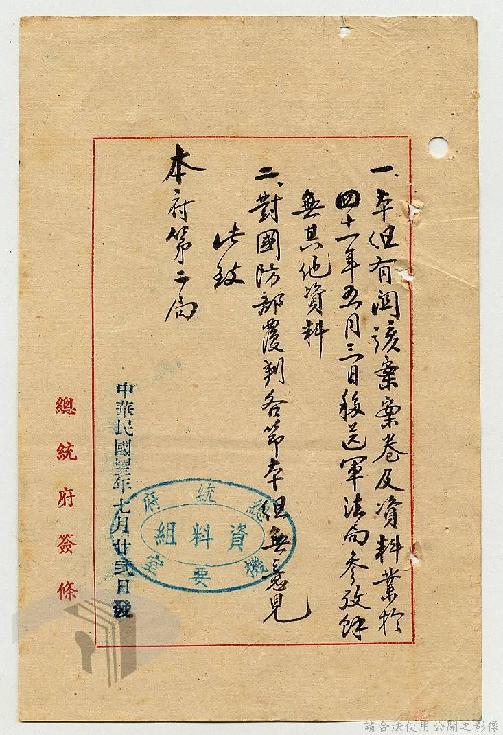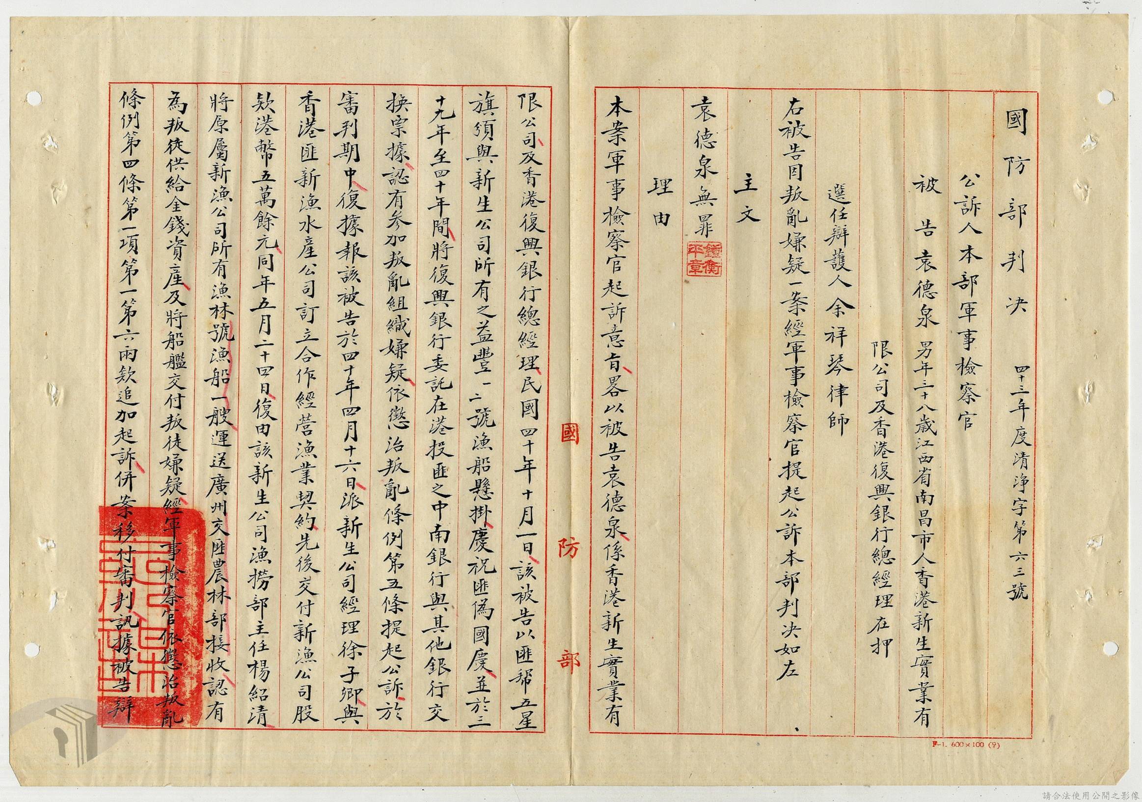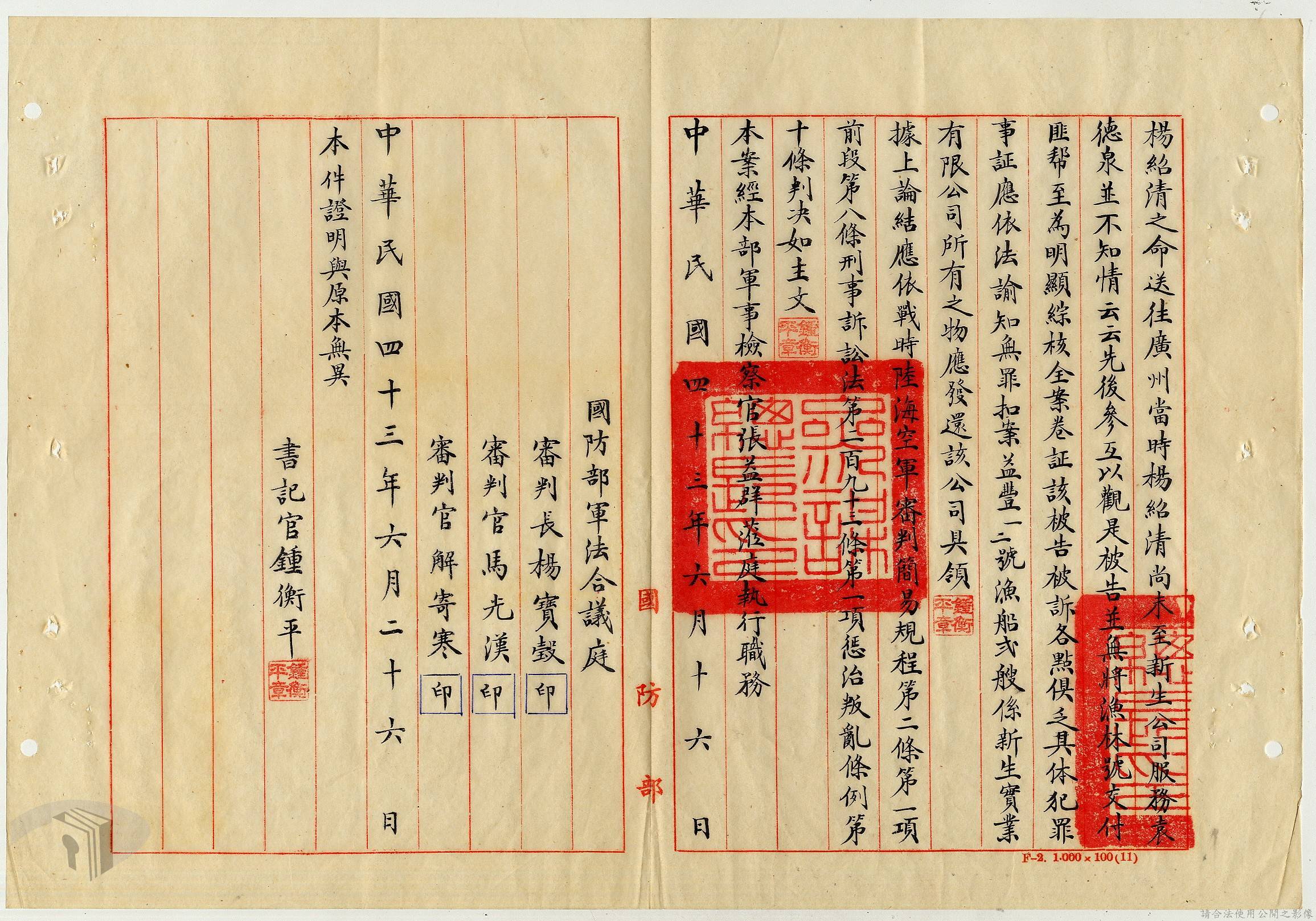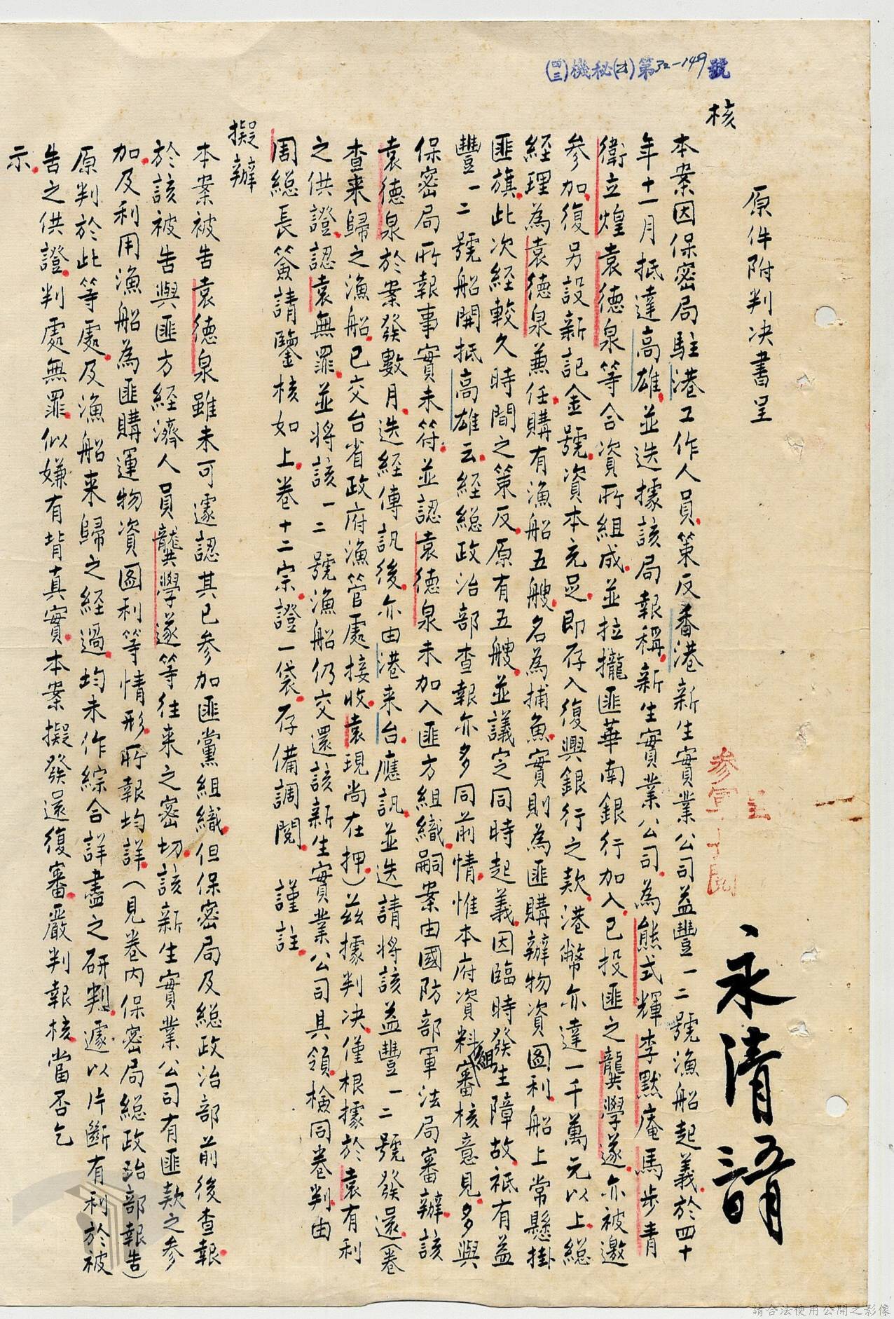 本案為43至53年間,國防部參謀總長因為香港新生實業有限公司總經理所涉案件,獲國防部判決無罪的關係,而將該案處理經過情形、判決結果及審理建議呈報總統,獲總統核示意見;後參謀總長為該員是否繼續控制其出境,而報請總統核示,並獲總統回復意見。