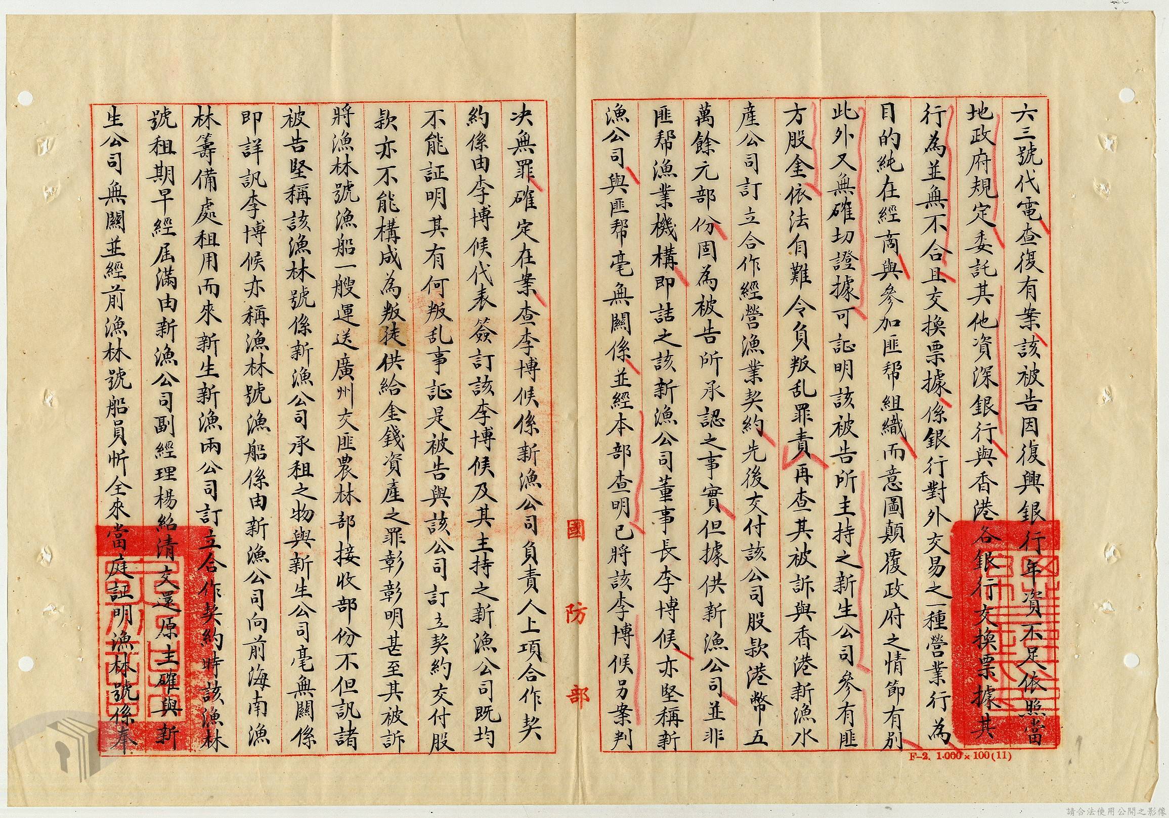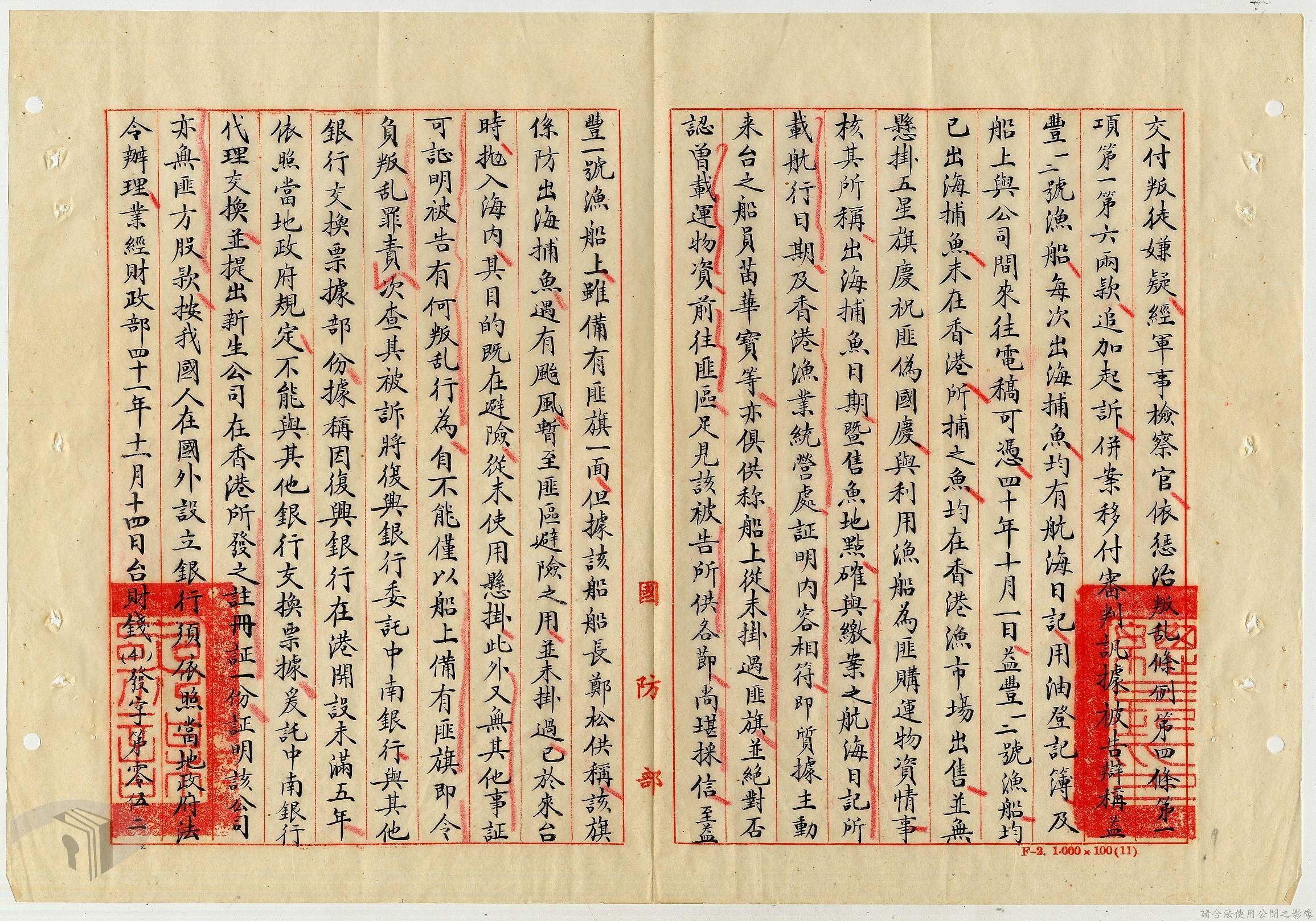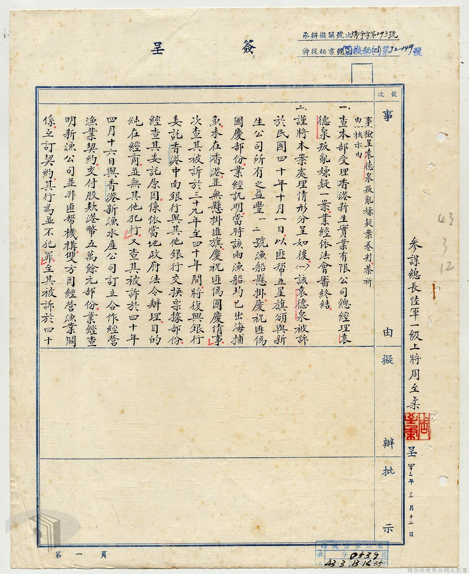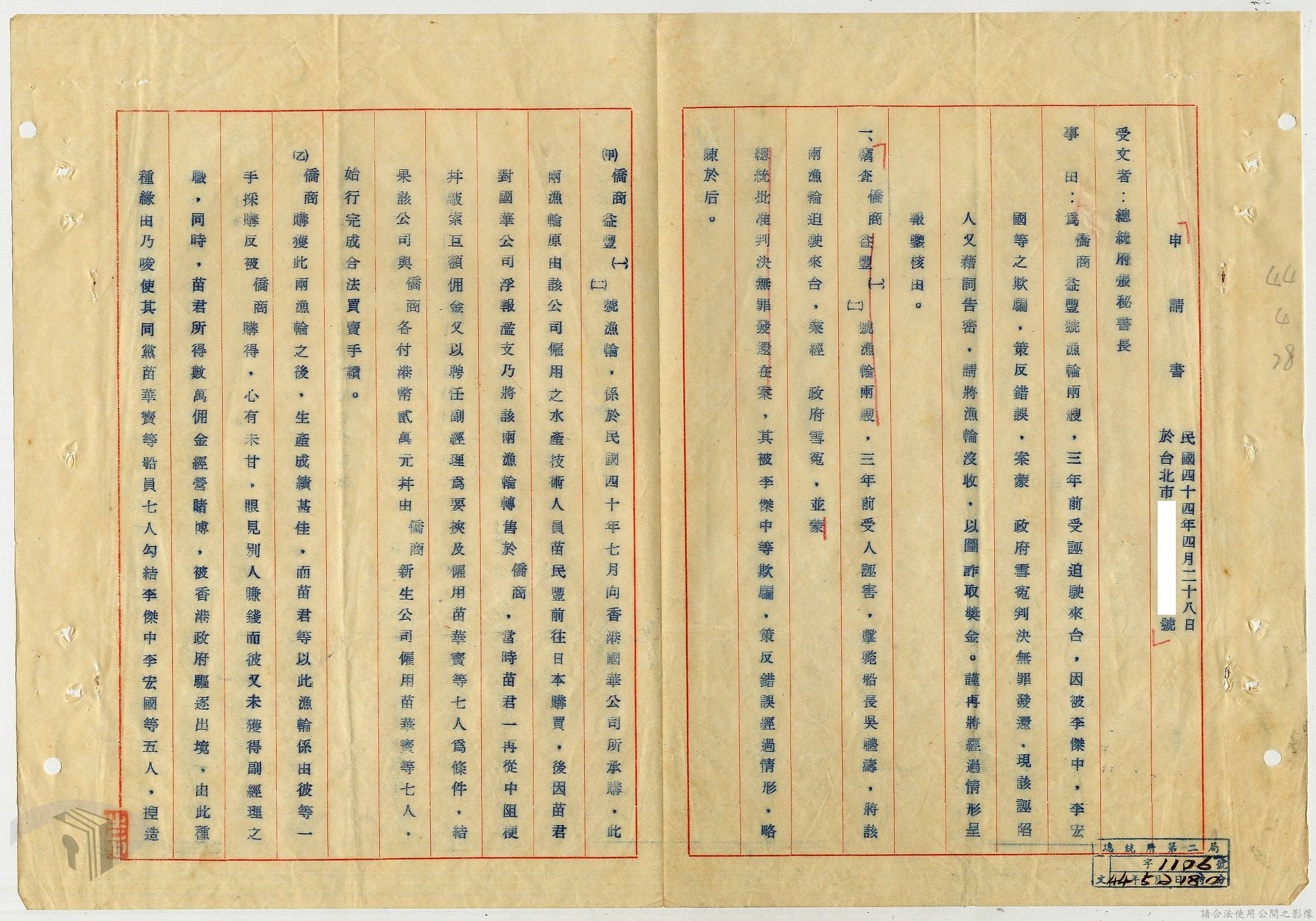 本案為43至53年間,國防部參謀總長因為香港新生實業有限公司總經理所涉案件,獲國防部判決無罪的關係,而將該案處理經過情形、判決結果及審理建議呈報總統,獲總統核示意見;後參謀總長為該員是否繼續控制其出境,而報請總統核示,並獲總統回復意見。