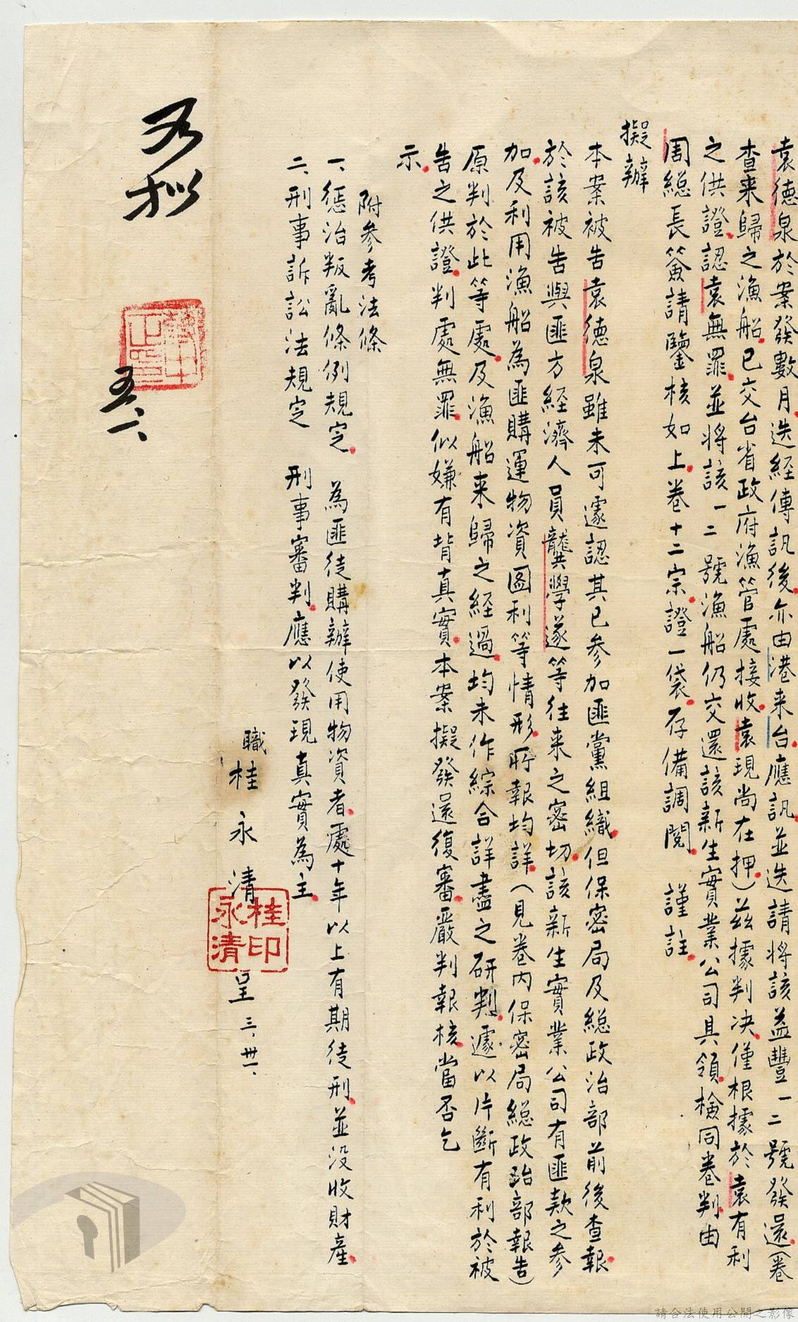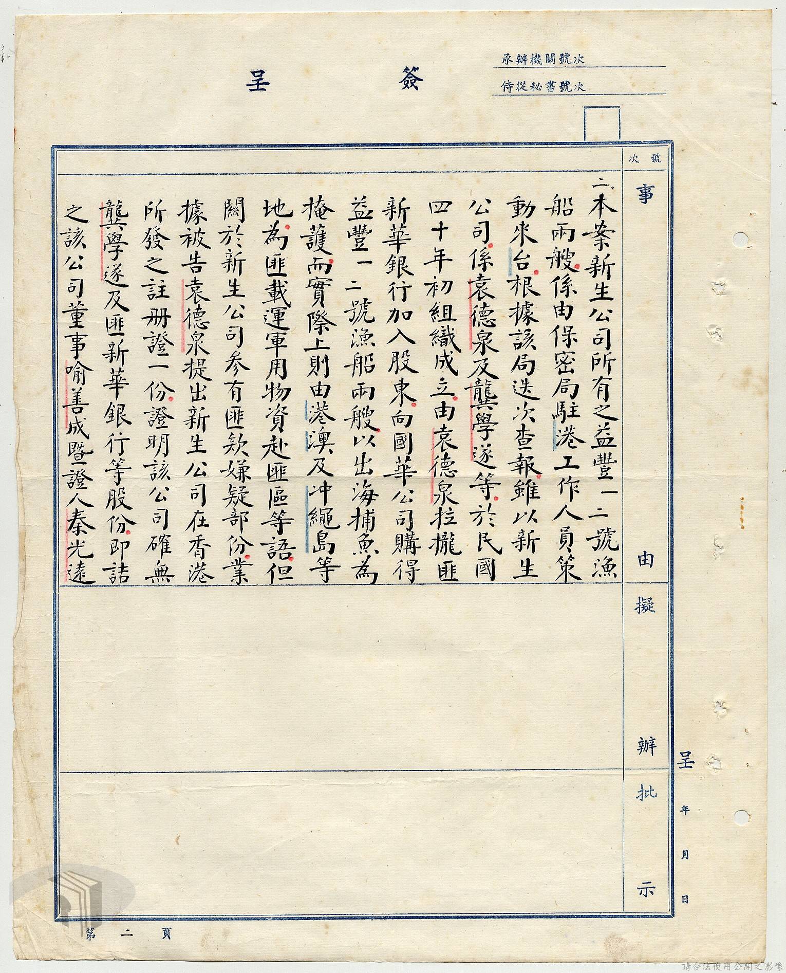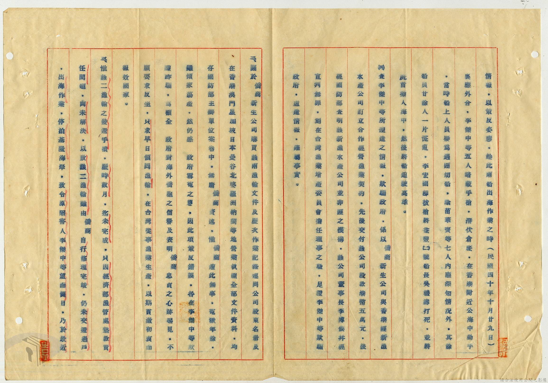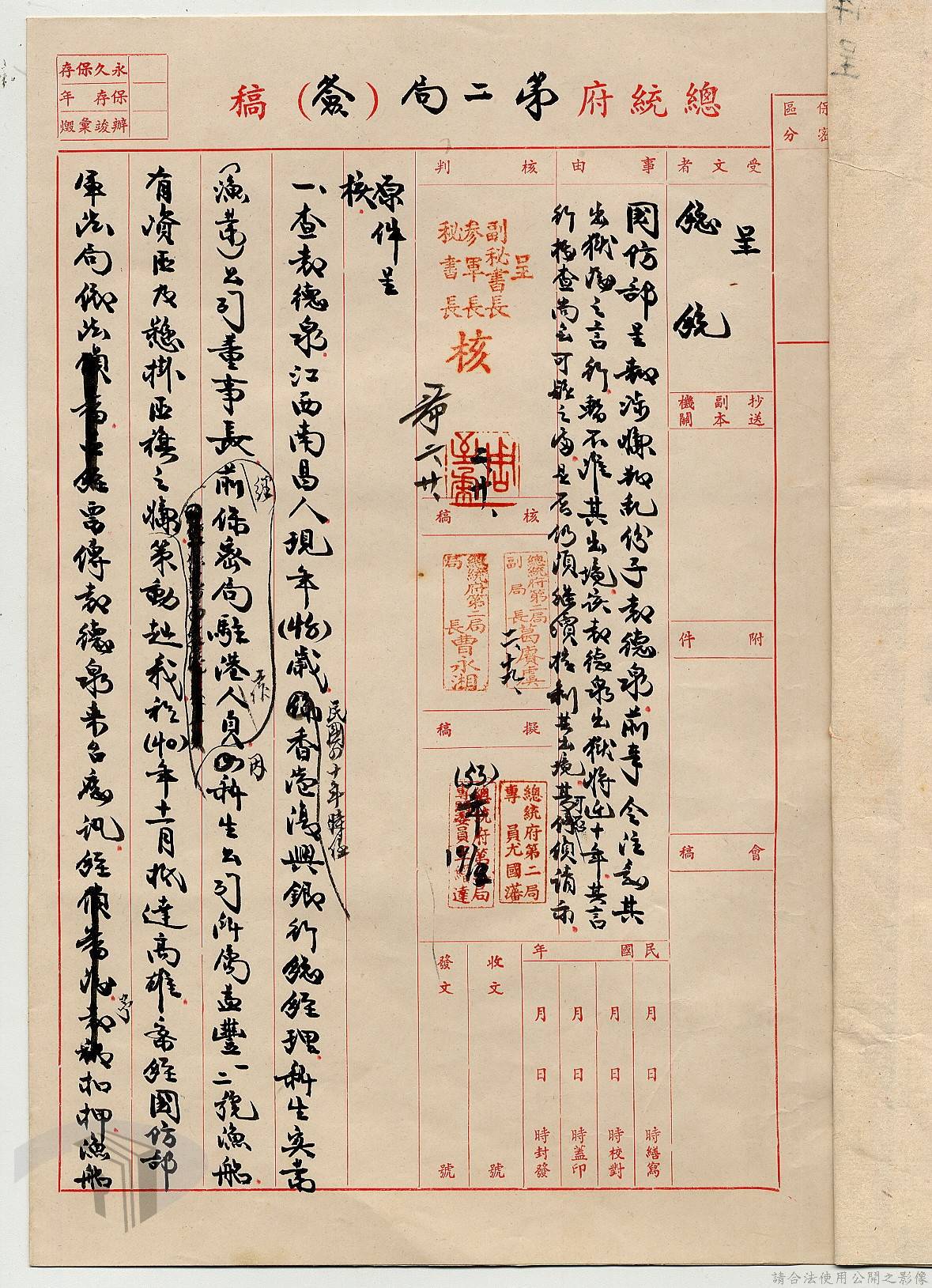 本案為43至53年間,國防部參謀總長因為香港新生實業有限公司總經理所涉案件,獲國防部判決無罪的關係,而將該案處理經過情形、判決結果及審理建議呈報總統,獲總統核示意見;後參謀總長為該員是否繼續控制其出境,而報請總統核示,並獲總統回復意見。