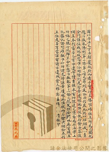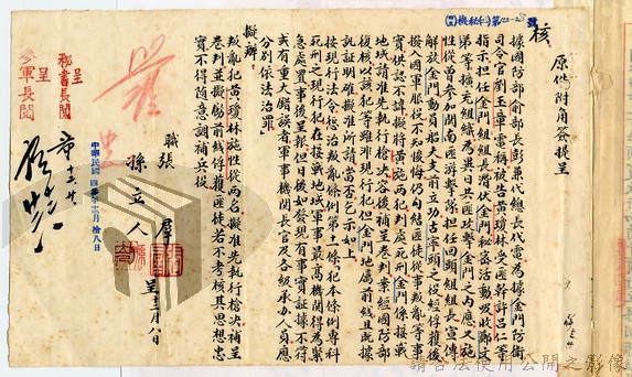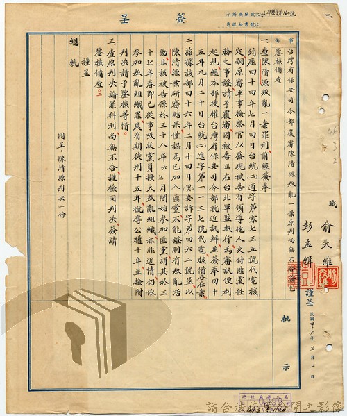 本案為43至46年間,金門防衛司令部破獲民眾參加共黨組織案,因金門係接戰區域而陳請國防部同意將其中二人就地正法再補送判決,經該部轉呈總統獲准,後國防部向總統呈報該案經過情形及金門防衛司令部之判決結果,並獲總統府同意辦理,國防部軍法局則告知總統府第二局有關被告依判決執行之經過情形。附判決書、相片等文件資料。