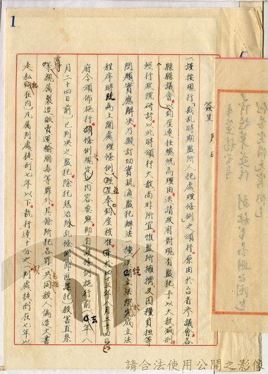本案為44年間,總統府秘書長及參軍長聯名向總統呈報有關由大赦法規轉變而來之戡亂時期監所人犯處理條例其頒行用意與行政院、國防部等機關對於該條例所涉共諜、殺人、走私等罪名之監犯其適用情形及其擬辦意見,並獲總統批示。