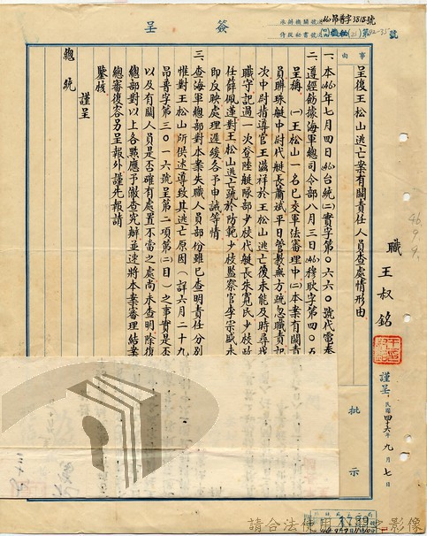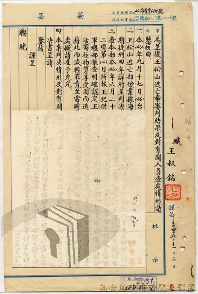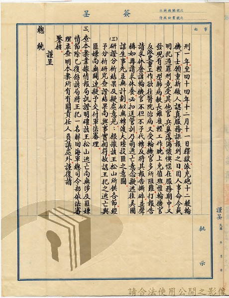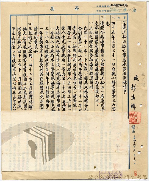 本案為45至46年間,國防部向總統呈報有關海軍總司令部登陸艇隊聯珠艇輪機下士搭乘美籍商輪偷渡出境於馬尼拉遭緝獲押解返臺之案情概要、處理經過情形,總統認為該員必有共諜嫌疑,要求先交由情報局查辦,經國防部情報局訊辦結果,認為並非共諜,後國防部向總統呈報該員逃亡原因及經過情形、判決結果等事項,獲總統同意。附海軍總司令部判決書。