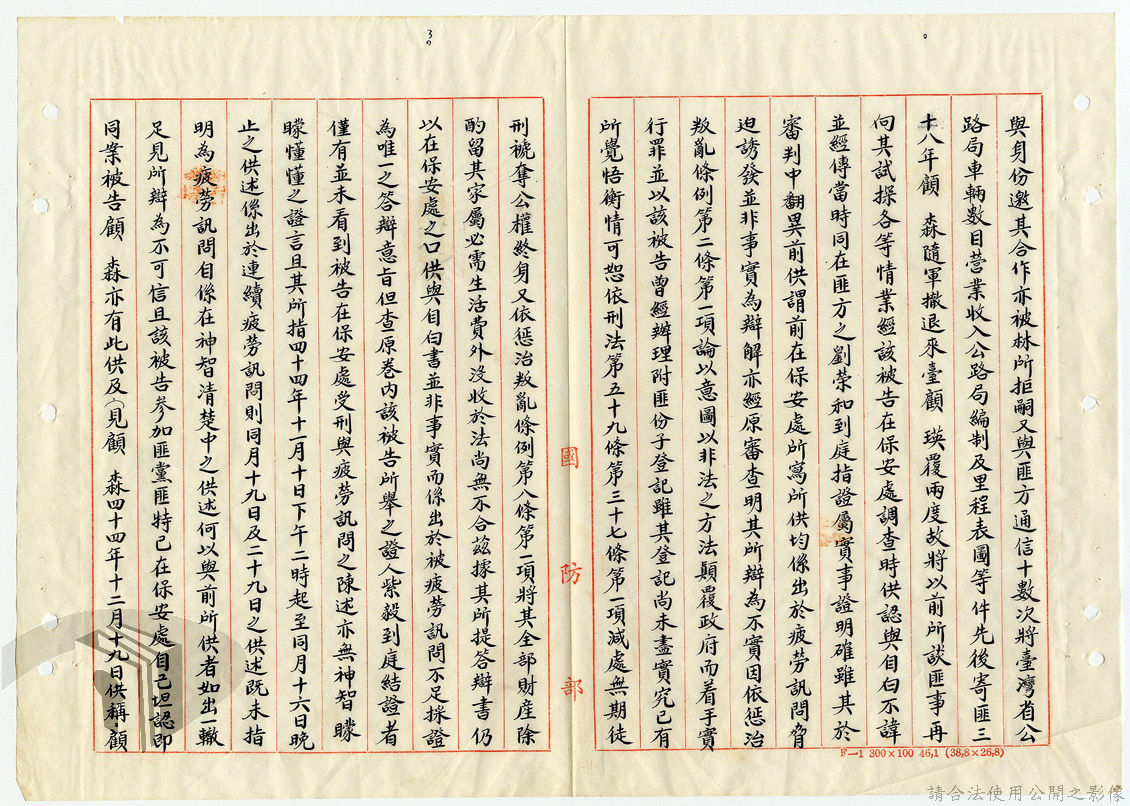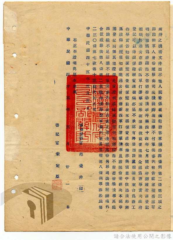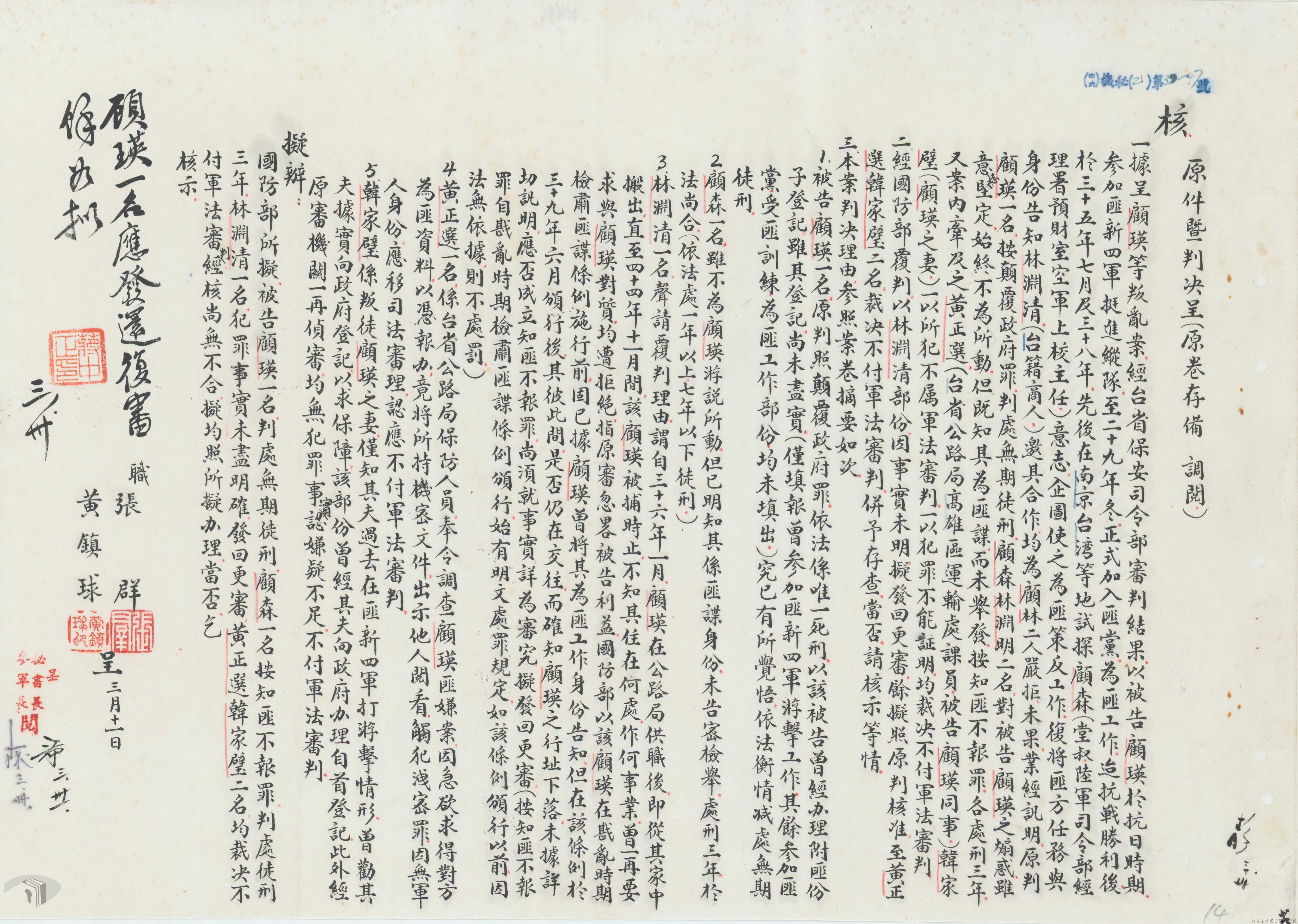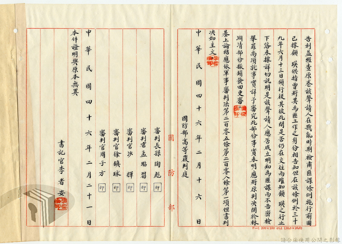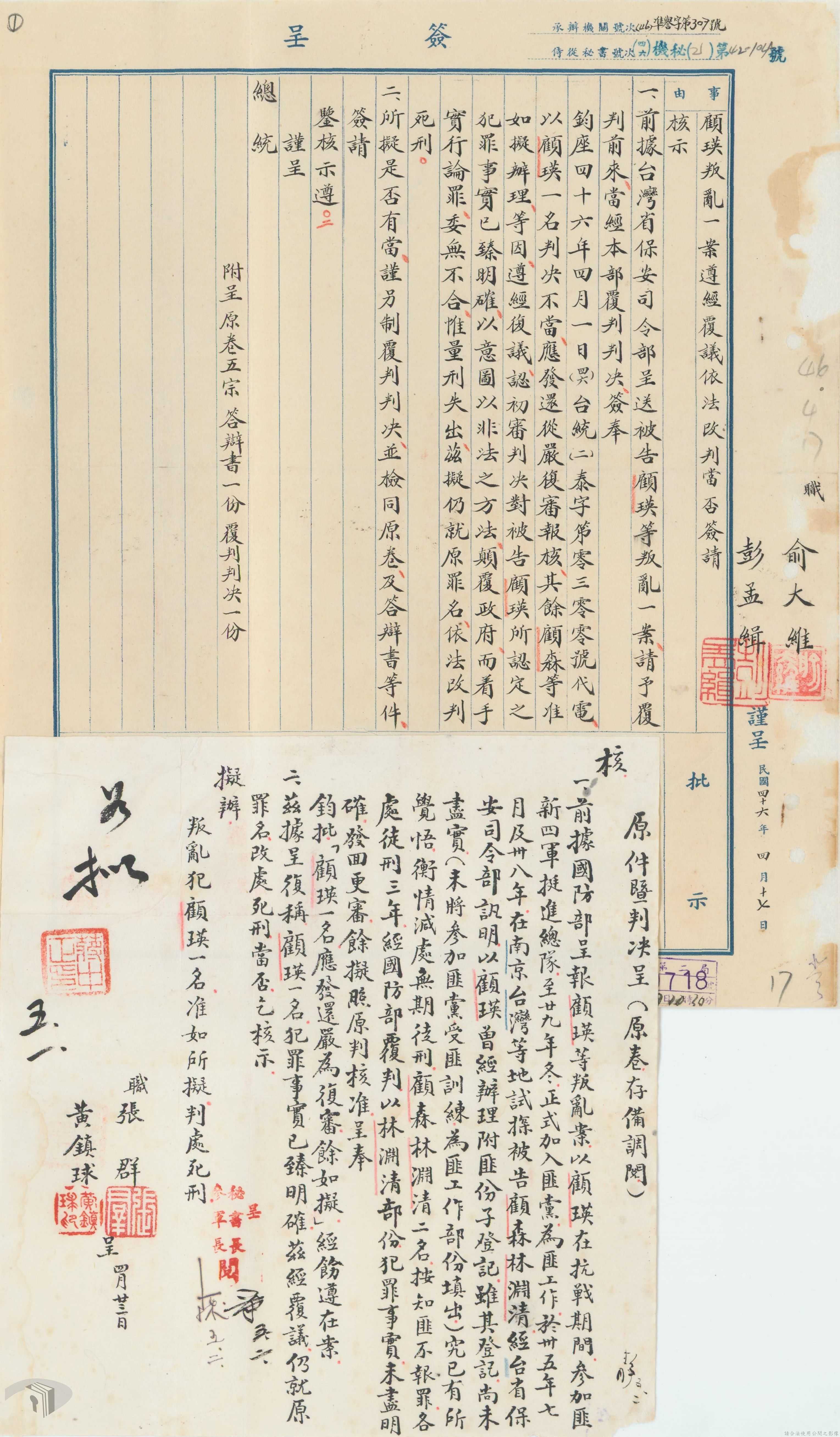 本案為46年間,國防部向總統呈報涉案民眾所涉及共諜案件之判決及裁決結果,總統要求將其中一被告發回復審,其餘可予同意,後該部向總統呈報復審之判決結果獲准,國防部軍法覆判局則告知總統府第二局有關被告依判決執行之經過情形。附臺灣省保安司令部及國防部之判決書、相片。