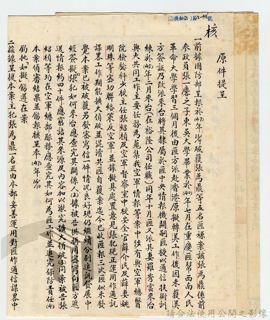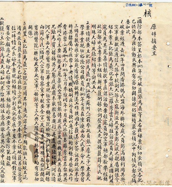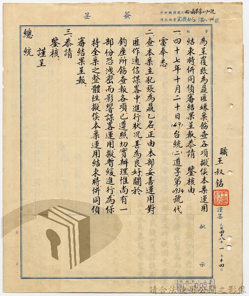 本案為47至48年間,參謀總長呈報總統有關多位民眾所涉案件初步偵訊情形,內容包含:該案緣起、行動經過、案情提要、共述要點、現行處置等資料,以及該案相關人員調查運用結束和偵審結果等,後獲總統府回復辦理意見。附初步偵訊報告書。