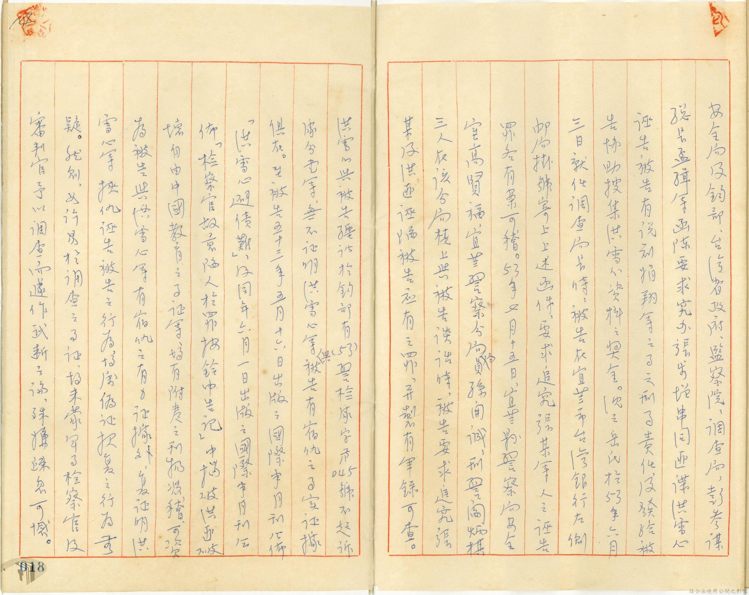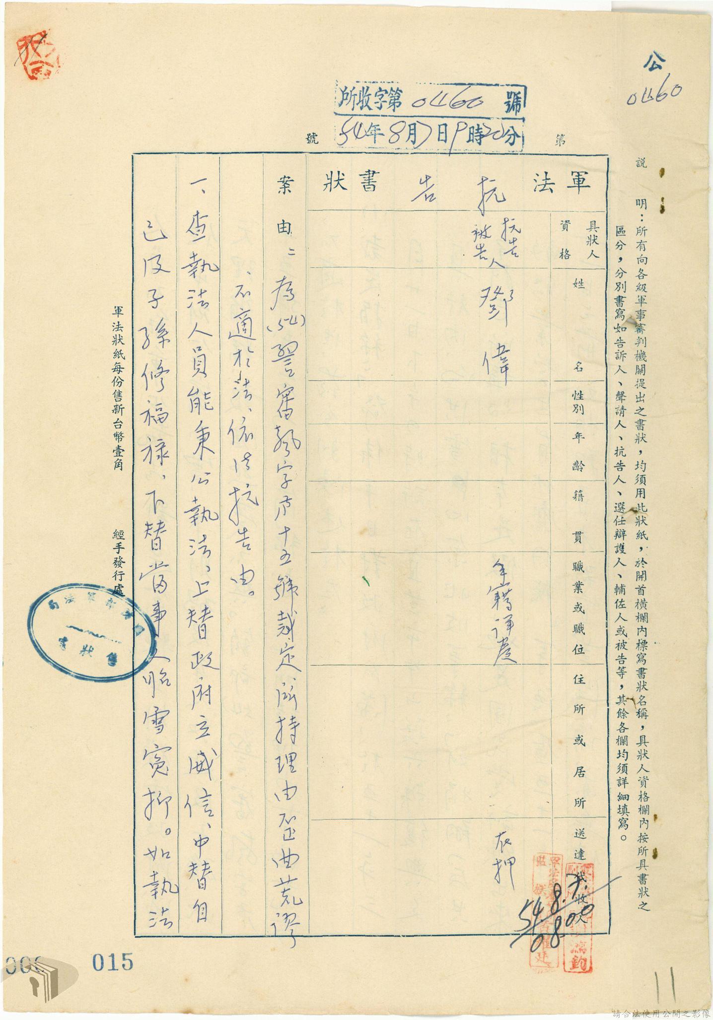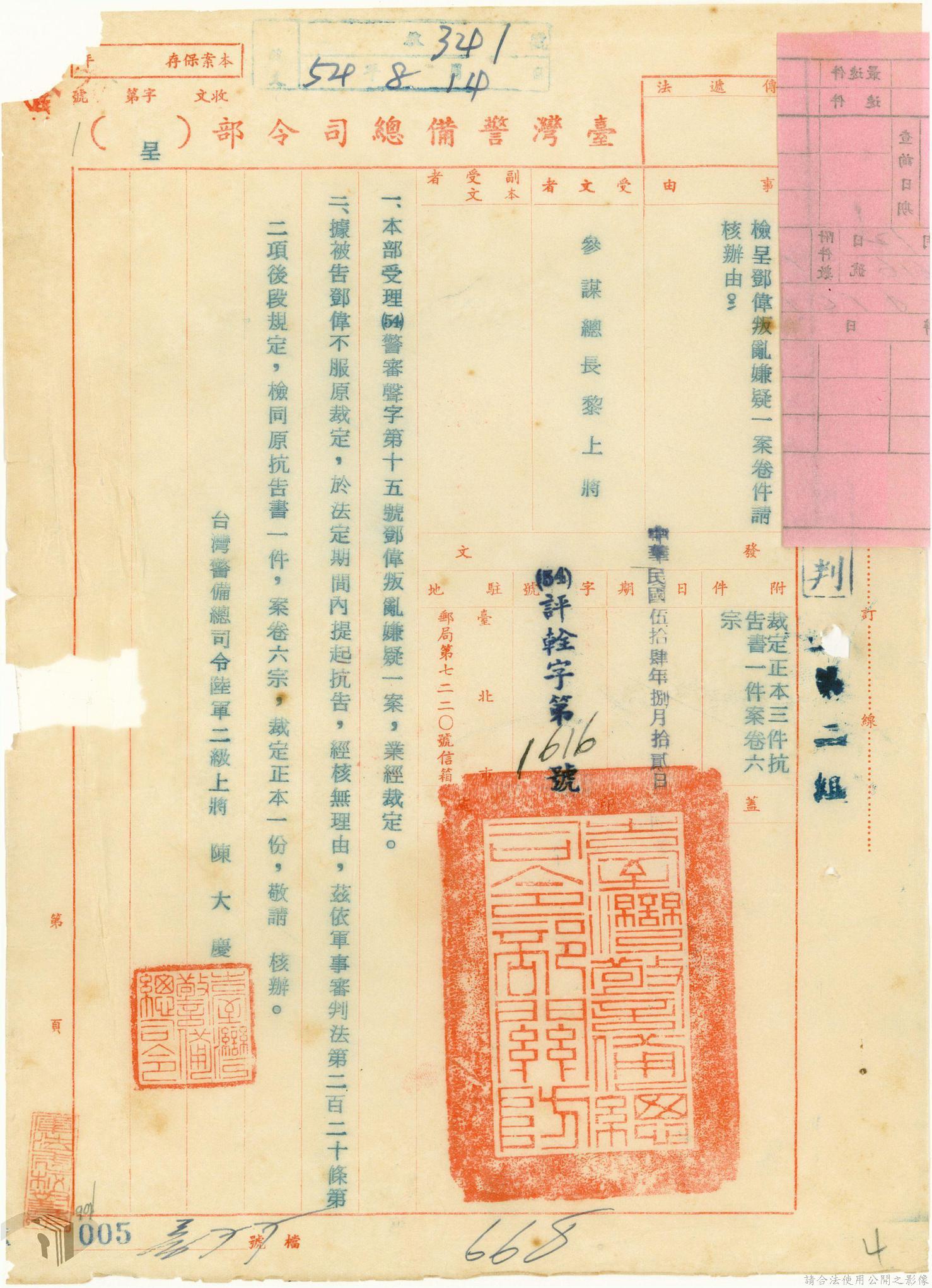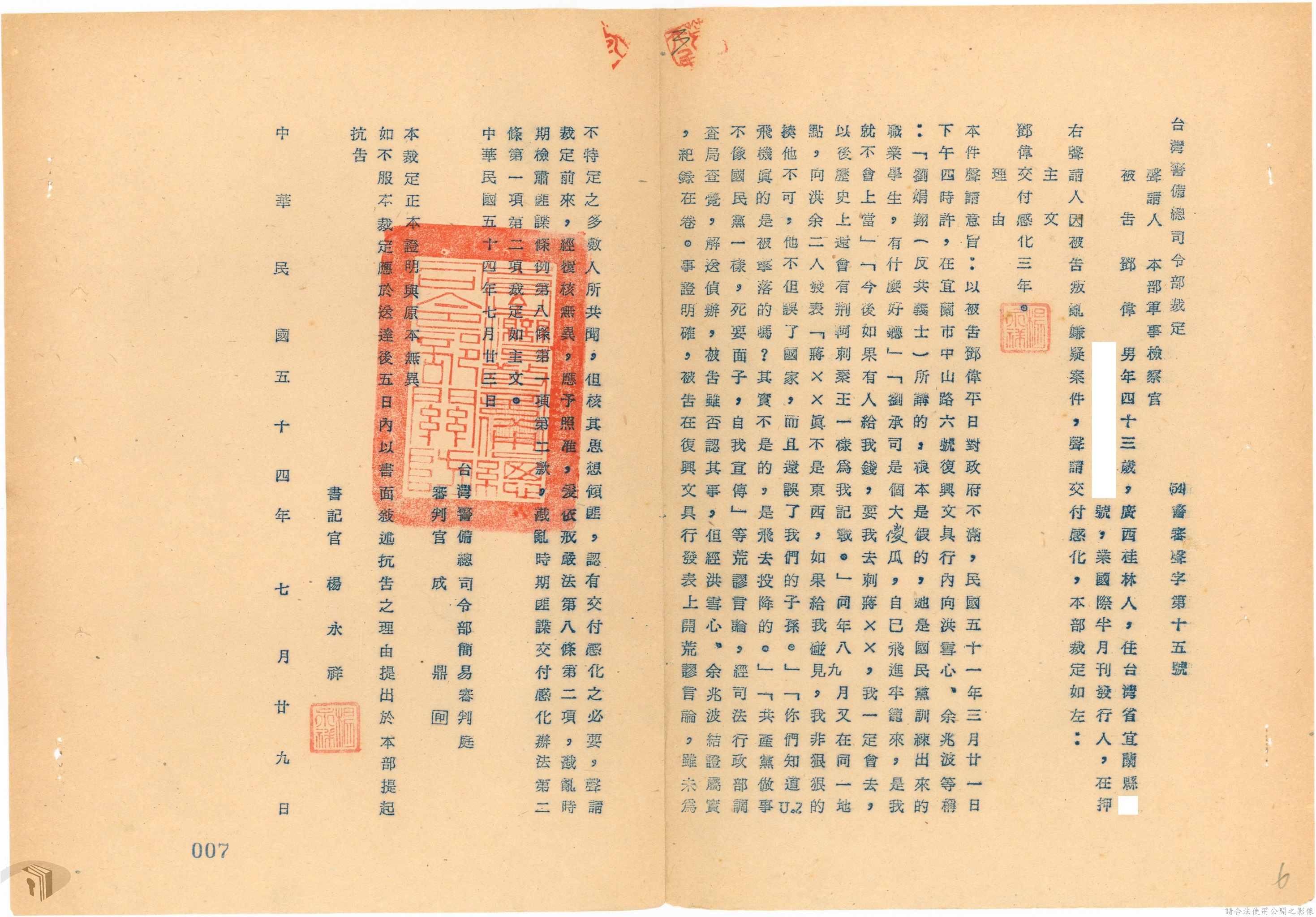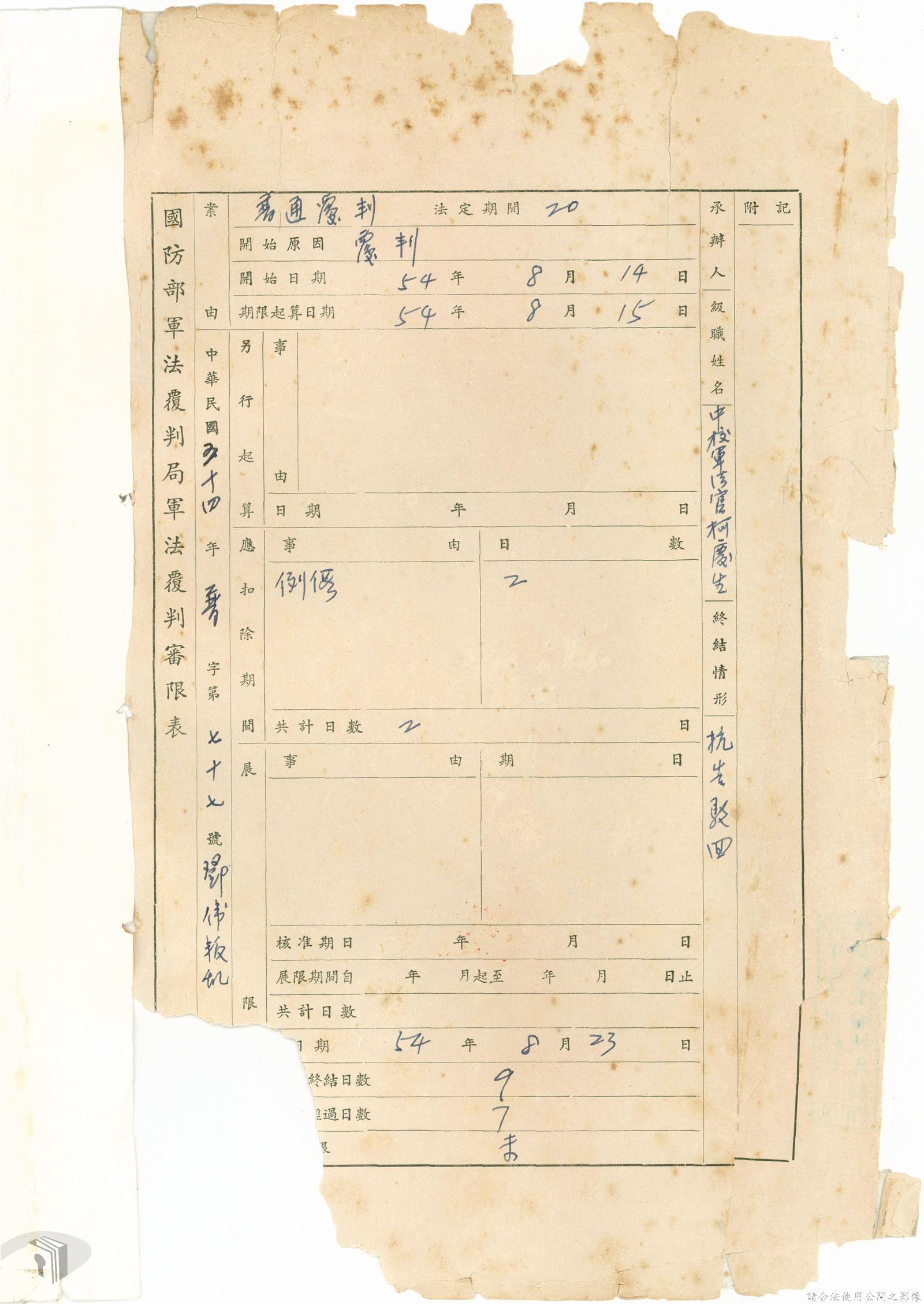 本案為54年間,涉案民眾經臺灣警備總司令部審訊並裁定確定後,被告因為不服裁定結果提起抗告,臺灣警備總司令部將此抗告案轉給國防部,經國防部覆判庭裁定予以駁回。附警備總司令部裁定書、抗告書、抗告補充書、評議筆錄、國防部裁定書。