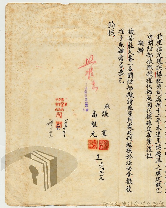 本案為59年間,國防部參謀總長呈報總統有關民眾涉案情形,和當事人獲臺灣警備總司令部判決後,送請覆判,獲國防部原判決核准的覆判結果,及該部審理建議,獲總統府回復辦理意見,後國防部向總統報告有關該案刑罰執行情形等。