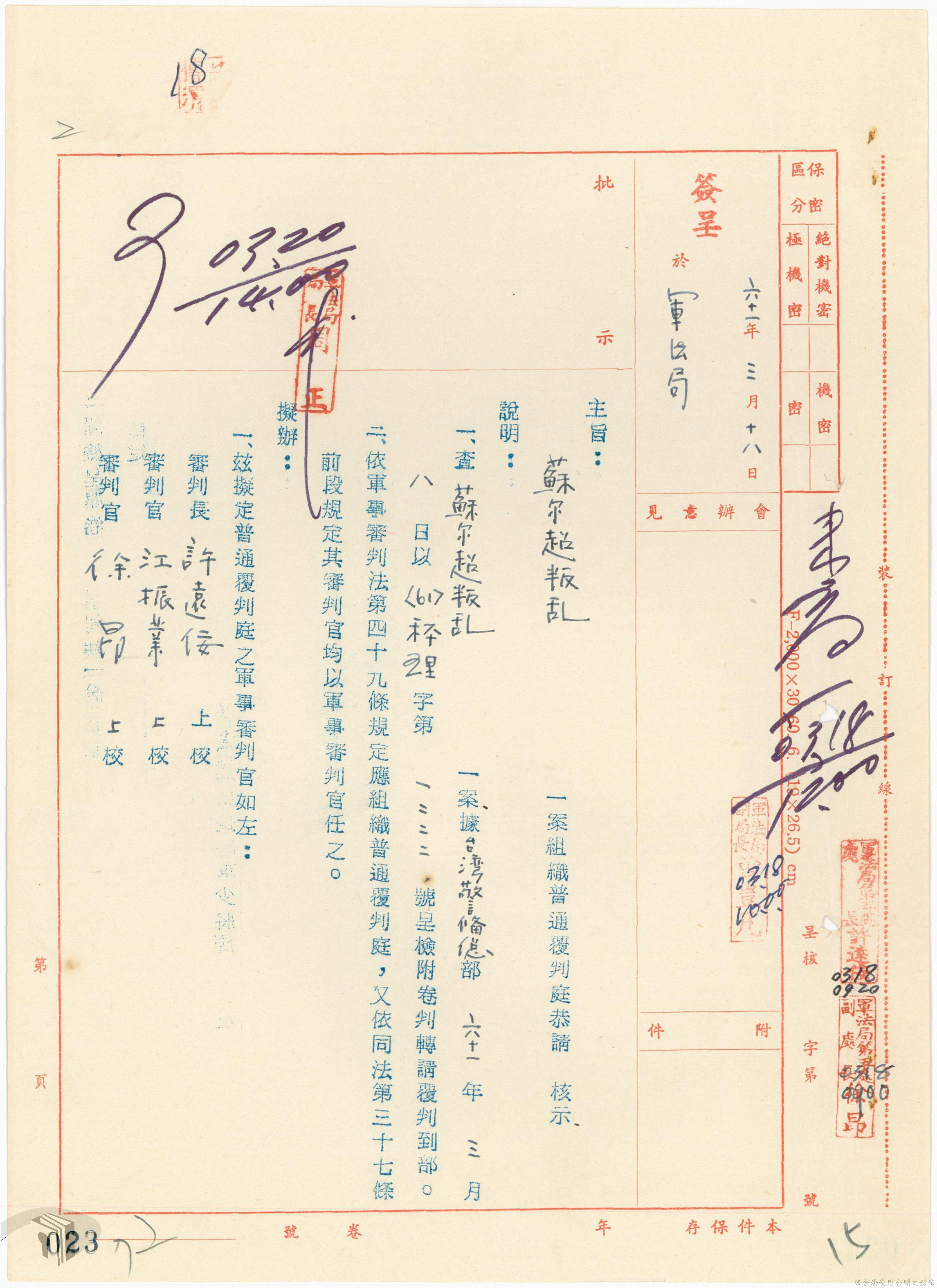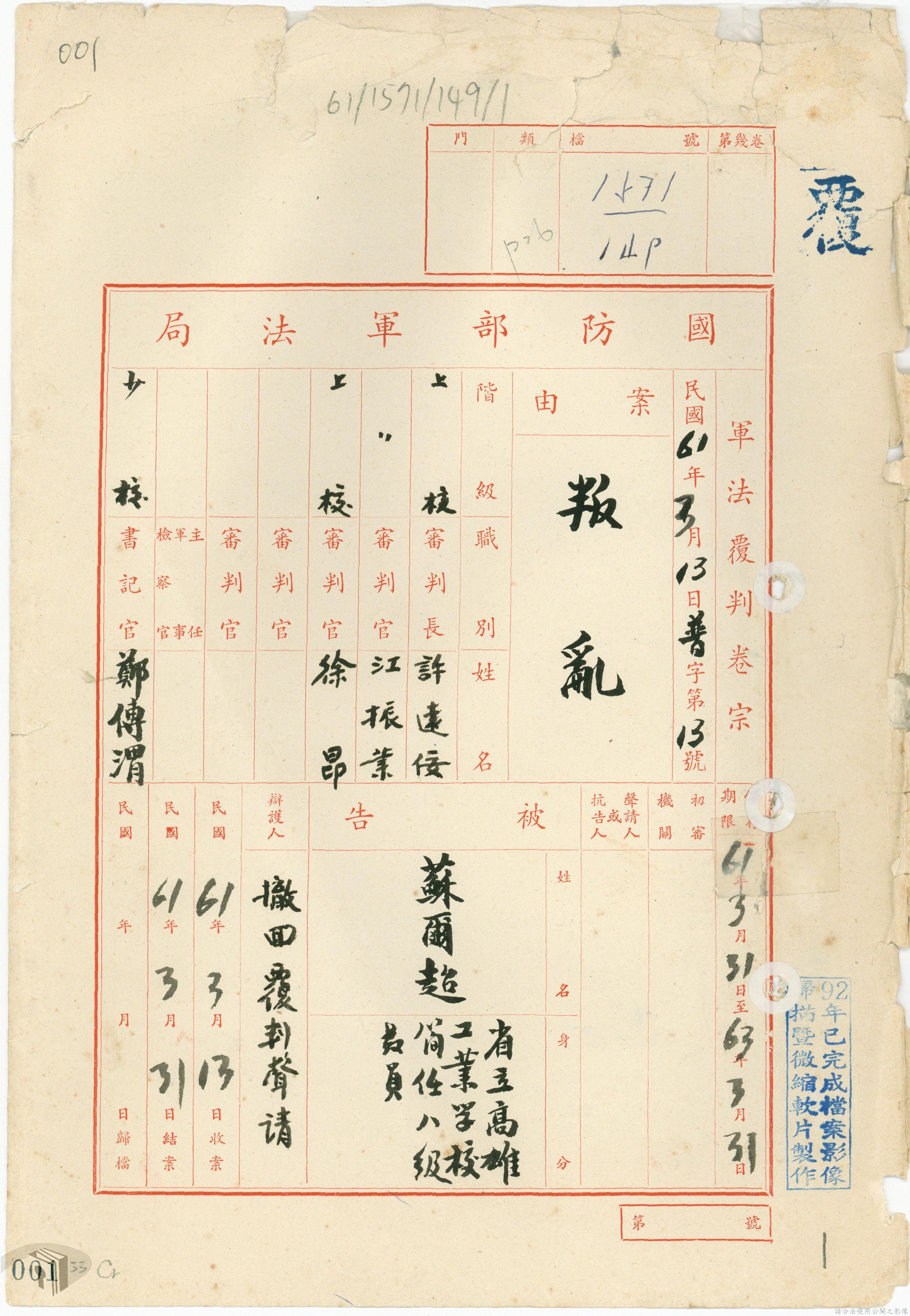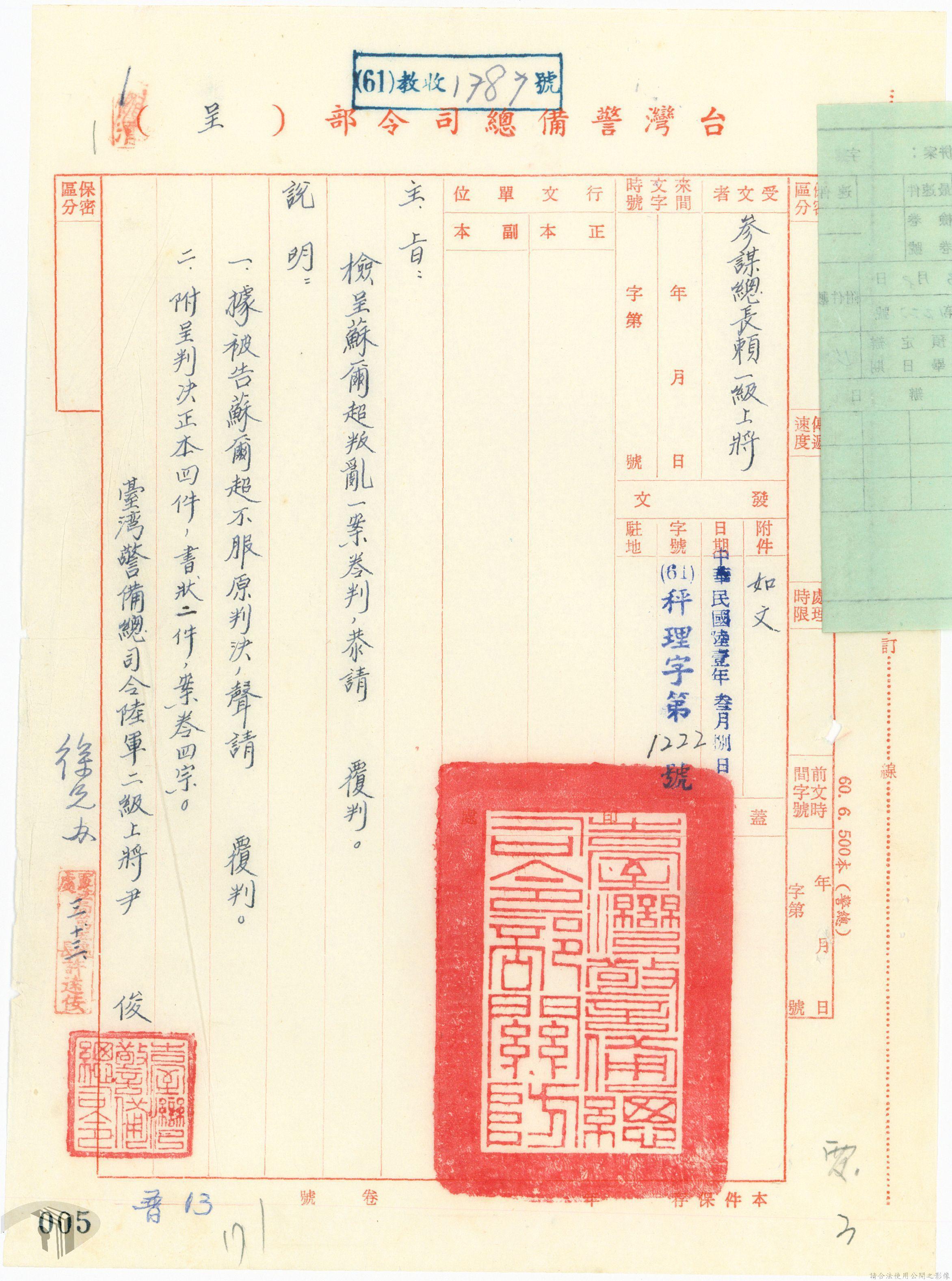 本案為61年間,省立高雄工業職業學校教員因案經臺灣警備總司令部審訊判決後,被告不服原判決而聲請覆判,臺灣警備總司令部轉陳覆判案給國防部,後被告放棄聲請覆判,經國防部覆判庭核准被告撤銷其覆判之聲請,警備總部檢陳被告撤銷聲請覆判書給國防部。附臺灣警備總司令部判決書、聲請覆判書等文件資料。